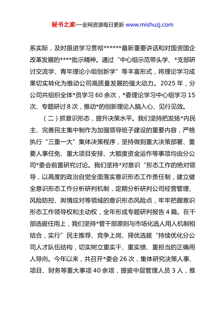 秘书之家—全网资源每日更新 www.mishuzj.com分公司 2025 年度领导班子述职报告2025 年以来,在中国*集团*委、董事会和总公司的正确领导下,*分公司领导班子坚持以**************思想为指导,紧紧围绕深入学习贯彻*的二十大和二十届三中、四中全会精神这条主线,紧扣服务集团国有资本运营公司改革发展大局,以“锐意进取、唯实惟先”的精神状态,攻坚克难,开拓创新,在资产管理、资本运营和金融服务等核心业务领域取得了显著成效。现将一年来的工作情况总结如下。一、强化 dj 引领,坚定不移讲政治(一)抓思想政治,筑牢忠诚根基。我们始终将政治建设摆在首位,进一步夯实忠诚之基,深刻领悟“两个确立”的决定性意义,坚决做到“两个维护”。班子成员带头树立“业务无小事,事事皆政治”的理念,引导全体干部员工善于从政治高度观察和处理问题,自觉在思想上政治上行动上同以***同志为核心的*中央保持高度一致。我们持续深化落实“第一议题”制度,高质量组织*委理论学习中心组学习,将深入学习贯彻*的二十大精神,特别是*的二十届四中全会关于“十五五”规划的重大部署同深入贯彻中央八项规定精神学习教育学习《***著作选读》和《***谈治国理政》第五卷等有机结合。坚持理论联秘书之家—全网资源每日更新 www.mishuzj.com系实际,及时跟进学习贯彻******最新重要讲话和对国资国企改革发展的****批示精神。通过“中心组示范带头学、*支部研讨交流学、青年理论小组创新学”等丰富形式,将理论学习成果切实转化为推动公司高质量发展的强大动力。2025 年,分公司共组织全体*员学习 60 余次,*委理论学习中心组学习 15次、专题研讨 8 次,推动*的创新理论入脑入心、见行见效。(二)抓意识形态,提升决策水平。我们坚持把发扬*内民主、完善民主集中制作为加强领导班子建设的重要内容,严格执行“三重一大”集体决策程序,坚持做到重大决策部署、重要人事任免、重大项目安排、大额度资金运作等事项均由分公司*委会前置研究讨论。我们坚持*对意识“形态工作的绝对领导,以高度的政治自觉全面落实意识形态工作责任制,建立健全意识形态工作分析研判机制,定期分析研判公司经营管理、风险防控、舆情应对等领域的意识形态风险点,牢牢把握意识形态工作领导权和主动权,全年形成专题研判报告 4 篇。在干部选拔任用上,我们坚持*管干部原则与市场化选人用人机制相结合,实行”民主推荐、竞争上岗、择优选拔“持续优化分公司人才队伍结构,切实树立重实干、重实绩、重担当的正确用人导向。今年以来,共召开*委会 26 次,集体研究决策人事、项目、财务等重大事项 40 余项,提拔中层管理人员 3 人,推秘书之家—全网资源每日更新 www.mishuzj.com行职业经理人市场化选聘 1 人。(三)抓组织建设,激发基层活力。我们认真落实*员领导干部双重组织生活”“三会一课”“主题*日、谈心谈话等基本制度,不断增强*组织生活的政治性、时代性和原则性。加强基层*组织标准化规范化建设,高质量做好发展*员工作,年内吸收预备*员 2 名,转正*员 1 名。扎实开展深入贯彻中央八项规定精神学习教育,制定专题方案,召开动员部署会,组织全体*员干部集中学习中央八项规定及其实施细则精神和集团相关制度要求。通过组织观看警示教育片、参观廉政教育基地、开展专题*课等方式,引导广大*员干部深刻领会”十年磨一剑“的重大意义,不断增强纪律意识和规矩意识,加强自我约束,始终做到忠诚干净担当。今年以来,共开展主题*日活动 12 次,班子成员讲授专题*课 4 次,召开组织生活会和民主生活会各 2次,有效提升了*组织的政治领导力、思想引领力、群众组织力和发展推动力,凝聚了班子整体合力。二、坚持服务大局,勇于担当作为(一)统筹协调,保障运营高效有序。我们立足集团国有资本运营公司”国家队“的战略定位,主动服务和融入新发展格局。积极承接集团赋予的各项战略任务,主动协调解决跨部门、跨子公司业务协同中的难点堵点问题,确保各项工作衔接秘书之家—全网资源每日更新 www.mishuzj.com有序、高效运转。2025 年,分公司深度参与了集团作为盘活存量资产扩大有效...