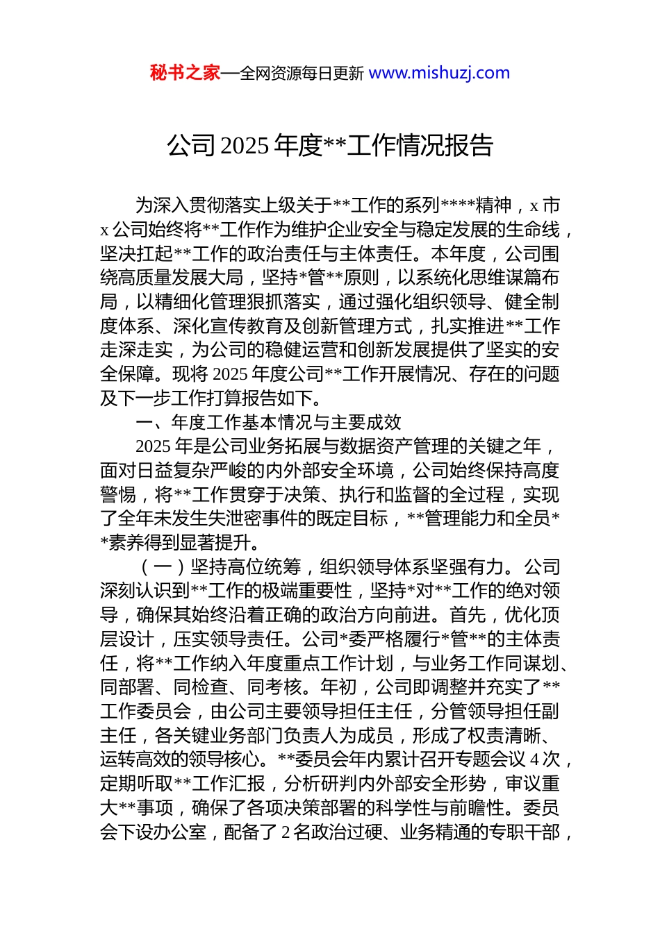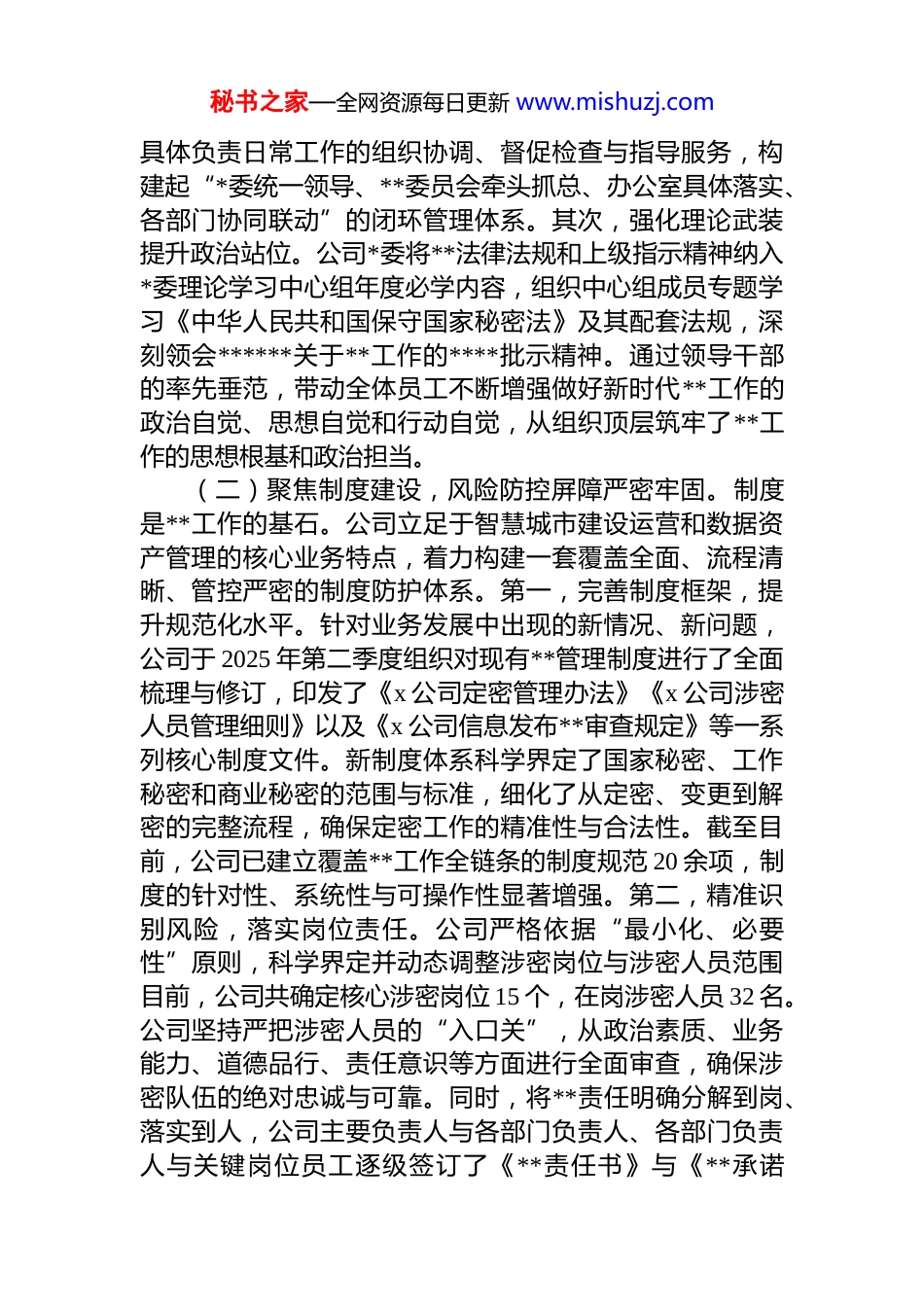 秘书之家—全网资源每日更新 www.mishuzj.com公司 2025 年度**工作情况报告为深入贯彻落实上级关于**工作的系列****精神,x 市x 公司始终将**工作作为维护企业安全与稳定发展的生命线,坚决扛起**工作的政治责任与主体责任。本年度,公司围绕高质量发展大局,坚持*管**原则,以系统化思维谋篇布局,以精细化管理狠抓落实,通过强化组织领导、健全制度体系、深化宣传教育及创新管理方式,扎实推进**工作走深走实,为公司的稳健运营和创新发展提供了坚实的安全保障。现将 2025 年度公司**工作开展情况、存在的问题及下一步工作打算报告如下。一、年度工作基本情况与主要成效2025 年是公司业务拓展与数据资产管理的关键之年,面对日益复杂严峻的内外部安全环境,公司始终保持高度警惕,将**工作贯穿于决策、执行和监督的全过程,实现了全年未发生失泄密事件的既定目标,**管理能力和全员**素养得到显著提升。(一)坚持高位统筹,组织领导体系坚强有力。公司深刻认识到**工作的极端重要性,坚持*对**工作的绝对领导,确保其始终沿着正确的政治方向前进。首先,优化顶层设计,压实领导责任。公司*委严格履行*管**的主体责任,将**工作纳入年度重点工作计划,与业务工作同谋划、同部署、同检查、同考核。年初,公司即调整并充实了**工作委员会,由公司主要领导担任主任,分管领导担任副主任,各关键业务部门负责人为成员,形成了权责清晰、运转高效的领导核心。**委员会年内累计召开专题会议 4 次,定期听取**工作汇报,分析研判内外部安全形势,审议重大**事项,确保了各项决策部署的科学性与前瞻性。委员会下设办公室,配备了 2 名政治过硬、业务精通的专职干部,秘书之家—全网资源每日更新 www.mishuzj.com具体负责日常工作的组织协调、督促检查与指导服务,构建起“*委统一领导、**委员会牵头抓总、办公室具体落实、各部门协同联动”的闭环管理体系。其次,强化理论武装提升政治站位。公司*委将**法律法规和上级指示精神纳入*委理论学习中心组年度必学内容,组织中心组成员专题学习《中华人民共和国保守国家秘密法》及其配套法规,深刻领会******关于**工作的****批示精神。通过领导干部的率先垂范,带动全体员工不断增强做好新时代**工作的政治自觉、思想自觉和行动自觉,从组织顶层筑牢了**工作的思想根基和政治担当。(二)聚焦制度建设,风险防控屏障严密牢固。制度是**工作的基石。公司立足于智慧城市建设运营和数据资产管理的核心业务特点,着力构建一套覆盖全面、流程清晰、管控严密的制度防护体系。第一,完善制度框架,提升规范化水平。针对业务发展中出现的新情况、新问题,公司于 2025 年第二季度组织对现有**管理制度进行了全面梳理与修订,印发了《x 公司定密管理办法》《x 公司涉密人员管理细则》以及《x 公司信息发布**审查规定》等一系列核心制度文件。新制度体系科学界定了国家秘密、工作秘密和商业秘密的范围与标准,细化了从定密、变更到解密的完整流程,确保定密工作的精准性与合法性。截至目前,公司已建立覆盖**工作全链条的制度规范 20 余项,制度的针对性、系统性与可操作性显著增强。第二,精准识别风险,落实岗位责任。公司严格依据“最小化、必要性”原则,科学界定并动态调整涉密岗位与涉密人员范围目前,公司共确定核心涉密岗位 15 个,在岗涉密人员 32 名。公司坚持严把涉密人员的“入口关”,从政治素质、业务能力、道德品行、责任意识等方面进行全面审查,确保涉密队伍的绝对忠诚与可靠。同时,将**责任明确分解到岗、落实到人,公司主要负责人与各部门负责人、各部门负责人与关键岗位员工逐级签订了《**责任书》与《**承诺秘书之家—全网资源每日更新 www.mishuzj.com书》,累计签订 98 份。通过这种方式,形成了一级抓一级、层层抓落实的责任闭环,有效推动了**责任由“纸面”要求转化为“岗位”行动。(三)深化宣教培训,全员**防线持续巩固。公司坚持人是**工作的第一道防线,持续创新宣传教育形式,着力培育“人人知**、时时讲**、处处防泄密”的企业安全文化。一方面,拓展宣传载体,营造浓厚氛围。公司充分利...