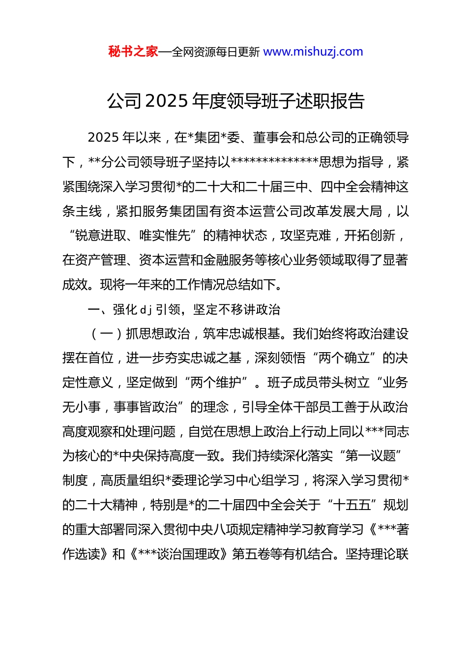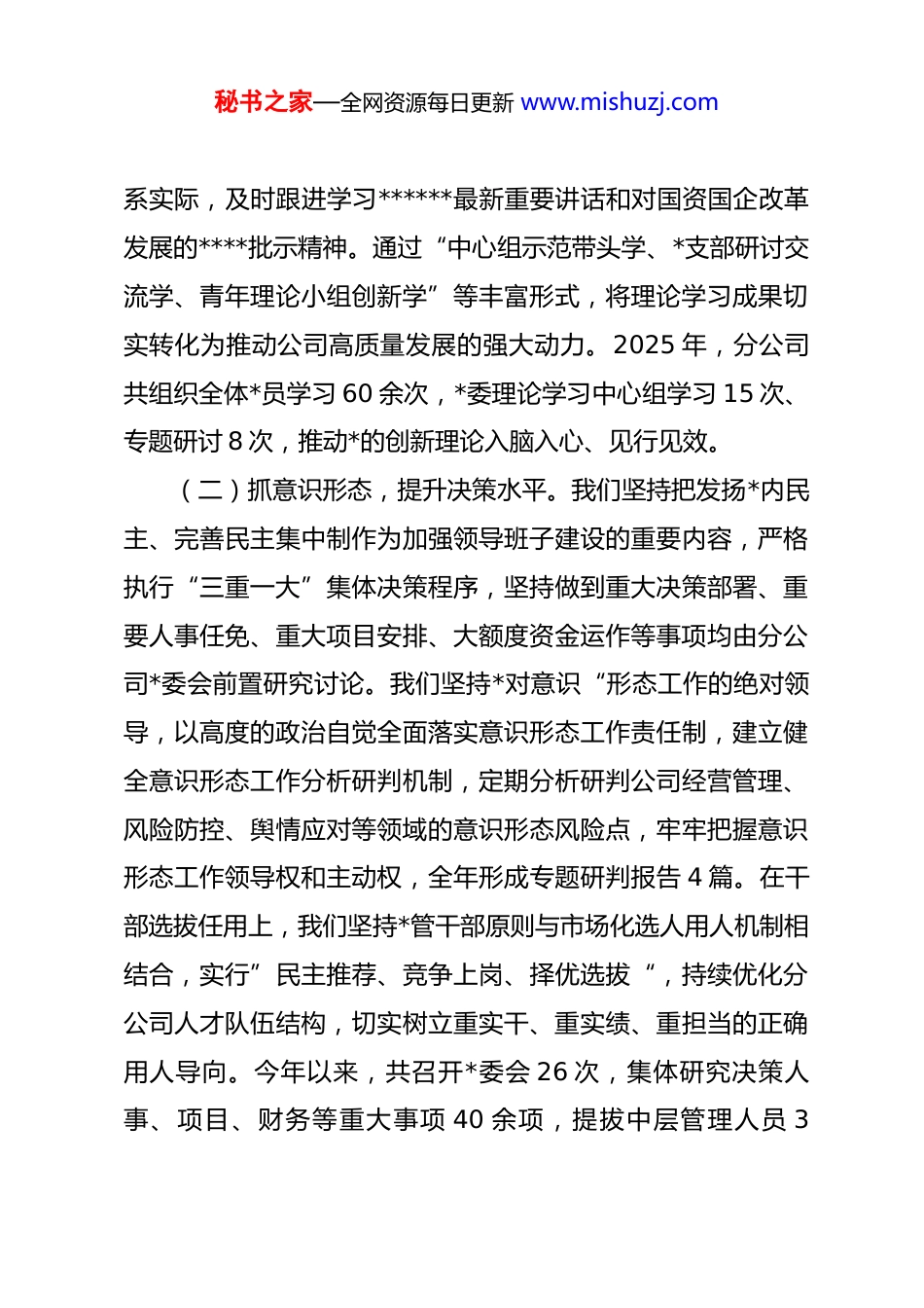 秘书之家—全网资源每日更新 www.mishuzj.com公司 2025 年度领导班子述职报告2025 年以来,在*集团*委、董事会和总公司的正确领导下,**分公司领导班子坚持以**************思想为指导,紧紧围绕深入学习贯彻*的二十大和二十届三中、四中全会精神这条主线,紧扣服务集团国有资本运营公司改革发展大局,以“锐意进取、唯实惟先”的精神状态,攻坚克难,开拓创新,在资产管理、资本运营和金融服务等核心业务领域取得了显著成效。现将一年来的工作情况总结如下。一、强化 dj 引领,坚定不移讲政治(一)抓思想政治,筑牢忠诚根基。我们始终将政治建设摆在首位,进一步夯实忠诚之基,深刻领悟“两个确立”的决定性意义,坚定做到“两个维护”。班子成员带头树立“业务无小事,事事皆政治”的理念,引导全体干部员工善于从政治高度观察和处理问题,自觉在思想上政治上行动上同以***同志为核心的*中央保持高度一致。我们持续深化落实“第一议题”制度,高质量组织*委理论学习中心组学习,将深入学习贯彻*的二十大精神,特别是*的二十届四中全会关于“十五五”规划的重大部署同深入贯彻中央八项规定精神学习教育学习《***著作选读》和《***谈治国理政》第五卷等有机结合。坚持理论联秘书之家—全网资源每日更新 www.mishuzj.com系实际,及时跟进学习******最新重要讲话和对国资国企改革发展的****批示精神。通过“中心组示范带头学、*支部研讨交流学、青年理论小组创新学”等丰富形式,将理论学习成果切实转化为推动公司高质量发展的强大动力。2025 年,分公司共组织全体*员学习 60 余次,*委理论学习中心组学习 15 次、专题研讨 8 次,推动*的创新理论入脑入心、见行见效。(二)抓意识形态,提升决策水平。我们坚持把发扬*内民主、完善民主集中制作为加强领导班子建设的重要内容,严格执行“三重一大”集体决策程序,坚持做到重大决策部署、重要人事任免、重大项目安排、大额度资金运作等事项均由分公司*委会前置研究讨论。我们坚持*对意识“形态工作的绝对领导,以高度的政治自觉全面落实意识形态工作责任制,建立健全意识形态工作分析研判机制,定期分析研判公司经营管理、风险防控、舆情应对等领域的意识形态风险点,牢牢把握意识形态工作领导权和主动权,全年形成专题研判报告 4 篇。在干部选拔任用上,我们坚持*管干部原则与市场化选人用人机制相结合,实行”民主推荐、竞争上岗、择优选拔“,持续优化分公司人才队伍结构,切实树立重实干、重实绩、重担当的正确用人导向。今年以来,共召开*委会 26 次,集体研究决策人事、项目、财务等重大事项 40 余项,提拔中层管理人员 3秘书之家—全网资源每日更新 www.mishuzj.com人,推行职业经理人市场化选聘 1 人。(三)抓组织建设,激发基层活力。我们认真落实*员领导干部双重组织生活、”三会一课“、主题*日、谈心谈话等基本制度,不断增强*组织生活的政治性、时代性和原则性。加强基层*组织标准化规范化建设,高质量做好发展*员工作,年内吸收预备*员 2 名,转正*员 1 名。扎实开展深入贯彻学习教育,制定专题方案,召开动员部署会,组织全体*员干部集中学习中央八项规定及其实施细则精神和集团相关制度要求。通过组织观看警示教育片、参观廉政教育基地、开展专题*课等方式,引导广大*员干部深刻领会”十年磨一剑“的重大意义,不断增强纪律意识和规矩意识,加强自我约束,始终做到忠诚干净担当。今年以来,共开展主题*日活动 12 次,班子成员讲授专题*课 4 次,召开组织生活会和民主生活会各 2 次,有效提升了*组织的政治领导力、思想引领力、群众组织力和发展推动力,凝聚了班子整体合力。二、坚持服务大局,勇于担当作为(一)统筹协调,保障运营高效有序。我们立足集团国有资本运营公司”国家队“的战略定位,主动服务和融入新发展格局。积极承接集团赋予的各项战略任务,主动协调解决跨部门、跨子公司业务协同中的难点堵点问题,确保各项工作衔接秘书之家—全网资源每日更新 www.mishuzj.com有序、高效运转。2025 年,分公司深度参与了集团作为盘活存量资产扩大有效投资支撑机构的相关工作...