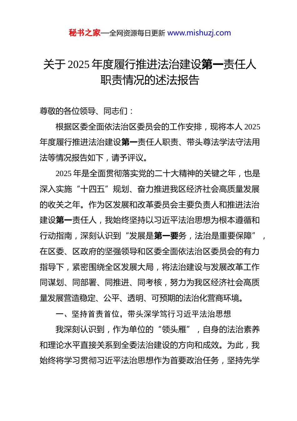 秘书之家—全网资源每日更新 www.mishuzj.com关于 2025 年度履行推进法治建设第一责任人职责情况的述法报告 尊敬的各位领导、同志们:根据区委全面依法治区委员会的工作安排,现将本人 2025年度履行推进法治建设第一责任人职责、带头尊法学法守法用法等情况报告如下,请予评议。2025 年是全面贯彻落实党的二十大精神的关键之年,也是深入实施“十四五”规划、奋力推进我区经济社会高质量发展的收关之年。作为区发展和改革委员会主要负责人和推进法治建设第一责任人,我始终坚持以习近平法治思想为根本遵循和行动指南,深刻认识到“发展是第一要务,法治是重要保障”,在区委、区政府的坚强领导和区委全面依法治区委员会的有力指导下,紧密围绕全区发展大局,将法治建设与发展改革工作同谋划、同部署、同推进、同考核,努力为我区经济社会高质量发展营造稳定、公平、透明、可预期的法治化营商环境。一、坚持首责首位,带头深学笃行习近平法治思想我深刻认识到,作为单位的“领头雁”,自身的法治素养和理论水平直接关系到全委法治建设的方向和成效。为此,我始终将学习贯彻习近平法治思想作为首要政治任务,坚持先学秘书之家—全网资源每日更新 www.mishuzj.com一步、深学一层,努力做到内化于心、外化于行。一是坚持以上率下,确保理论学习“入脑入心”。我始终牢记第一责任人职责,带头学习习近平总书记关于法治建设的重要论述、重要指示批示精神,特别是总书记在中央全面依法治国工作会议上的重要讲话精神。全年主持召开党组理论学习中心组(扩大)学习会议 12 次,其中专题学法 6 次,并将习近平法治思想的核心要义列为“第一议题”,确保党组会前必学法、议事必用法、决策必依法。在个人自学方面,我系统研读了《习近平法治思想学习纲要》等权威读本,撰写学习心得 3篇,力求吃透精神实质、把握核心要义。通过以上率下的学习,引导全委干部职工不断增强“四个意识”、坚定“四个自信”、做到“两个维护”,切实把思想和行动统一到党中央关于全面依法治国的决策部署上来。二是聚焦主责主业,推动理论学习“见行见效”。我强调学习不能停留在书本和口头,必须与发改工作实践紧密结合。在制定《XX 区 2025 年国民经济和社会发展计划》、审核“XX新区基础设施建设”等重大项目、研究出台《关于进一步优化我区营商环境的若干措施》等重要政策时,我都会组织党组成员和相关科室重温习近平法治思想中关于高质量发展、市场经济、政府与市场关系等重要论述,从中找遵循、找方法、找路秘书之家—全网资源每日更新 www.mishuzj.com径。这种“带着问题学、结合工作用”的方式,有效提升了运用法治思维和法治方式深化改革、推动发展、化解矛盾、维护稳定的能力,确保了发改工作的每一个环节都在法治轨道上运行。二、强化政治担当,全面贯彻落实中央及自治区决策部署作为区委、区政府的参谋助手,区发改委在贯彻落实上级关于全面依法治国的重大决策部署中承担着重要责任。我始终胸怀“国之大者”,确保中央及自治区党委的政令在我委不折不扣地得到执行。一是坚决对标对表,确保政令畅通。认真贯彻落实《法治中国建设规划》和自治区“八五”普法规划要求,结合我区实际,牵头制定了《XX 区发改委 2025 年法治政府建设工作要点和普法责任清单》。该清单明确了 6 大类 22 项具体任务,将法治建设目标分解到岗、责任到人,形成了一级抓一级、层层抓落实的工作格局。一年来,我委制定的所有规范性文件均严格履行公众参与、专家论证、风险评估、合法性审查和集体讨论决定的法定程序,确保了上级决策部署在发展改革领域落地生根。二是服务中心大局,彰显法治作为。紧紧围绕区委区政府中心工作,在推进“XX 高新技术产业园”建设、协调“XX 区秘书之家—全网资源每日更新 www.mishuzj.com域一体化协同发展”等重大战略中,我坚持法治先行,主动对接司法、自然资源、生态环境等部门,确保项目规划、土地征用、环境评价等环节完全依法合规。尤其在优化营商环境方面,我们牵头落实《优化营商环境条例》,废止和修改了 3 项与现行法律法规不符的内部管理规定,并依托“信用 ...