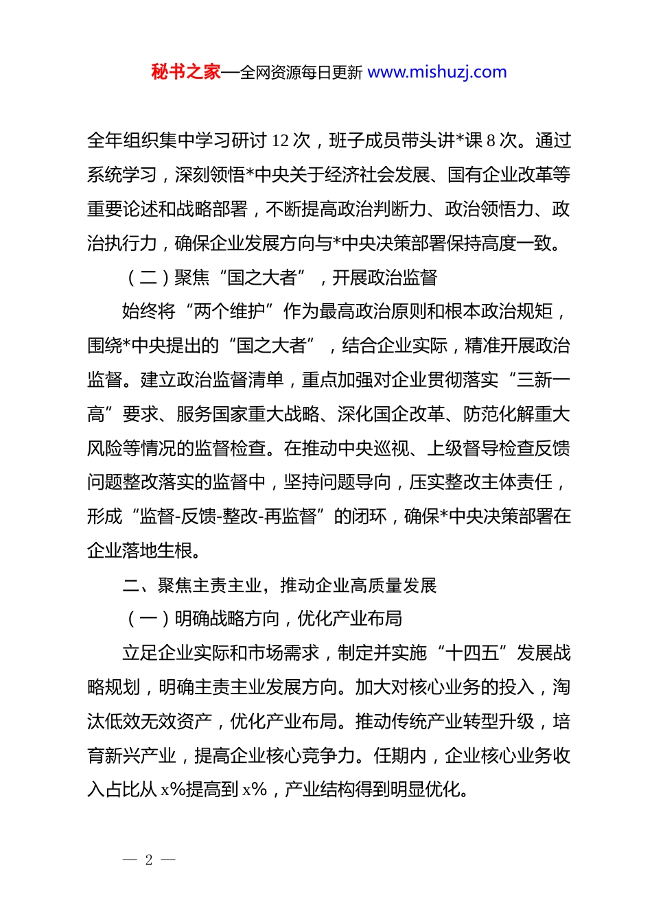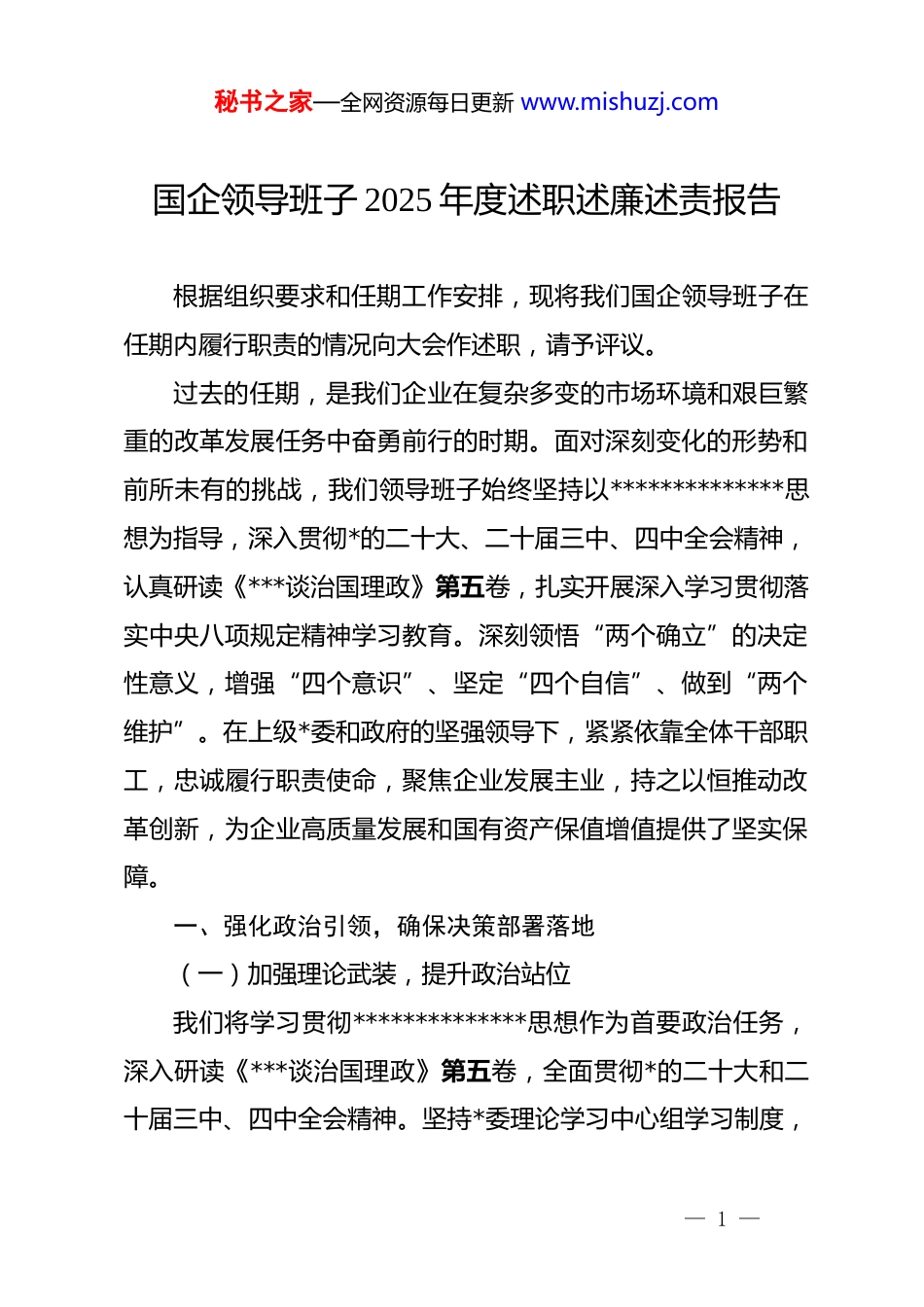 秘书之家—全网资源每日更新 www.mishuzj.com国企领导班子 2025 年度述职述廉述责报告根据组织要求和任期工作安排,现将我们国企领导班子在任期内履行职责的情况向大会作述职,请予评议。过去的任期,是我们企业在复杂多变的市场环境和艰巨繁重的改革发展任务中奋勇前行的时期。面对深刻变化的形势和前所未有的挑战,我们领导班子始终坚持以**************思想为指导,深入贯彻*的二十大、二十届三中、四中全会精神,认真研读《***谈治国理政》第五卷,扎实开展深入学习贯彻落实中央八项规定精神学习教育。深刻领悟“两个确立”的决定性意义,增强“四个意识”、坚定“四个自信”、做到“两个维护”。在上级*委和政府的坚强领导下,紧紧依靠全体干部职工,忠诚履行职责使命,聚焦企业发展主业,持之以恒推动改革创新,为企业高质量发展和国有资产保值增值提供了坚实保障。一、强化政治引领,确保决策部署落地(一)加强理论武装,提升政治站位我们将学习贯彻**************思想作为首要政治任务,深入研读《***谈治国理政》第五卷,全面贯彻*的二十大和二十届三中、四中全会精神。坚持*委理论学习中心组学习制度,— 1 —秘书之家—全网资源每日更新 www.mishuzj.com全年组织集中学习研讨 12 次,班子成员带头讲*课 8 次。通过系统学习,深刻领悟*中央关于经济社会发展、国有企业改革等重要论述和战略部署,不断提高政治判断力、政治领悟力、政治执行力,确保企业发展方向与*中央决策部署保持高度一致。(二)聚焦“国之大者”,开展政治监督始终将“两个维护”作为最高政治原则和根本政治规矩,围绕*中央提出的“国之大者”,结合企业实际,精准开展政治监督。建立政治监督清单,重点加强对企业贯彻落实“三新一高”要求、服务国家重大战略、深化国企改革、防范化解重大风险等情况的监督检查。在推动中央巡视、上级督导检查反馈问题整改落实的监督中,坚持问题导向,压实整改主体责任,形成“监督-反馈-整改-再监督”的闭环,确保*中央决策部署在企业落地生根。二、聚焦主责主业,推动企业高质量发展(一)明确战略方向,优化产业布局立足企业实际和市场需求,制定并实施“十四五”发展战略规划,明确主责主业发展方向。加大对核心业务的投入,淘汰低效无效资产,优化产业布局。推动传统产业转型升级,培育新兴产业,提高企业核心竞争力。任期内,企业核心业务收入占比从 x%提高到 x%,产业结构得到明显优化。— 2 —秘书之家—全网资源每日更新 www.mishuzj.com(二)强化创新驱动,提升发展动能高度重视科技创新,加大研发投入,任期内研发投入年均增长 x%。建立产学研合作机制,与高校、科研院所合作开展技术攻关,取得多项关键技术突破。推动数字化转型,建设智能化工厂和数字化管理平台,提高生产效率和管理水平。通过创新驱动,企业新产品销售收入占比从 x%提高到 x%,发展动能显著增强。(三)加强市场拓展,提高市场份额积极拓展市场,加强市场营销和品牌建设。加大国内市场开拓力度,巩固现有市场份额,拓展新兴市场。同时,积极实施“走出去”战略,参与国际市场竞争。任期内,企业国内市场销售额年均增长 x%,国际市场销售额占比从 x%提高到 x%。三、深化改革创新,激发企业活力(一)推进国企改革,完善体制机制。深入推进国企改革三年行动,完善公司治理结构,建立健全现代企业制度。落实董事会职权,加强董事会建设,提高决策科学性和有效性。推进经理层任期制和契约化管理,激发经理层干事创业积极性。任期内,企业改革任务完成率达到 100%,体制机制更加完善。(二)创新管理模式,提高运营效率。引入先进管理理念— 3 —秘书之家—全网资源每日更新 www.mishuzj.com和方法,创新管理模式。推进全面预算管理,加强成本控制,提高资源配置效率。建立绩效考核体系,将考核结果与薪酬、晋升挂钩,激励干部职工积极工作。通过创新管理模式,企业运营成本降低 x%,劳动生产率提高 x%。(三)加强人才培养,打造高素质团队。坚持*管干部、*管人才原则,加强干部人才队伍建设。制定人才发展规划,加大人才引进和培养力度。建立人才激励机制,...