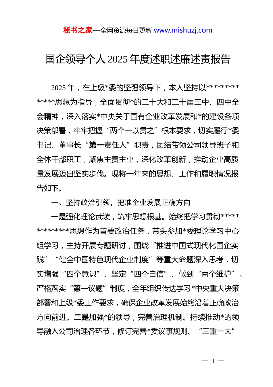 秘书之家—全网资源每日更新 www.mishuzj.com国企领导个人 2025 年度述职述廉述责报告2025 年,在上级*委的坚强领导下,本人坚持以**************思想为指导,全面贯彻*的二十大和二十届三中、四中全会精神,深入落实*中央关于国有企业改革发展和*的建设各项决策部署,牢牢把握“两个一以贯之”根本要求,切实履行*委书记、董事长“第一责任人”职责,团结带领公司领导班子和全体干部职工,聚焦主责主业,深化改革创新,推动企业高质量发展迈出坚实步伐。现将一年来的思想、工作和履职情况报告如下。一、坚持政治引领,把准企业发展正确方向一是强化理论武装,筑牢思想根基。始终把学习贯彻**************思想作为首要政治任务,带头参加*委理论学习中心组学习,主持开展专题研讨,围绕“推进中国式现代化国企实践”“健全中国特色现代企业制度”等重大命题深入思考,切实增强“四个意识”、坚定“四个自信”、做到“两个维护”。严格落实“第一议题”制度,全年组织传达学习*中央重大决策部署和上级*委工作要求,确保企业改革发展始终沿着正确政治方向前进。二是加强*的领导,完善治理机制。持续推动*的领导融入公司治理各环节,修订完善*委议事规则、“三重一大”— 1 —秘书之家—全网资源每日更新 www.mishuzj.com决策制度实施细则,明确*委会前置研究讨论事项清单,全年主持召开*委会,研究决定重大事项,有效发挥*委把方向、管大局、保落实作用。三是压实 dj 责任,夯实基层基础。认真履行全面从严治*主体责任,制定年度 dj 工作要点,与所属单位签订 dj 目标责任书,开展*组织书记抓基层 dj 述职评议考核全覆盖。扎实推进*支部标准化规范化建设,打造示范*支部,新发展*员,基层*组织政治功能和组织功能显著增强。二、聚焦主责主业,推动企业高质量发展取得新成效一是稳增长提质效,经营业绩稳步提升。面对复杂多变的市场环境,坚持稳中求进工作总基调,科学研判形势,优化经营策略,资产负债率控制在合理区间,主要经济指标均优于行业平均水平。重点项目扎实推进,多个战略性项目按期投产达效。二是强改革激活力,治理效能持续释放。纵深推进国企改革深化提升行动,聚焦“三个明显成效”目标。深化三项制度改革,经理层成员任期制和契约化管理实现全覆盖。积极推进混合所有制改革,引入优质战略投资者,资本运作能力不断增强。三是促创新谋长远,转型升级步伐加快。加大科技研发投入。加快数字化转型,启动智慧工厂、智能物流平台建设。推动绿色低碳发展,获评“省级绿色制造示范企业”。三、坚持底线思维,防范化解重大风险— 2 —秘书之家—全网资源每日更新 www.mishuzj.com一是严控经营风险。健全全面风险管理体系,建立重大风险动态监测预警机制,对债务、投资、金融业务等领域开展专项排查整治,全年未发生重大经营风险事件。加强合规管理,完善内控制度体系,全部实现闭环管理。二是守牢安全底线。严格落实安全生产责任制,带头落实“*政同责、‘一岗双责’”,推动实施安全隐患整改项目 136 项,全年未发生较大及以上安全生产事故。三是维护稳定大局。高度重视信访维稳工作,畅通职工诉求渠道,职工队伍保持总体稳定。积极履行社会责任,在乡村振兴、应急救灾、公益慈善等方面累计投入资金超千万元,树立了良好企业形象。四、从严修身律己,永葆清正廉洁政治本色一是带头落实*风廉政建设责任制。坚决扛起全面从严治*第一责任人责任,定期研究部署*风廉政建设和反腐败工作,支持纪委依规依纪依法履职。组织开展警示教育活动,讲授廉政*课,推动廉洁文化进班子、进项目、进家庭。二是严格执行中央八项规定精神。带头反对形式主义、官僚主义,精简会议文件,改进调研作风。严控“三公”经费支出,同比下降 8.2%。自觉接受组织和群众监督,如实报告个人有关事项。三是注重家风建设。严格约束亲属和身边工作人员,坚决反对特权思想和特权现象,始终保持清正廉洁的政治本色。— 3 —秘书之家—全网资源每日更新 www.mishuzj.com在总结成绩的同时,也清醒认识到工作中还存在一些短板和不足:一是理论学习的系统性和转化力有待进一步提升,运用*的...