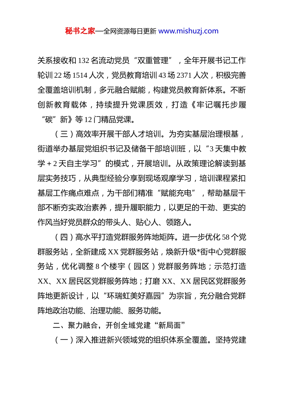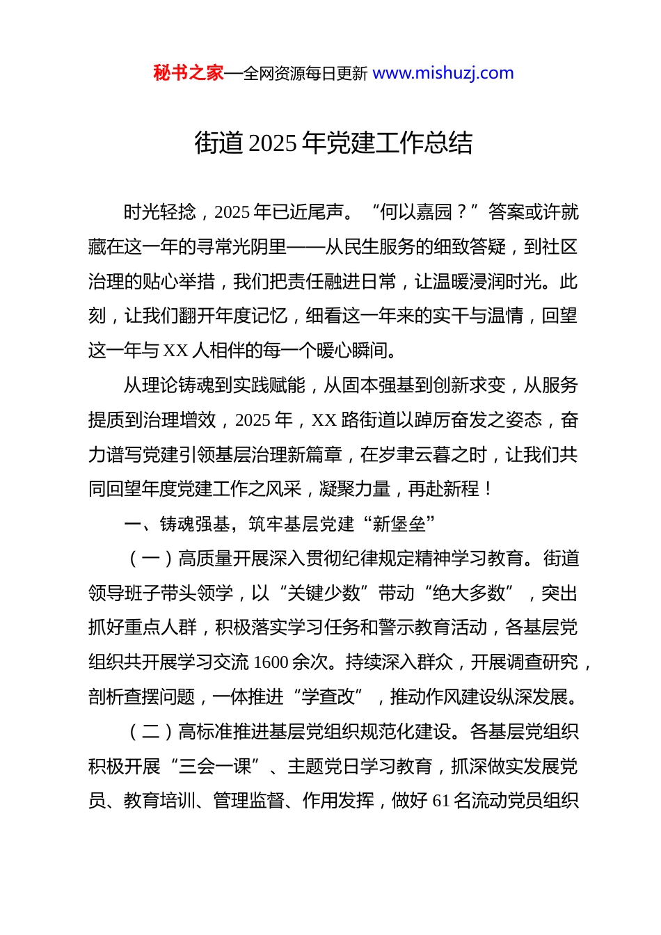 秘书之家—全网资源每日更新 www.mishuzj.com街道 2025 年党建工作总结 时光轻捻,2025 年已近尾声。“何以嘉园?”答案或许就藏在这一年的寻常光阴里——从民生服务的细致答疑,到社区治理的贴心举措,我们把责任融进日常,让温暖浸润时光。此刻,让我们翻开年度记忆,细看这一年来的实干与温情,回望这一年与 XX 人相伴的每一个暖心瞬间。从理论铸魂到实践赋能,从固本强基到创新求变,从服务提质到治理增效,2025 年,XX 路街道以踔厉奋发之姿态,奋力谱写党建引领基层治理新篇章,在岁聿云暮之时,让我们共同回望年度党建工作之风采,凝聚力量,再赴新程!一、铸魂强基,筑牢基层党建“新堡垒”(一)高质量开展深入贯彻纪律规定精神学习教育。街道领导班子带头领学,以“关键少数”带动“绝大多数”,突出抓好重点人群,积极落实学习任务和警示教育活动,各基层党组织共开展学习交流 1600 余次。持续深入群众,开展调查研究,剖析查摆问题,一体推进“学查改”,推动作风建设纵深发展。(二)高标准推进基层党组织规范化建设。各基层党组织积极开展“三会一课”、主题党日学习教育,抓深做实发展党员、教育培训、管理监督、作用发挥,做好 61 名流动党员组织秘书之家—全网资源每日更新 www.mishuzj.com关系接收和 132 名流动党员“双重管理”,全年开展书记工作轮训 22 场 1514 人次,党员教育培训 43 场 2371 人次,积极完善全覆盖培训机制,多元融合赋能,构建党员教育新体系。不断创新教育载体,持续提升党课质效,打造《牢记嘱托步履“碳”新》等 12 门精品党课。(三)高效率开展干部人才培训。为夯实基层治理根基,街道举办基层党组织书记及储备干部培训班,以“3 天集中教学+2 天自主学习”的模式,开展培训。从政策理论解读到基层实务技巧,从典型经验分享到现场观摩学习,培训课程紧扣基层工作痛点难点,为干部们精准“赋能充电”,帮助基层干部不断夯实政治素养,提升履职能力,以更足的干劲、更实的作风当好党员群众的带头人、贴心人、领路人。(四)高水平打造党群服务阵地矩阵。进一步优化 58 个党群服务站,全新建成 XX 党群服务站,焕新升级*街中心党群服务站,优化调整 8 个楼宇(园区)党群服务阵地;示范打造XX、XX 居民区党群服务阵地;打磨 XX、XX 居民区党群服务阵地更新设计,以“环瑞虹美好嘉园”为宗旨,充分融合党群阵地政治功能、治理功能、服务功能。二、聚力融合,开创全域党建“新局面”(一)深入推进新兴领域党的组织体系全覆盖。坚持党建秘书之家—全网资源每日更新 www.mishuzj.com联“新”、服务暖“新”、治理融“新”,探索一体优化楼宇园区党组织建设,持续深化新兴领域党建工作。发布《XX 路街道新兴领域党的组织体系全覆盖一周年回顾》白皮书,总结回顾明思路,凝心聚力再出发。以“大数据+铁脚板”对 1291家楼宇园区市场主体开展走访,实现底数排摸全面透底。推动丝芭等 10 家非公企业、2 家社会组织单独建立党支部,设置 8个区域性党支部,实现对楼宇、园区、商圈的组织体系全覆盖。组织开展“同上一堂党课”、“嘉话·书记讲给书记听”微论坛等活动,特邀老干部、老书记开展结对带教,助力新兴领域党组织书记提升工作能力。(二)持续加码新兴领域幸福圈。街区党支部始终坚持党建引领,精准对接需求,积极整合资源,通过策划活动、认领“微心愿”、夏日送清凉等系列暖心举措,为新就业群体、沿街商户送去关怀与支持,凝聚街区共建合力。楼宇党支部通过亮身份、亮联系方式、亮服务项目、提供必要帮助、解决实际问题,让企业和员工感受到“组织的关怀”;开展“午间一小时”、健康“嘉”加油站、公益课程、楼宇运动会和各类主题展板巡展等服务与项目,打造更具温度、更富活力的楼宇党建品牌。联动街区、商圈、楼宇、园区,举办“早七辰光”“夜饭时光”等各类市集活动,营造共建共治共享的基层治理新格秘书之家—全网资源每日更新 www.mishuzj.com局。联合 XX 海事局,开展“潮涌浦江向海向未来”联合主题党日活动;将 XX 医院、公积金中心等资源引入楼宇园区,组织各区域化单...