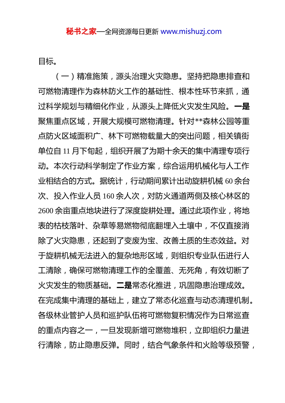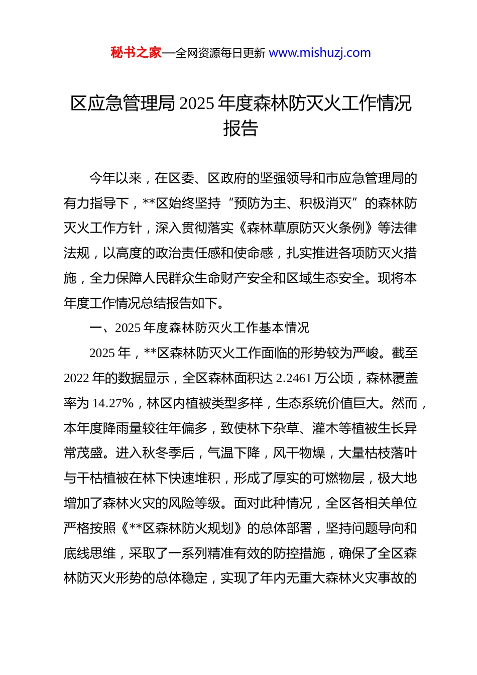 秘书之家—全网资源每日更新 www.mishuzj.com区应急管理局 2025 年度森林防灭火工作情况报告 今年以来,在区委、区政府的坚强领导和市应急管理局的有力指导下,**区始终坚持“预防为主、积极消灭”的森林防灭火工作方针,深入贯彻落实《森林草原防灭火条例》等法律法规,以高度的政治责任感和使命感,扎实推进各项防灭火措施,全力保障人民群众生命财产安全和区域生态安全。现将本年度工作情况总结报告如下。一、2025 年度森林防灭火工作基本情况2025 年,**区森林防灭火工作面临的形势较为严峻。截至2022 年的数据显示,全区森林面积达 2.2461 万公顷,森林覆盖率为 14.27%,林区内植被类型多样,生态系统价值巨大。然而,本年度降雨量较往年偏多,致使林下杂草、灌木等植被生长异常茂盛。进入秋冬季后,气温下降,风干物燥,大量枯枝落叶与干枯植被在林下快速堆积,形成了厚实的可燃物层,极大地增加了森林火灾的风险等级。面对此种情况,全区各相关单位严格按照《**区森林防火规划》的总体部署,坚持问题导向和底线思维,采取了一系列精准有效的防控措施,确保了全区森林防灭火形势的总体稳定,实现了年内无重大森林火灾事故的秘书之家—全网资源每日更新 www.mishuzj.com目标。(一)精准施策,源头治理火灾隐患。坚持把隐患排查和可燃物清理作为森林防火工作的基础性、根本性环节来抓,通过科学规划与精细化作业,从源头上降低火灾发生风险。一是聚焦重点区域,开展大规模可燃物清理。针对**森林公园等重点防火区域面积广、林下可燃物载量大的突出问题,相关镇街单位自 11 月下旬起,组织开展了为期十余天的集中清理专项行动。本次行动科学制定了作业方案,综合运用机械化与人工作业相结合的方式。据统计,行动期间累计出动旋耕机械 60 余台次、投入作业人员 160 余人次,对防火通道两侧及核心林区的2600 余亩重点地块进行了深度旋耕处理。通过此项作业,将地表的枯枝落叶、杂草等易燃物彻底翻埋入土壤中,不仅直接消除了火灾隐患,还起到了变废为宝、改善土质的生态效益。对于旋耕机械无法进入的复杂地形区域,则组织专业队伍进行人工清除,确保可燃物清理工作的全覆盖、无死角,有效切断了火灾发生的物质基础。二是常态化推进,巩固隐患治理成效。在完成集中清理的基础上,建立了常态化巡查与动态清理机制。各级林业管护人员和巡护队伍将可燃物复积情况作为日常巡查的重点内容之一,一旦发现新增可燃物堆积,立即组织力量进行清除,防止隐患反弹。同时,结合气象条件和火险等级预警,秘书之家—全网资源每日更新 www.mishuzj.com动态调整清理工作的重点和频次,确保在关键时期、关键区域的火灾隐患始终处于可控状态。(二)立体防控,构建全天候监测预警体系。深刻认识到“打早、打小、打了”是扑救森林火灾的关键,本年度,**区着力构建了“人防+技防”深度融合的立体化监测预警网络,显著提升了对林区火情的早期发现和快速反应能力。在人防层面,建立了覆盖全区的网格化巡护责任体系。全区共配备了224 名森林防火及巡护兼职人员,他们分片包干,深入林区一线。特别是在**森林公园等高风险区域,每日固定安排 3 辆巡查车、15 名专业巡查人员,进行不间断、拉网式巡逻检查。巡查重点包括排查违规野外用火、祭祀用火等行为,监测林下可燃物的动态变化,以及检查防火设施的完好情况,确保人力巡防的广度与深度。在技防层面,充分利用现代科技手段赋能森林防火。依托部署在林区制高点的视频监控系统、卫星遥感林火监测平台以及无人机空中巡查等先进技术,构建了一个全天候、全覆盖、无盲区的智能化监测网络。高点监控系统能够对林区进行 7×24 小时不间断视频监控,一旦出现烟点、火点,系统将自动识别并发出警报;卫星遥感监测则能从宏观层面捕捉热点异常,为早期预警提供决策依据;无人机航拍巡查凭借其机动灵活的优势,可对重点区域进行高精度、近距离的侦查,秘书之家—全网资源每日更新 www.mishuzj.com有效弥补了地面巡护和固定监控的不足。这一“空天地”一体化的监测体系,实现了对火灾隐患的实时发现、精准定位与智能预警,为后续的应急处...