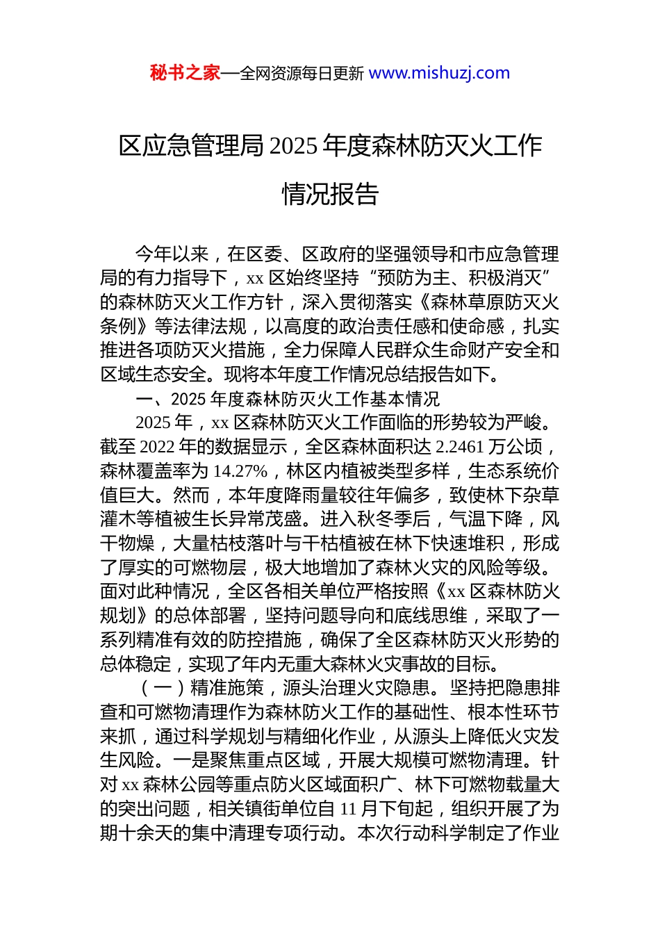 秘书之家—全网资源每日更新 www.mishuzj.com区应急管理局 2025 年度森林防灭火工作情况报告今年以来,在区委、区政府的坚强领导和市应急管理局的有力指导下,xx 区始终坚持“预防为主、积极消灭”的森林防灭火工作方针,深入贯彻落实《森林草原防灭火条例》等法律法规,以高度的政治责任感和使命感,扎实推进各项防灭火措施,全力保障人民群众生命财产安全和区域生态安全。现将本年度工作情况总结报告如下。一、2025 年度森林防灭火工作基本情况2025 年,xx 区森林防灭火工作面临的形势较为严峻。截至 2022 年的数据显示,全区森林面积达 2.2461 万公顷,森林覆盖率为 14.27%,林区内植被类型多样,生态系统价值巨大。然而,本年度降雨量较往年偏多,致使林下杂草灌木等植被生长异常茂盛。进入秋冬季后,气温下降,风干物燥,大量枯枝落叶与干枯植被在林下快速堆积,形成了厚实的可燃物层,极大地增加了森林火灾的风险等级。面对此种情况,全区各相关单位严格按照《xx 区森林防火规划》的总体部署,坚持问题导向和底线思维,采取了一系列精准有效的防控措施,确保了全区森林防灭火形势的总体稳定,实现了年内无重大森林火灾事故的目标。(一)精准施策,源头治理火灾隐患。坚持把隐患排查和可燃物清理作为森林防火工作的基础性、根本性环节来抓,通过科学规划与精细化作业,从源头上降低火灾发生风险。一是聚焦重点区域,开展大规模可燃物清理。针对 xx 森林公园等重点防火区域面积广、林下可燃物载量大的突出问题,相关镇街单位自 11 月下旬起,组织开展了为期十余天的集中清理专项行动。本次行动科学制定了作业秘书之家—全网资源每日更新 www.mishuzj.com方案,综合运用机械化与人工作业相结合的方式。据统计行动期间累计出动旋耕机械 60 余台次、投入作业人员 160余人次,对防火通道两侧及核心林区的 2600 余亩重点地块进行了深度旋耕处理。通过此项作业,将地表的枯枝落叶杂草等易燃物彻底翻埋入土壤中,不仅直接消除了火灾隐患,还起到了变废为宝、改善土质的生态效益。对于旋耕机械无法进入的复杂地形区域,则组织专业队伍进行人工清除,确保可燃物清理工作的全覆盖、无死角,有效切断了火灾发生的物质基础。二是常态化推进,巩固隐患治理成效。在完成集中清理的基础上,建立了常态化巡查与动态清理机制。各级林业管护人员和巡护队伍将可燃物复积情况作为日常巡查的重点内容之一,一旦发现新增可燃物堆积,立即组织力量进行清除,防止隐患反弹。同时,结合气象条件和火险等级预警,动态调整清理工作的重点和频次,确保在关键时期、关键区域的火灾隐患始终处于可控状态。(二)立体防控,构建全天候监测预警体系。深刻认识到“打早、打小、打了”是扑救森林火灾的关键,本年度,xx 区着力构建了“人防+技防”深度融合的立体化监测预警网络,显著提升了对林区火情的早期发现和快速反应能力。在人防层面,建立了覆盖全区的网格化巡护责任体系。全区共配备了 224 名森林防火及巡护兼职人员,他们分片包干,深入林区一线。特别是在 xx 森林公园等高风险区域,每日固定安排 3 辆巡查车、15 名专业巡查人员,进行不间断、拉网式巡逻检查。巡查重点包括排查违规野外用火、祭祀用火等行为,监测林下可燃物的动态变化,以及检查防火设施的完好情况,确保人力巡防的广度与深度。在技防层面,充分利用现代科技手段赋能森林防火。依托部署在林区制高点的视频监控系统、卫星遥感林火监测平台以及无人机空中巡查等先进技术,构建了一个全天候、全覆盖、无盲区的智能化监测网络。高点监控系统能够对秘书之家—全网资源每日更新 www.mishuzj.com林区进行 7×24 小时不间断视频监控,一旦出现烟点、火点,系统将自动识别并发出警报;卫星遥感监测则能从宏观层面捕捉热点异常,为早期预警提供决策依据;无人机航拍巡查凭借其机动灵活的优势,可对重点区域进行高精度、近距离的侦查,有效弥补了地面巡护和固定监控的不足。这一“空天地”一体化的监测体系,实现了对火灾隐患的实时发现、精准定位与智能预警,为后续的应急处置赢得了宝贵时间。(三)强化基础...