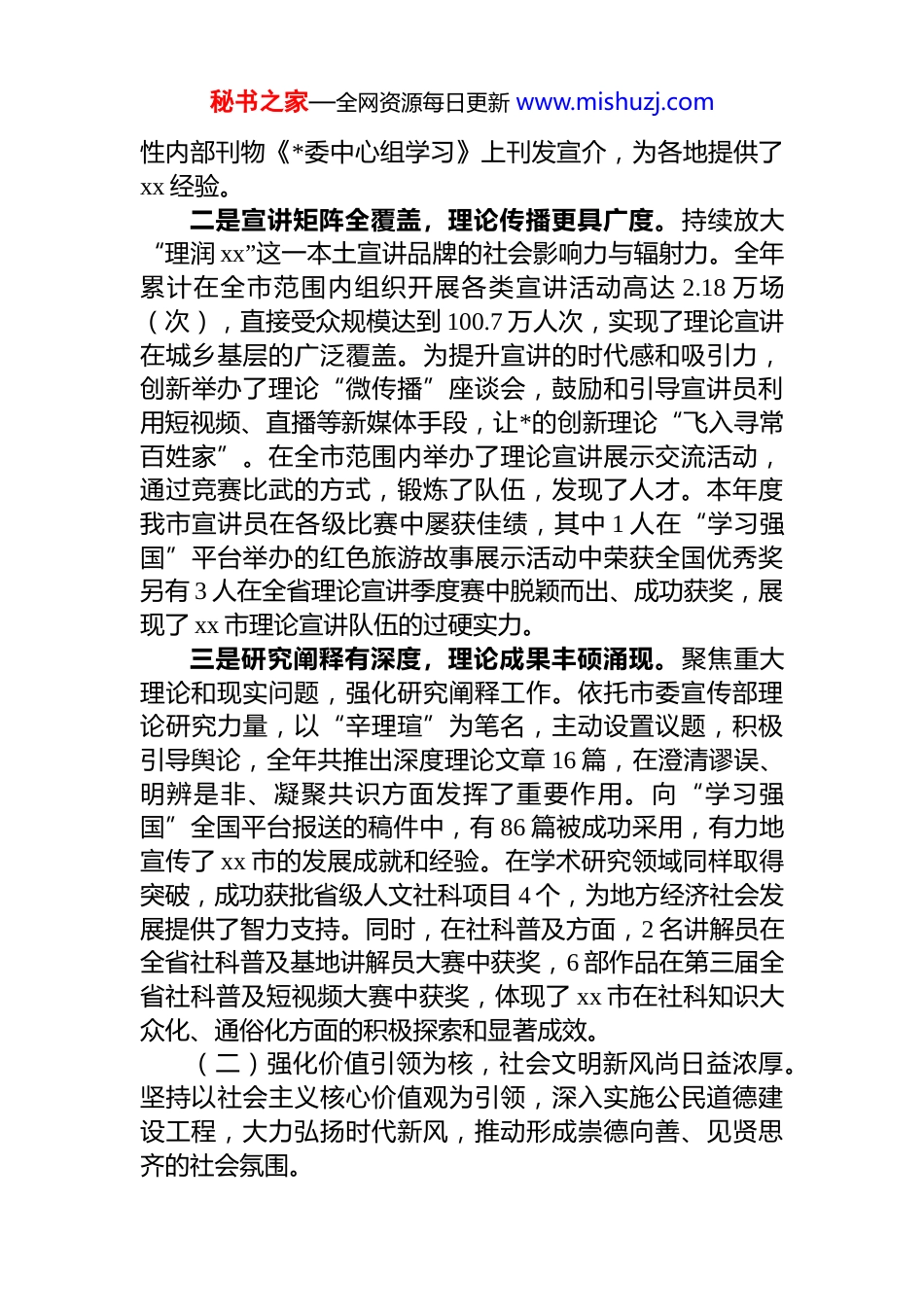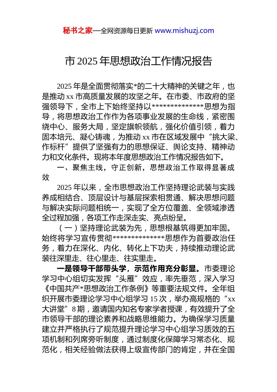 秘书之家—全网资源每日更新 www.mishuzj.com市 2025 年思想政治工作情况报告2025 年是全面贯彻落实*的二十大精神的关键之年,也是推动 xx 市高质量发展的攻坚之年。在市委、市政府的坚强领导下,全市上下始终坚持以**************思想为指导,将思想政治工作作为各项事业发展的生命线,紧密围绕中心、服务大局,坚定旗帜领航,强化价值引领,着力固本培元、凝心铸魂,为推动 xx 市在区域发展中“挑大梁、作标杆”提供了坚强有力的思想保证、舆论支持、精神动力和文化条件。现将本年度思想政治工作情况报告如下。一、聚焦主线,守正创新,思想政治工作取得显著成效2025 年以来,全市思想政治工作坚持理论武装与实践养成相结合、顶层设计与基层探索相贯通、解决思想问题与解决实际问题相统一,实现了全方位覆盖、全领域渗透全过程加强,各项工作走深走实、亮点纷呈。(一)坚持理论武装为先,思想根基筑得更加牢固。始终将学习宣传贯彻**************思想作为首要政治任务,着力在深化、内化、转化上下功夫,持续推动理论武装往深里走、往心里走、往实里走。一是领导干部带头学,示范作用充分彰显。市委理论学习中心组切实发挥“头雁”效应,率先垂范,深入学习《中国共产*思想政治工作条例》等重要法规文件。全年组织开展市委理论学习中心组学习 15 次,举办高规格的“xx大讲堂”8 期,邀请国内知名专家学者授课,有效提升了全市领导干部的理论素养和战略思维能力。为确保学习质量建立并严格执行了规范提升理论学习中心组学习质效的五项机制和列席旁听制度,通过制度化保障学习常态化、规范化,相关经验做法获得上级宣传部门的肯定,并在全国秘书之家—全网资源每日更新 www.mishuzj.com性内部刊物《*委中心组学习》上刊发宣介,为各地提供了xx 经验。二是宣讲矩阵全覆盖,理论传播更具广度。持续放大“理润 xx”这一本土宣讲品牌的社会影响力与辐射力。全年累计在全市范围内组织开展各类宣讲活动高达 2.18 万场(次),直接受众规模达到 100.7 万人次,实现了理论宣讲在城乡基层的广泛覆盖。为提升宣讲的时代感和吸引力,创新举办了理论“微传播”座谈会,鼓励和引导宣讲员利用短视频、直播等新媒体手段,让*的创新理论“飞入寻常百姓家”。在全市范围内举办了理论宣讲展示交流活动,通过竞赛比武的方式,锻炼了队伍,发现了人才。本年度我市宣讲员在各级比赛中屡获佳绩,其中 1 人在“学习强国”平台举办的红色旅游故事展示活动中荣获全国优秀奖另有 3 人在全省理论宣讲季度赛中脱颖而出、成功获奖,展现了 xx 市理论宣讲队伍的过硬实力。三是研究阐释有深度,理论成果丰硕涌现。聚焦重大理论和现实问题,强化研究阐释工作。依托市委宣传部理论研究力量,以“辛理瑄”为笔名,主动设置议题,积极引导舆论,全年共推出深度理论文章 16 篇,在澄清谬误、明辨是非、凝聚共识方面发挥了重要作用。向“学习强国”全国平台报送的稿件中,有 86 篇被成功采用,有力地宣传了 xx 市的发展成就和经验。在学术研究领域同样取得突破,成功获批省级人文社科项目 4 个,为地方经济社会发展提供了智力支持。同时,在社科普及方面,2 名讲解员在全省社科普及基地讲解员大赛中获奖,6 部作品在第三届全省社科普及短视频大赛中获奖,体现了 xx 市在社科知识大众化、通俗化方面的积极探索和显著成效。(二)强化价值引领为核,社会文明新风尚日益浓厚。坚持以社会主义核心价值观为引领,深入实施公民道德建设工程,大力弘扬时代新风,推动形成崇德向善、见贤思齐的社会氛围。秘书之家—全网资源每日更新 www.mishuzj.com一是核心价值观融入日常,思想共识持续凝聚。积极承办高层次的社会主义核心价值观 xx 专题讲座,邀请权威专家深入解读,引导广大干部群众深刻理解其丰富内涵和实践要求。充分利用本地丰富的红色资源,成功策划并举办了“清明祭英烈重走长征路”大型思政教育主题实践活动,组织数千名*员干部、青少年学生重温革命历史,缅怀革命先烈,在庄严的仪式感和沉浸式体验中接受深刻的思想洗礼,让红色基因代代相传。二是榜样力量广泛弘扬,道德高...