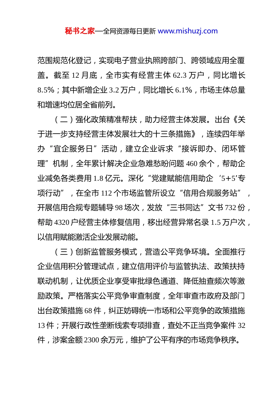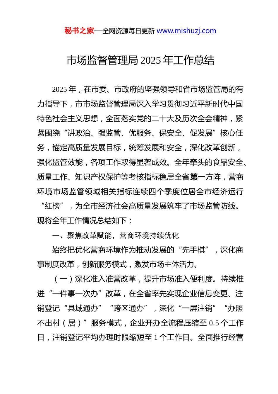 秘书之家—全网资源每日更新 www.mishuzj.com市场监督管理局 2025 年工作总结 2025 年,在市委、市政府的坚强领导和省市场监管局的有力指导下,市市场监督管理局深入学习贯彻习近平新时代中国特色社会主义思想,全面落实党的二十大及历次全会精神,紧紧围绕“讲政治、强监管、优服务、保安全、促发展”核心任务,锚定高质量发展目标,统筹发展和安全,深化改革创新,强化监管效能,各项工作取得显著成效。全年牵头的食品安全、质量工作、知识产权保护等考核指标稳居全省第一方阵,营商环境市场监管领域相关指标连续四个季度位居全市经济运行“红榜”,为全市经济社会高质量发展筑牢了市场监管防线。现将全年工作情况总结如下:一、聚焦改革赋能,营商环境持续优化始终把优化营商环境作为推动发展的“先手棋”,深化商事制度改革,创新服务模式,激发市场主体活力。(一)深化准入准营改革,提升市场准入便利度。持续推进“一件事一次办”改革,在全省率先实现企业信息变更、注销登记“县域通办”“跨区通办”,深化“一屏注销”“办照不出村(居)”服务模式,企业开办全流程压缩至 0.5 个工作日,注销登记平均办理时限缩短至 1 个工作日。全面推行经营秘书之家—全网资源每日更新 www.mishuzj.com范围规范化登记,实现电子营业执照跨部门、跨领域应用全覆盖。截至 12 月底,全市实有经营主体 62.3 万户,同比增长8.5%;其中新增企业 3.2 万户,同比增长 6.1%,市场主体总量和增速均位居全省前列。(二)强化政策精准帮扶,助力经营主体发展。出台《关于进一步支持经营主体发展壮大的十三条措施》,连续四年举办“宜企服务日”活动,建立企业诉求“接诉即办、闭环管理”机制,全年累计解决企业急难愁盼问题 460 余个,帮助企业减免各类费用 1.8 亿元。深化“党建赋能信用助企‘5+5’专项行动”,在全市 112 个市场监管所设立“信用合规服务站”,开展信用合规专题辅导 98 场次,发放“三书同达”文书 732 份,帮助 4320 户经营主体修复信用,移出经营异常名录 1.5 万户次,以信用赋能激活企业发展动能。(三)创新监管服务模式,营造公平竞争环境。全面推行企业信用积分管理试点,建立信用评价与监管执法、政策扶持联动机制,让优质企业享受审批绿色通道、降低抽查频次等激励政策。严格落实公平竞争审查制度,全年审查市政府及部门出台政策措施 68 件,纠正妨碍统一市场和公平竞争的政策措施13 件;开展行政性垄断线索专项排查,查处不正当竞争案件 32件,涉案金额 2300 余万元,维护了公平有序的市场竞争秩序。秘书之家—全网资源每日更新 www.mishuzj.com二、聚焦监管提质,市场秩序更加规范坚持监管为民、执法为民,创新监管方式,强化重点领域整治,不断提升市场综合治理效能。(一)深化重点领域专项整治。持续开展民生领域案件查办“铁拳”行动,聚焦食品药品、特种设备、工业产品质量、价格收费、网络交易等重点领域,严厉打击违法违规行为。全年共立案查处各类违法案件 1860 件,罚没款 2.1 亿元,移送公安机关案件 47 件。深入开展“长江禁渔”“农资打假”“殡葬服务领域收费整治”“茶叶过度包装治理”等专项行动,查处相关案件 156 件,为群众挽回经济损失 860 余万元。(二)创新智慧监管执法模式。推进“互联网+监管”建设,建成全市市场监管大数据平台,整合食品药品、特种设备、信用监管等数据资源,实现监管信息互联互通。推广应用“扫码检查”“掌上执法”系统,实现现场检查、案件录入、结果公示全流程电子化,检查时长平均缩减 60%,企业迎检频次下降 70%。加强网络交易监管,规范网络经营主体 1.2 万户,查处网络虚假宣传、刷单炒信等案件 89 件,净化了网络交易环境。(三)强化消费者权益保护。健全消费纠纷多元化解机制,推行消费纠纷“六尺巷调解法”,在商场超市、农贸市场、景区景点等场所设立消费维权服务站 286 个。完善 12315 投诉举秘书之家—全网资源每日更新 www.mishuzj.com报快速回应机制,全年接收消费者投诉举报咨询 6.2 万件,投诉调解成功率达 92.3%,高出全国平均水平 19...