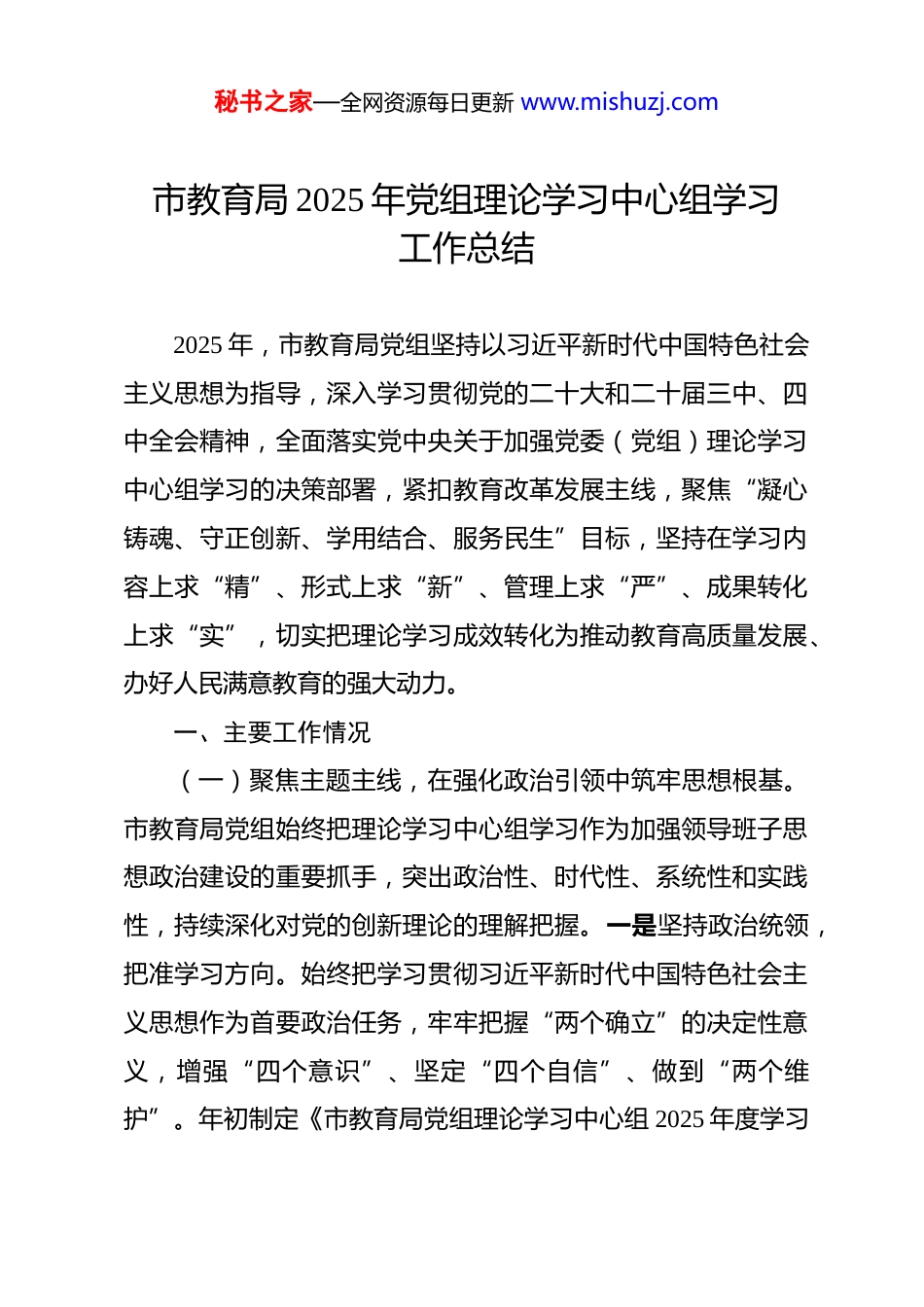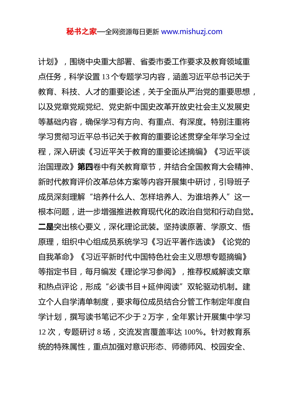秘书之家—全网资源每日更新 www.mishuzj.com市教育局 2025 年党组理论学习中心组学习工作总结 2025 年,市教育局党组坚持以习近平新时代中国特色社会主义思想为指导,深入学习贯彻党的二十大和二十届三中、四中全会精神,全面落实党中央关于加强党委(党组)理论学习中心组学习的决策部署,紧扣教育改革发展主线,聚焦“凝心铸魂、守正创新、学用结合、服务民生”目标,坚持在学习内容上求“精”、形式上求“新”、管理上求“严”、成果转化上求“实”,切实把理论学习成效转化为推动教育高质量发展、办好人民满意教育的强大动力。一、主要工作情况(一)聚焦主题主线,在强化政治引领中筑牢思想根基。市教育局党组始终把理论学习中心组学习作为加强领导班子思想政治建设的重要抓手,突出政治性、时代性、系统性和实践性,持续深化对党的创新理论的理解把握。一是坚持政治统领,把准学习方向。始终把学习贯彻习近平新时代中国特色社会主义思想作为首要政治任务,牢牢把握“两个确立”的决定性意义,增强“四个意识”、坚定“四个自信”、做到“两个维护”。年初制定《市教育局党组理论学习中心组 2025 年度学习秘书之家—全网资源每日更新 www.mishuzj.com计划》,围绕中央重大部署、省委市委工作要求及教育领域重点任务,科学设置 13 个专题学习内容,涵盖习近平总书记关于教育、科技、人才的重要论述,关于全面从严治党的重要思想,以及党章党规党纪、党史新中国史改革开放史社会主义发展史等基础内容,确保学习有方向、有重点、有深度。特别注重将学习贯彻习近平总书记关于教育的重要论述贯穿全年学习全过程,深入研读《习近平关于教育的重要论述摘编》《习近平谈治国理政》第四卷中有关教育章节,并结合全国教育大会精神、新时代教育评价改革总体方案等内容开展集中研讨,引导班子成员深刻理解“培养什么人、怎样培养人、为谁培养人”这一根本问题,进一步增强推进教育现代化的政治自觉和行动自觉。二是突出核心要义,深化理论武装。坚持读原著、学原文、悟原理,组织中心组成员系统学习《习近平著作选读》《论党的自我革命》《习近平新时代中国特色社会主义思想专题摘编》等指定书目,每月编发《理论学习参阅》,推荐权威解读文章和热点评论,形成“必读书目+延伸阅读”双轮驱动机制。建立个人自学清单制度,要求每位成员结合分管工作制定年度自学计划,撰写读书笔记不少于 2 万字,全年累计开展集中学习12 次,专题研讨 8 场,交流发言覆盖率达 100%。针对教育系统的特殊属性,重点加强对意识形态、师德师风、校园安全、秘书之家—全网资源每日更新 www.mishuzj.com基础教育优质均衡等敏感领域的理论学习。围绕“落实立德树人根本任务”“构建‘五育并举’育人体系”“推动‘双减’政策落地见效”等议题组织专题学习,邀请高校专家、一线校长作辅导报告,帮助领导干部从理论高度认识教育工作的战略意义和社会价值。三是紧跟时代脉搏,拓展学习视野。主动适应新时代教育变革趋势,围绕人工智能赋能教育、数字化转型、新课程标准实施、拔尖创新人才培养等前沿课题,开设“教育前沿大讲堂”,邀请清华大学、华东师范大学等高校学者开展专题讲座 6 场,组织赴北京中关村一小、上海徐汇区教育局等地考察调研,实地感受智慧校园建设和教学模式创新成果。同时,重温习近平总书记历次考察时关于教育的重要讲话精神,特别是对乡村教育振兴、职业教育发展、青少年健康成长等方面的殷切嘱托,组织开展“沿着总书记足迹”主题研学活动,赴沂蒙革命老区实地参观红色教育基地,感悟“教育扶贫阻断代际传递”的深远意义,进一步激发服务基层、扎根一线的责任感与使命感。(二)创新方式方法,在丰富载体中提升学习质效。面对新时代党员干部学习需求多元化、信息获取碎片化的现实挑战,市教育局党组积极探索理论学习新路径、新模式,推动中心组学习由“被动听讲”向“主动参与”、“单一灌输”向“多元秘书之家—全网资源每日更新 www.mishuzj.com互动”转变,不断增强学习的吸引力、感染力和实效性。一是以上率下,发挥“头雁效应”。坚持“关键少数”示范引领,党组书...