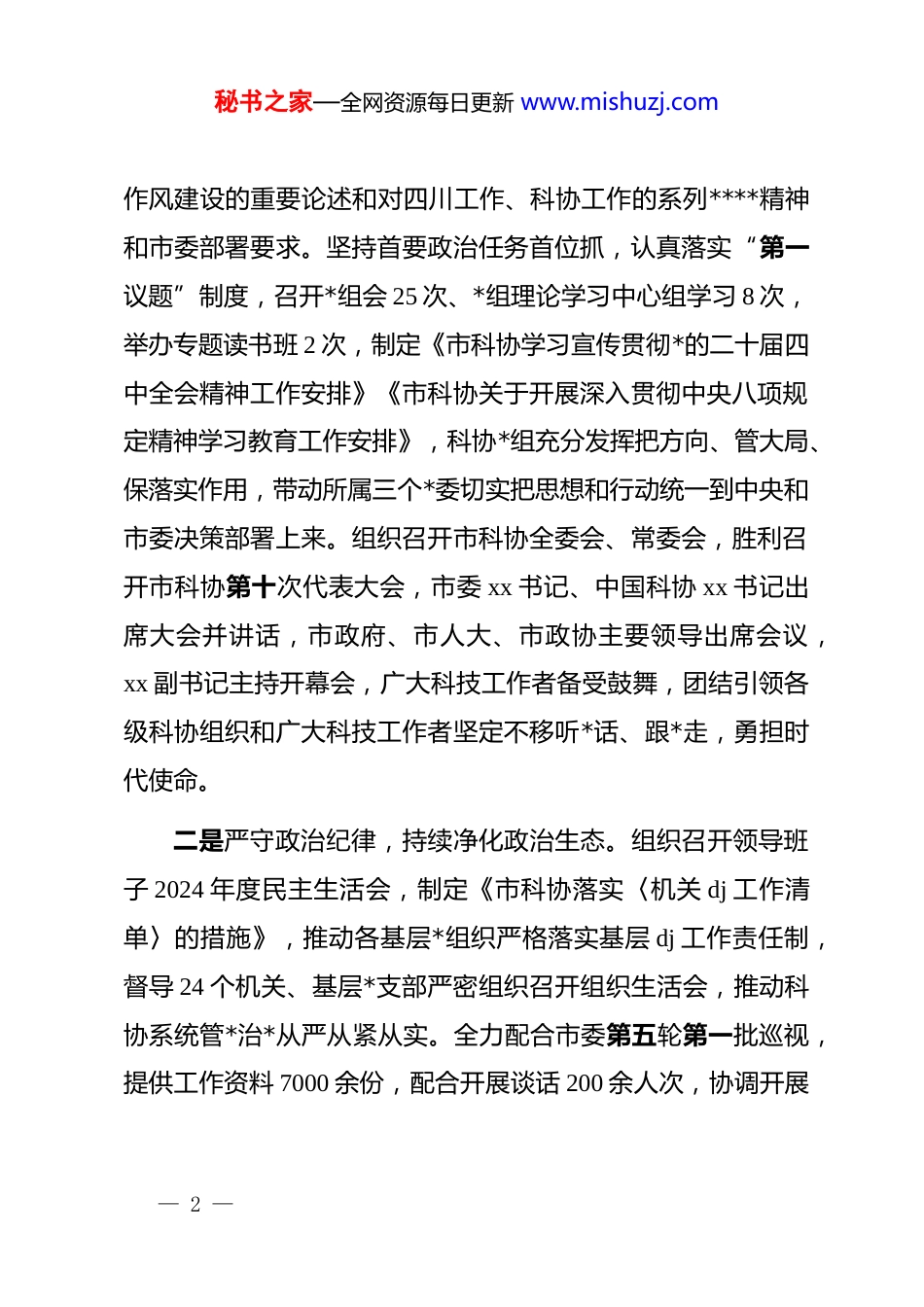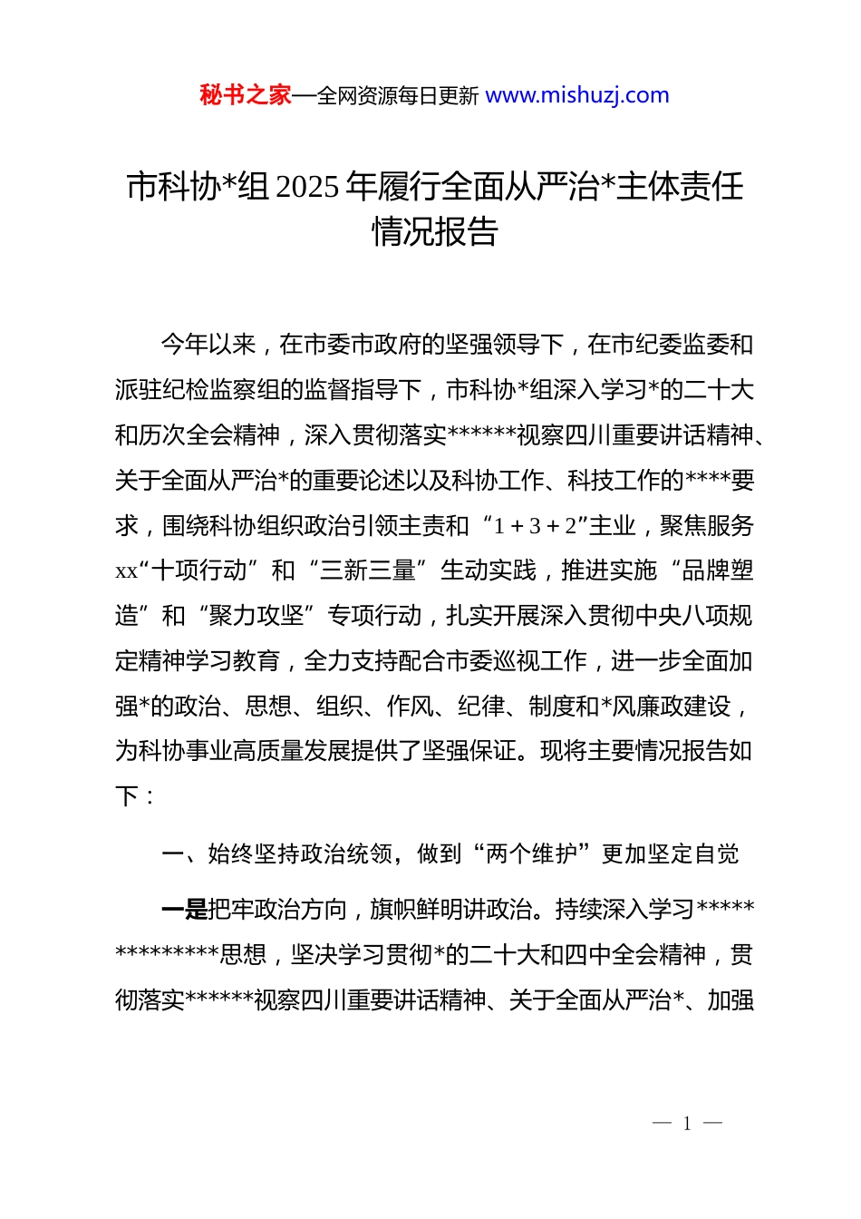 秘书之家—全网资源每日更新 www.mishuzj.com市科协*组 2025 年履行全面从严治*主体责任情况报告今年以来,在市委市政府的坚强领导下,在市纪委监委和派驻纪检监察组的监督指导下,市科协*组深入学习*的二十大和历次全会精神,深入贯彻落实******视察四川重要讲话精神、关于全面从严治*的重要论述以及科协工作、科技工作的****要求,围绕科协组织政治引领主责和“1+3+2”主业,聚焦服务xx“十项行动”和“三新三量”生动实践,推进实施“品牌塑造”和“聚力攻坚”专项行动,扎实开展深入贯彻中央八项规定精神学习教育,全力支持配合市委巡视工作,进一步全面加强*的政治、思想、组织、作风、纪律、制度和*风廉政建设,为科协事业高质量发展提供了坚强保证。现将主要情况报告如下:一、始终坚持政治统领,做到“两个维护”更加坚定自觉一是把牢政治方向,旗帜鲜明讲政治。持续深入学习**************思想,坚决学习贯彻*的二十大和四中全会精神,贯彻落实******视察四川重要讲话精神、关于全面从严治*、加强— 1 —秘书之家—全网资源每日更新 www.mishuzj.com作风建设的重要论述和对四川工作、科协工作的系列****精神和市委部署要求。坚持首要政治任务首位抓,认真落实“第一议题”制度,召开*组会 25 次、*组理论学习中心组学习 8 次,举办专题读书班 2 次,制定《市科协学习宣传贯彻*的二十届四中全会精神工作安排》《市科协关于开展深入贯彻中央八项规定精神学习教育工作安排》,科协*组充分发挥把方向、管大局、保落实作用,带动所属三个*委切实把思想和行动统一到中央和市委决策部署上来。组织召开市科协全委会、常委会,胜利召开市科协第十次代表大会,市委 xx 书记、中国科协 xx 书记出席大会并讲话,市政府、市人大、市政协主要领导出席会议,xx 副书记主持开幕会,广大科技工作者备受鼓舞,团结引领各级科协组织和广大科技工作者坚定不移听*话、跟*走,勇担时代使命。二是严守政治纪律,持续净化政治生态。组织召开领导班子 2024 年度民主生活会,制定《市科协落实〈机关 dj 工作清单〉的措施》,推动各基层*组织严格落实基层 dj 工作责任制,督导 24 个机关、基层*支部严密组织召开组织生活会,推动科协系统管*治*从严从紧从实。全力配合市委第五轮第一批巡视,提供工作资料 7000 余份,配合开展谈话 200 余人次,协调开展— 2 —秘书之家—全网资源每日更新 www.mishuzj.com调研走访 20 余次,积极主动接受“政治体检”。深入推进“清廉科协”建设,完善政治监督、日常监督工作清单,严肃*内政治生活,认真执行“三会一课”、谈心谈话、民主评议*员等制度,推动科协*的组织生活经常化、规范化、制度化。三是强化政治担当,不断筑牢*在科技界的执政根基。牵头开展 2025 年 xx 市“全国科技工作者日”系列活动,通过看望慰问等形式,将*和政府的关心关爱传达到每位科技工作者。大力弘扬科学家精神,建强用好 11 家全国科学家精神教育基地、28 家市级科学家精神教育基地,集成展示我市优秀科学家报国为民情怀;推出 5 期科学家精神纪录片和 1 期科学家精神宣传片在市主流媒体播出,发行《xx 科学家风采录》大型图书;推动 2 部大剧和 9 部中短剧成功入选中国科协“科学家故事舞台剧推广行动”;举办科学家精神进校园报告会 12 场,聘任奥运冠军 xx 等 11 人为 2025 年 xx 科普大使。深入组织科技工作者广泛调查研究,围绕 xx 科创园、xx 实验室建设,组织代表、委员积极建言献策。会同有关部门举荐服务 xx 等 7 名 xx 科技人才当选两院院士。扎实做好新时期统战工作,制定印发《市科协*组统战工作责任清单和领导班子成员职责清单》《市科协领导班子成员与科技界*外代表人士联谊交友工作安排》等制度文件,— 3 —秘书之家—全网资源每日更新 www.mishuzj.com推荐 10 名*外科技工作者进入中国科协*外人才库,向市委统战部报送市科协统战理论研究成果 1 篇。二、持续深化理论武装,干事创业思想根基进一步稳固一是压紧压实理论武装。严格落实《xx 市科协*组理论学习中心组学习细则》,坚持...