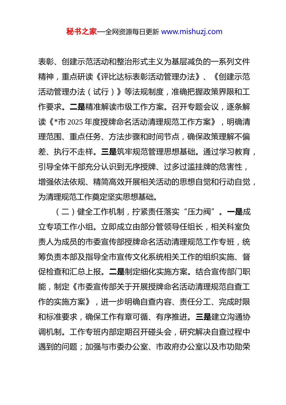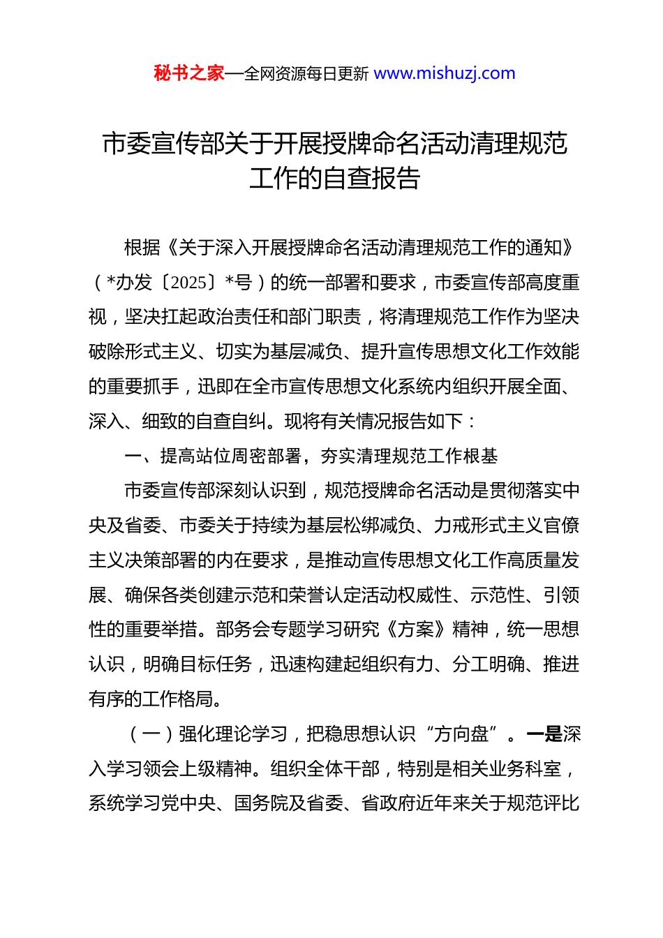 秘书之家—全网资源每日更新 www.mishuzj.com市委宣传部关于开展授牌命名活动清理规范工作的自查报告 根据《关于深入开展授牌命名活动清理规范工作的通知》(*办发〔2025〕*号)的统一部署和要求,市委宣传部高度重视,坚决扛起政治责任和部门职责,将清理规范工作作为坚决破除形式主义、切实为基层减负、提升宣传思想文化工作效能的重要抓手,迅即在全市宣传思想文化系统内组织开展全面、深入、细致的自查自纠。现将有关情况报告如下:一、提高站位周密部署,夯实清理规范工作根基市委宣传部深刻认识到,规范授牌命名活动是贯彻落实中央及省委、市委关于持续为基层松绑减负、力戒形式主义官僚主义决策部署的内在要求,是推动宣传思想文化工作高质量发展、确保各类创建示范和荣誉认定活动权威性、示范性、引领性的重要举措。部务会专题学习研究《方案》精神,统一思想认识,明确目标任务,迅速构建起组织有力、分工明确、推进有序的工作格局。(一)强化理论学习,把稳思想认识“方向盘”。一是深入学习领会上级精神。组织全体干部,特别是相关业务科室,系统学习党中央、国务院及省委、省政府近年来关于规范评比秘书之家—全网资源每日更新 www.mishuzj.com表彰、创建示范活动和整治形式主义为基层减负的一系列文件精神,重点研读《评比达标表彰活动管理办法》、《创建示范活动管理办法(试行)》等法规制度,准确把握政策界限和工作要求。二是精准解读市级工作方案。召开专题会议,逐条解读《*市 2025 年度授牌命名活动清理规范工作方案》,明确清理范围、重点任务、方法步骤和时间节点,确保政策理解不偏差、执行不走样。三是筑牢规范管理思想基础。通过学习教育,引导全体干部充分认识到无序授牌、过多过滥挂牌的危害性,增强依法依规、精简高效开展相关活动的思想自觉和行动自觉,为清理规范工作奠定坚实思想基础。(二)健全工作机制,拧紧责任落实“压力阀”。一是成立专项工作小组。立即成立由部分管领导任组长,相关科室负责人为成员的市委宣传部授牌命名活动清理规范工作专班,统筹负责本部及指导全市宣传文化系统相关工作的组织实施、督促检查和汇总上报。二是制定细化实施方案。结合宣传部门职能,制定《市委宣传部关于开展授牌命名活动清理规范自查工作的实施方案》,进一步明确自查内容、责任分工、完成时限和标准要求,确保工作有章可循、有序推进。三是建立沟通协调机制。工作专班内部定期召开碰头会,研究解决自查过程中遇到的问题;加强与市委办公室、市政府办公室以及市功勋荣秘书之家—全网资源每日更新 www.mishuzj.com誉表彰主管部门的沟通联系,及时请示汇报,确保政策把握准确、步调协调一致。(三)明确职责分工,划定自查清理“责任田”。一是厘清本部自查范围。明确对以市委宣传部名义(含单独或联合)发起、组织、参与、指导的各类授牌命名活动,以及本部机关及所属单位(含事业单位)对外悬挂的各类牌子进行全面梳理,做到不留死角、全覆盖。二是压实指导监管责任。按照《方案》任务分工,市委宣传部负责相关市管企业(文化类)的清理规范工作指导。我们及时向相关企业传达文件精神,明确其主体责任,要求其按照规定开展自查,并做好对其自查结果的审核把关。三是联动系统内部单位。向各县(市、区)党委宣传部、市直宣传文化系统各单位印发通知,要求其参照市级做法,组织开展本地区、本单位、本系统的清理规范自查工作,形成上下联动、齐抓共管的工作局面。二、对标对表全面摸排,扎实推进清理规范实施严格对照《方案》中“精简授牌命名活动”、“规范悬挂牌子”的具体要求,坚持问题导向,聚焦关键环节,对涉及宣传思想文化领域的相关活动及牌子进行拉网式排查、清单化管理、标准化研判。(一)全面摸排梳理,建立活动牌子“明细账”。一是系秘书之家—全网资源每日更新 www.mishuzj.com统梳理授牌命名活动。对党的十八大以来,以市委宣传部名义(含联合)组织开展或参与的各类“基地”、“示范点”、“先进单位”、“特色项目”等授牌命名活动进行全面回溯梳理。重点清查活动设立的规范性文件依据(严格对照《方案》中“活动设立是否合法...