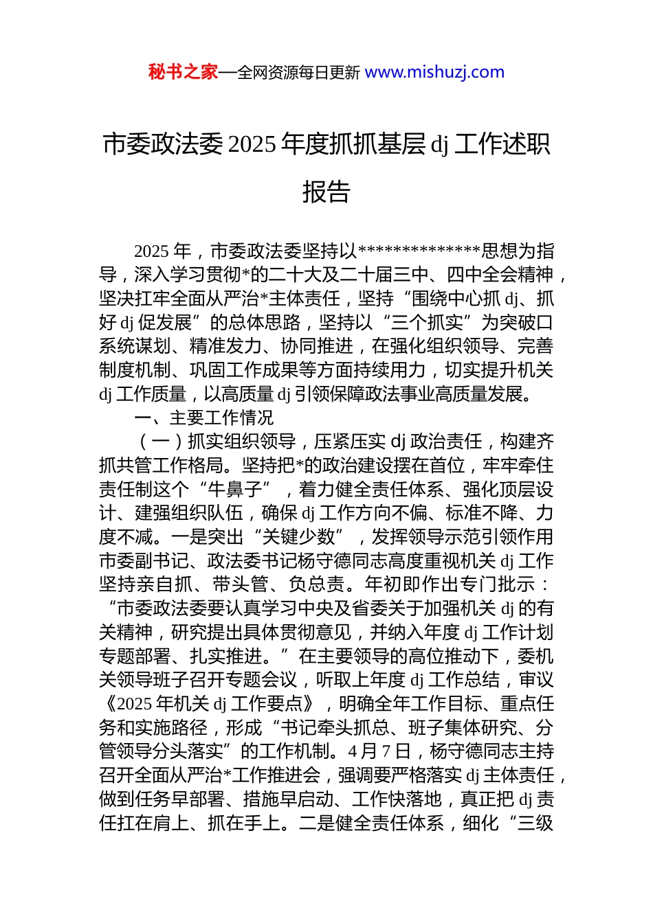 秘书之家—全网资源每日更新 www.mishuzj.com市委政法委 2025 年度抓抓基层 dj 工作述职报告2025 年,市委政法委坚持以**************思想为指导,深入学习贯彻*的二十大及二十届三中、四中全会精神,坚决扛牢全面从严治*主体责任,坚持“围绕中心抓 dj、抓好 dj 促发展”的总体思路,坚持以“三个抓实”为突破口系统谋划、精准发力、协同推进,在强化组织领导、完善制度机制、巩固工作成果等方面持续用力,切实提升机关dj 工作质量,以高质量 dj 引领保障政法事业高质量发展。一、主要工作情况(一)抓实组织领导,压紧压实 dj 政治责任,构建齐抓共管工作格局。坚持把*的政治建设摆在首位,牢牢牵住责任制这个“牛鼻子”,着力健全责任体系、强化顶层设计、建强组织队伍,确保 dj 工作方向不偏、标准不降、力度不减。一是突出“关键少数”,发挥领导示范引领作用市委副书记、政法委书记杨守德同志高度重视机关 dj 工作坚持亲自抓、带头管、负总责。年初即作出专门批示:“市委政法委要认真学习中央及省委关于加强机关 dj 的有关精神,研究提出具体贯彻意见,并纳入年度 dj 工作计划专题部署、扎实推进。”在主要领导的高位推动下,委机关领导班子召开专题会议,听取上年度 dj 工作总结,审议《2025 年机关 dj 工作要点》,明确全年工作目标、重点任务和实施路径,形成“书记牵头抓总、班子集体研究、分管领导分头落实”的工作机制。4 月 7 日,杨守德同志主持召开全面从严治*工作推进会,强调要严格落实 dj 主体责任,做到任务早部署、措施早启动、工作快落地,真正把 dj 责任扛在肩上、抓在手上。二是健全责任体系,细化“三级秘书之家—全网资源每日更新 www.mishuzj.com四岗”职责清单。围绕构建权责清晰、运转高效的 dj 工作责任链条,组织修订《市委政法委落实机关 dj 主体责任暂行办法贯彻实施意见》,进一步完善全面从严治*、“三级四岗”和思想政治工作三项责任清单。明确委主要负责同志履行“第一责任人”职责,班子成员严格落实“一岗双责”,既抓好分管领域业务工作,又同步推进 dj 任务落实通过清单化管理、项目化推进、闭环式考核,实现 dj 工作由“软指标”向“硬约束”转变。三是建强*务力量,提升*组织组织效能。注重从源头上夯实组织基础,选优配强*务干部队伍。由常务副书记担任机关*总支书记,实现 dj 与行政管理同部署、同调度;按照政治素质高、业务能力强群众基础好的标准,完成*总支及各支部班子换届选举,优化结构、增强活力。同时,加大培训力度,组织开展*务知识专题培训班 3 期,覆盖全体支委成员,重点讲授《中国共产*支部工作条例(试行)》《*和国家机关基层组织工作条例》等*内法规,全面提升*务干部履职能力。通过强化政治功能和组织功能,推动*组织从“有形覆盖”向“有效覆盖”深化,切实筑牢坚强战斗堡垒。(二)抓实制度措施,系统集成提质增效,推动 dj 工作规范化常态化。坚持制度先行、机制保障,聚焦 dj 工作的关键环节和薄弱领域,健全完善一批务实管用的制度举措,以制度之力推动 dj 工作提质增效、走深走实。一是严格执行 dj 联系点制度,打通责任传导“最后一公里”。制定出台《市委政法委领导班子成员 dj 联系点工作制度》,每位班子成员定点联系 1—2 个基层*支部,定期深入一线开展“四个一”活动:即参加一次组织生活、讲授一次*课、调研一项重点工作、解决一个实际问题。2025 年以来,领导班子成员累计赴联系点指导工作 28 人次,参与“三会一课”16 次、主题*日活动 9 次、理论学习中心组学习 6 次,现场协调解决*员教育管理、阵地建设等方面问题 12 项。通过下沉一线、靠前指挥,有效提升了基层*组织的凝聚力和秘书之家—全网资源每日更新 www.mishuzj.com执行力。二是深化谈心谈话制度,做实做细思想政治工作坚持严管与厚爱结合、激励与约束并重,建立健全常态化谈心谈话机制。严格落实廉政谈话、任职谈话、提醒谈话诫勉谈话和日常交流谈话“五必谈”制度,做到干部思想波动时必谈、岗位调整时必谈、发现问题苗头时必谈、受到问责处理时必谈、重大...