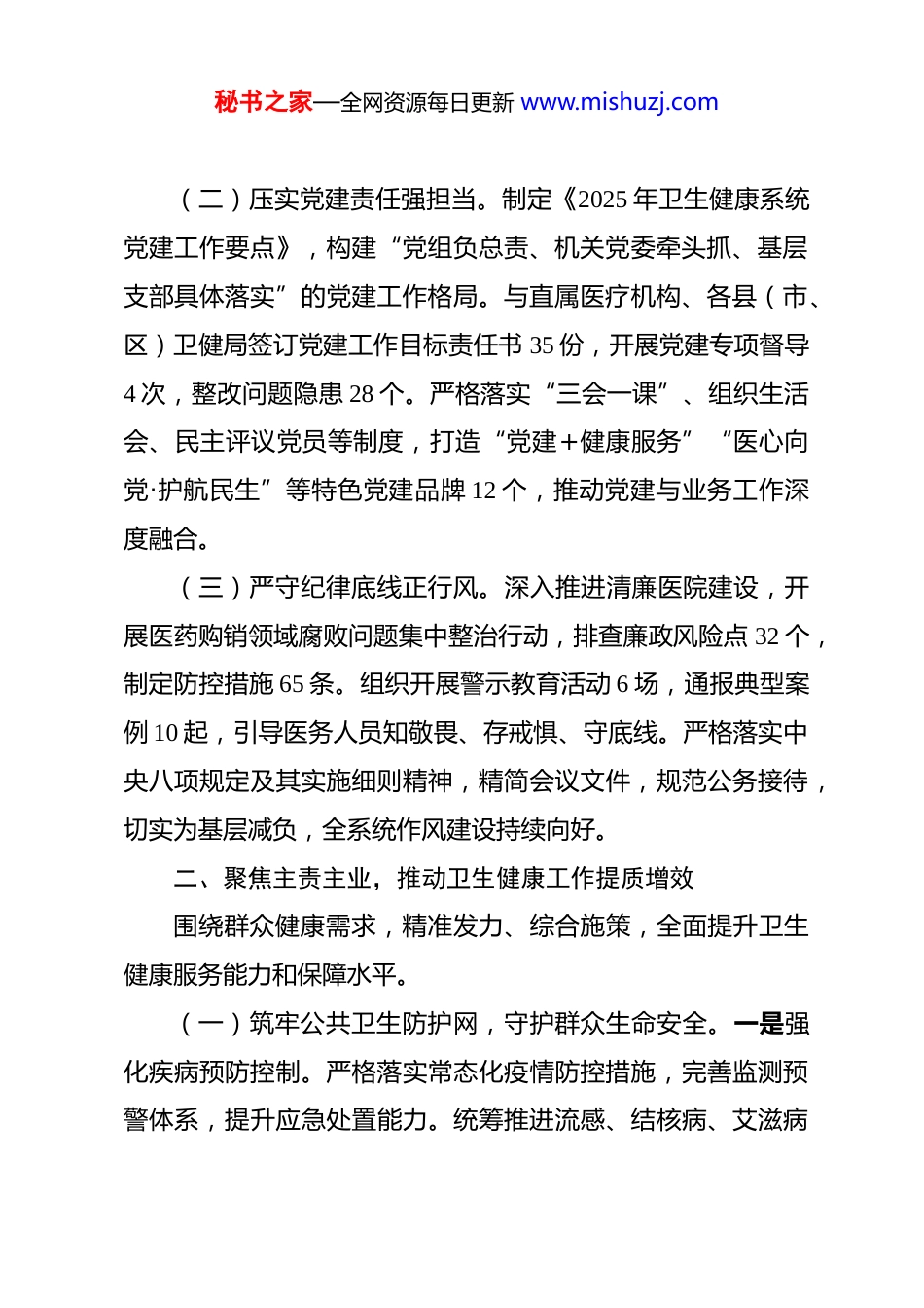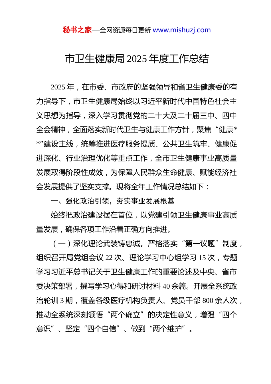 秘书之家—全网资源每日更新 www.mishuzj.com市卫生健康局 2025 年度工作总结 2025 年,在市委、市政府的坚强领导和省卫生健康委的有力指导下,市卫生健康局始终以习近平新时代中国特色社会主义思想为指导,深入学习贯彻党的二十大及二十届三中、四中全会精神,全面落实新时代卫生与健康工作方针,聚焦“健康**”建设主线,统筹推进医疗服务提质、公共卫生筑牢、健康促进深化、行业治理优化等重点工作,全市卫生健康事业高质量发展取得阶段性成效,为保障人民群众生命健康、赋能经济社会发展提供了坚实支撑。现将全年工作情况总结如下:一、强化政治引领,夯实事业发展根基始终把政治建设摆在首位,以党建引领卫生健康事业高质量发展,确保各项工作沿着正确方向推进。(一)深化理论武装铸忠诚。严格落实“第一议题”制度,组织召开局党组会议 22 次、理论学习中心组学习 15 次,专题学习习近平总书记关于卫生健康工作的重要论述及中央、省市委决策部署,撰写学习心得和研讨材料 40 余篇。开展全系统政治轮训 3 期,覆盖各级医疗机构负责人、党员干部 800 余人次,推动全系统深刻领悟“两个确立”的决定性意义,增强“四个意识”、坚定“四个自信”、做到“两个维护”。秘书之家—全网资源每日更新 www.mishuzj.com(二)压实党建责任强担当。制定《2025 年卫生健康系统党建工作要点》,构建“党组负总责、机关党委牵头抓、基层支部具体落实”的党建工作格局。与直属医疗机构、各县(市、区)卫健局签订党建工作目标责任书 35 份,开展党建专项督导4 次,整改问题隐患 28 个。严格落实“三会一课”、组织生活会、民主评议党员等制度,打造“党建+健康服务”“医心向党·护航民生”等特色党建品牌 12 个,推动党建与业务工作深度融合。(三)严守纪律底线正行风。深入推进清廉医院建设,开展医药购销领域腐败问题集中整治行动,排查廉政风险点 32 个,制定防控措施 65 条。组织开展警示教育活动 6 场,通报典型案例 10 起,引导医务人员知敬畏、存戒惧、守底线。严格落实中央八项规定及其实施细则精神,精简会议文件,规范公务接待,切实为基层减负,全系统作风建设持续向好。二、聚焦主责主业,推动卫生健康工作提质增效围绕群众健康需求,精准发力、综合施策,全面提升卫生健康服务能力和保障水平。(一)筑牢公共卫生防护网,守护群众生命安全。一是强化疾病预防控制。严格落实常态化疫情防控措施,完善监测预警体系,提升应急处置能力。统筹推进流感、结核病、艾滋病秘书之家—全网资源每日更新 www.mishuzj.com等重点传染病防控,开展专项防治行动 8 次,疫苗全程接种率保持在 95%以上。加强慢性病综合防治,建成健康管理中心 18个,规范管理高血压、糖尿病患者 60 余万人,慢性病规范管理率提升至 85%。二是提升应急保障能力。修订完善突发公共卫生事件应急预案,开展应急演练 4 次,提升快速响应和处置能力。加强应急物资储备,健全物资保障机制,确保突发情况物资供应充足。规范发热门诊、哨点诊室设置,提升早期预警和快速处置能力,全年未发生重大公共卫生事件。三是优化妇幼健康服务。推进妇幼保健机构标准化建设,完善婚前医学检查、孕前优生健康检查、产前筛查、新生儿疾病筛查“全链条”服务体系,全年免费婚前检查率达 90%以上,新生儿疾病筛查率达 99%以上。加强孕产妇和儿童健康管理,规范高危孕产妇专案管理,孕产妇死亡率、5 岁以下儿童死亡率持续保持低位。(二)推进医疗服务提质,提升群众就医体验。一是优化医疗资源配置。加快推进市级重点医院扩建项目,新增床位500 张,提升重症医学、心血管、儿科等重点专科服务能力。加强县级医院标准化建设,推动优质医疗资源下沉,组建医疗联合体 15 个,开展远程医疗服务 2.3 万次,让群众在家门口就能享受优质医疗服务。二是提升医疗服务质量。开展医疗质量提升专项行动,规范诊疗行为,加强合理用药、合理检查监管,秘书之家—全网资源每日更新 www.mishuzj.com医疗纠纷发生率同比下降 30%。优化就医流程,推行“一站式”服务、预约诊疗、无假日医院等举措,...