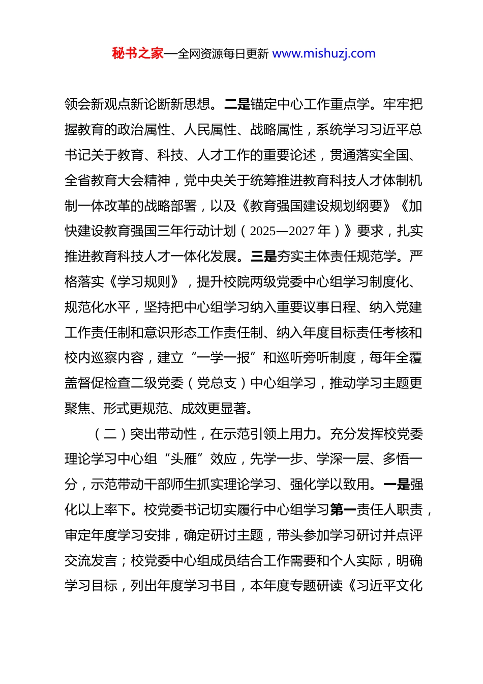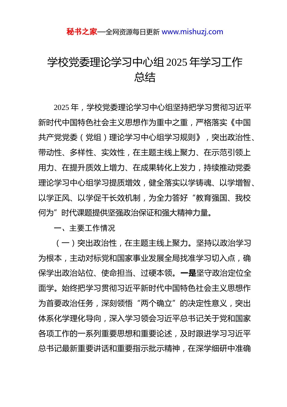 秘书之家—全网资源每日更新 www.mishuzj.com学校党委理论学习中心组 2025 年学习工作总结 2025 年,学校党委理论学习中心组坚持把学习贯彻习近平新时代中国特色社会主义思想作为重中之重,严格落实《中国共产党党委(党组)理论学习中心组学习规则》,突出政治性、带动性、多样性、实效性,在主题主线上聚力、在示范引领上用力、在提升质效上增力、在成果转化上发力,持续推动党委理论学习中心组学习提质增效,健全落实以学铸魂、以学增智、以学正风、以学促干长效机制,为全力答好“教育强国、我校何为”时代课题提供坚强政治保证和强大精神力量。一、主要工作情况(一)突出政治性,在主题主线上聚力。坚持以政治学习为根本,主动对标党和国家事业发展全局找准学习切入点,确保学出政治站位、使命担当、过硬本领。一是坚守政治定位全面学。始终把学习贯彻习近平新时代中国特色社会主义思想作为首要政治任务,深刻领悟“两个确立”的决定性意义,突出体系化学理化导向,深入学习领会习近平总书记关于党和国家各项工作的一系列重要思想和重要论述,及时跟进学习习近平总书记最新重要讲话和重要指示批示精神,在深学细研中准确秘书之家—全网资源每日更新 www.mishuzj.com领会新观点新论断新思想。二是锚定中心工作重点学。牢牢把握教育的政治属性、人民属性、战略属性,系统学习习近平总书记关于教育、科技、人才工作的重要论述,贯通落实全国、全省教育大会精神,党中央关于统筹推进教育科技人才体制机制一体改革的战略部署,以及《教育强国建设规划纲要》《加快建设教育强国三年行动计划(2025—2027 年)》要求,扎实推进教育科技人才一体化发展。三是夯实主体责任规范学。严格落实《学习规则》,提升校院两级党委中心组学习制度化、规范化水平,坚持把中心组学习纳入重要议事日程、纳入党建工作责任制和意识形态工作责任制、纳入年度目标责任考核和校内巡察内容,建立“一学一报”和巡听旁听制度,每年全覆盖督促检查二级党委(党总支)中心组学习,推动学习主题更聚焦、形式更规范、成效更显著。(二)突出带动性,在示范引领上用力。充分发挥校党委理论学习中心组“头雁”效应,先学一步、学深一层、多悟一分,示范带动干部师生抓实理论学习、强化学以致用。一是强化以上率下。校党委书记切实履行中心组学习第一责任人职责,审定年度学习安排,确定研讨主题,带头参加学习研讨并点评交流发言;校党委中心组成员结合工作需要和个人实际,明确学习目标,列出年度学习书目,本年度专题研读《习近平文化秘书之家—全网资源每日更新 www.mishuzj.com思想学习纲要》《习近平总书记关于党的建设的重要思想概论》《习近平谈治国理政》第五卷等权威读本,在原原本本学、系统深入学中悟原理、明方向。二是深化读书研讨。采用读书班形式,组织校党委中心组成员坐下来、静下心,围绕明确的主题、安排充足的时间开展研讨式读书学习。举办深入贯彻中央八项规定精神学习教育专题读书班,在自学基础上,通过领学原文、观看专题片、参观见学、专题辅导、交流读书学习心得等环节,带动全校学习教育高标准、高质量开局起步;举办暑期干部读书研讨班,围绕“勇担强国建设使命,谱写一流建设新篇,科学擘画‘十五五’高质量发展蓝图”主题,通过专家报告、汇报交流、分组研讨等形式,为科学谋划学校“十五五”奋斗目标与发展路径汇聚智慧、凝聚共识。三是注重理论阐释。校党委中心组成员结合个人自学、集体学习与研讨,总结提炼学习成果、学习体会,切实将理论学习成效转化为学术上的突破与思想上的精进。(三)突出多样性,在提升质效上增力。积极探索创新学习方法手段、平台载体,让理论学习更有吸引力、更富实效性。一是丰富学习方式。采取专家讲学、上下联学、实践研学等方式,提升学习质量和效果。先后邀请专家围绕深入贯彻中央八项规定精神学习教育、学习贯彻全国两会精神、马克思主义宗秘书之家—全网资源每日更新 www.mishuzj.com教观与党的宗教政策等专题作辅导报告,组织中心组成员赴市警示教育基地开展参观见学,以权威性解读和沉浸式体验深化认知。二是拓展学习内容。坚持“...
