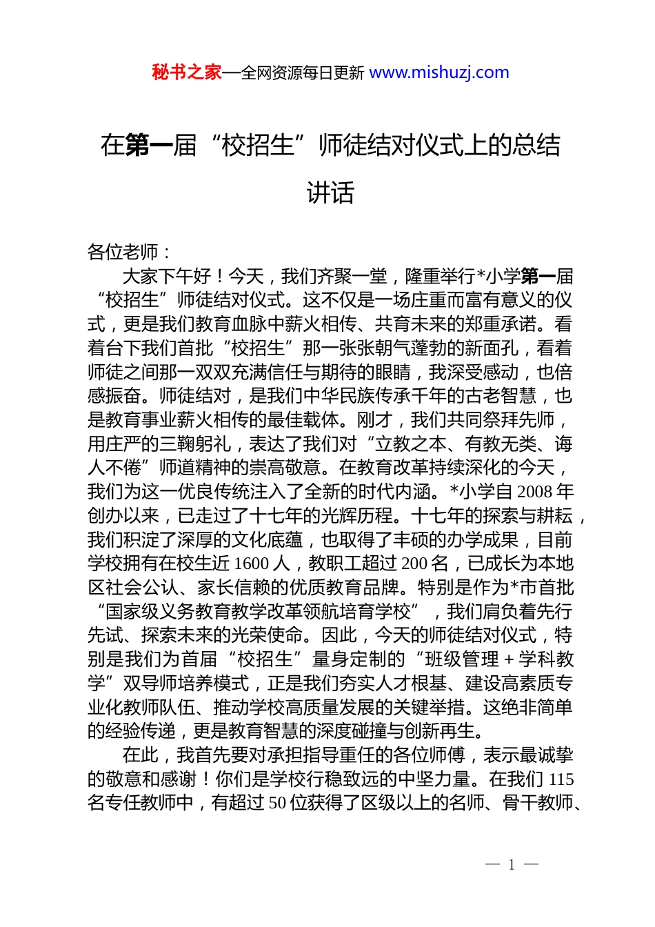 秘书之家—全网资源每日更新 www.mishuzj.com在第一届“校招生”师徒结对仪式上的总结讲话各位老师:大家下午好!今天,我们齐聚一堂,隆重举行*小学第一届“校招生”师徒结对仪式。这不仅是一场庄重而富有意义的仪式,更是我们教育血脉中薪火相传、共育未来的郑重承诺。看着台下我们首批“校招生”那一张张朝气蓬勃的新面孔,看着师徒之间那一双双充满信任与期待的眼睛,我深受感动,也倍感振奋。师徒结对,是我们中华民族传承千年的古老智慧,也是教育事业薪火相传的最佳载体。刚才,我们共同祭拜先师,用庄严的三鞠躬礼,表达了我们对“立教之本、有教无类、诲人不倦”师道精神的崇高敬意。在教育改革持续深化的今天,我们为这一优良传统注入了全新的时代内涵。*小学自 2008 年创办以来,已走过了十七年的光辉历程。十七年的探索与耕耘,我们积淀了深厚的文化底蕴,也取得了丰硕的办学成果,目前学校拥有在校生近 1600 人,教职工超过 200 名,已成长为本地区社会公认、家长信赖的优质教育品牌。特别是作为*市首批“国家级义务教育教学改革领航培育学校”,我们肩负着先行先试、探索未来的光荣使命。因此,今天的师徒结对仪式,特别是我们为首届“校招生”量身定制的“班级管理+学科教学”双导师培养模式,正是我们夯实人才根基、建设高素质专业化教师队伍、推动学校高质量发展的关键举措。这绝非简单的经验传递,更是教育智慧的深度碰撞与创新再生。在此,我首先要对承担指导重任的各位师傅,表示最诚挚的敬意和感谢!你们是学校行稳致远的中坚力量。在我们 115名专任教师中,有超过 50 位获得了区级以上的名师、骨干教师、— 1 —秘书之家—全网资源每日更新 www.mishuzj.com优秀班主任等荣誉称号。你们不仅业务精湛、技艺高超,更怀揣着对教育事业的无限忠诚与热爱。学校的每一份成绩,都离不开你们的辛勤耕耘和无私奉献。古语有云:“新竹高于旧竹枝,全凭老干为扶持。”正如刚才师傅代表*老师发言时所承诺的,希望你们能真正做好“传、帮、带”的表率。一要倾囊相授,做好“传道者”。希望你们毫无保留地将自己多年积累的教学技艺、课堂管理智慧和育人经验传授给青年教师。不仅要指导他们如何备课、上课,更要引领他们理解课程的本质、把握教育的规律。要帮助新教师尽快“站稳讲台”,更要帮助他们未来“站好讲台”。二要春风化雨,当好“引路人”。青年教师的成长是全方位的。希望你们能主动关心他们的思想动态、工作困境和生活需求,在他们迷茫时给予点拨,在他们遇到挫折时给予鼓励,成为他们职业生涯中可以信赖的良师益友。三要德高为范,成为“大先生”。师者,传道授业解惑也,“传道”为先。希望你们用自己高尚的师德、严谨的教风、仁爱的胸怀和无私的奉献精神,为新教师树立榜样。真正做到如大家所期望的,“不仅要带教学方法,更要传教育匠心”。请你们务必牢记,你们今天的倾心指导,深度与广度,直接关乎*小学未来的教育质量与核心竞争力。同时,我也要对朝气蓬勃的青年教师们,表达最热烈的欢迎和最殷切的期望!欢迎你们加入*小学这个温暖奋进的大家庭!你们是学校未来的希望,你们的到来,为我们带来了新的知识、新的理念和新的活力。刚才,徒弟代表*老师的发言,让我看到了你们对成长的热切渴望和对教育事业的赤子之心。你们坦言初入职场的迷茫,视师傅的引领为“暗夜明灯”;你们更立下承诺,要以青年人的创新思维反哺团队,与师傅们实现一场教学相长的“双向奔赴”。这种态度和追求,非常好!“教育之路漫漫,唯有匠心可抵岁月漫长。”在此,我也对大家提四点希望:第一,保持“空杯心态”,虚心求教。你们拥有扎实的— 2 —秘书之家—全网资源每日更新 www.mishuzj.com理论基础,但教育是一门实践的艺术。希望你们能珍惜学校提供的宝贵平台,放下身段,甘当小学生,像海绵吸水一样,主动向师傅学习、向身边的每一位同事请教,尽快完成从优秀学生到优秀教师的角色转变。第二,勇于实践探索,大胆创新。课堂是你们实现专业成长的核心阵地。希望你们在师傅的悉心指导下,大胆地去尝试、去反思、去打磨,在一次次的实践中,逐步形成自己独特...