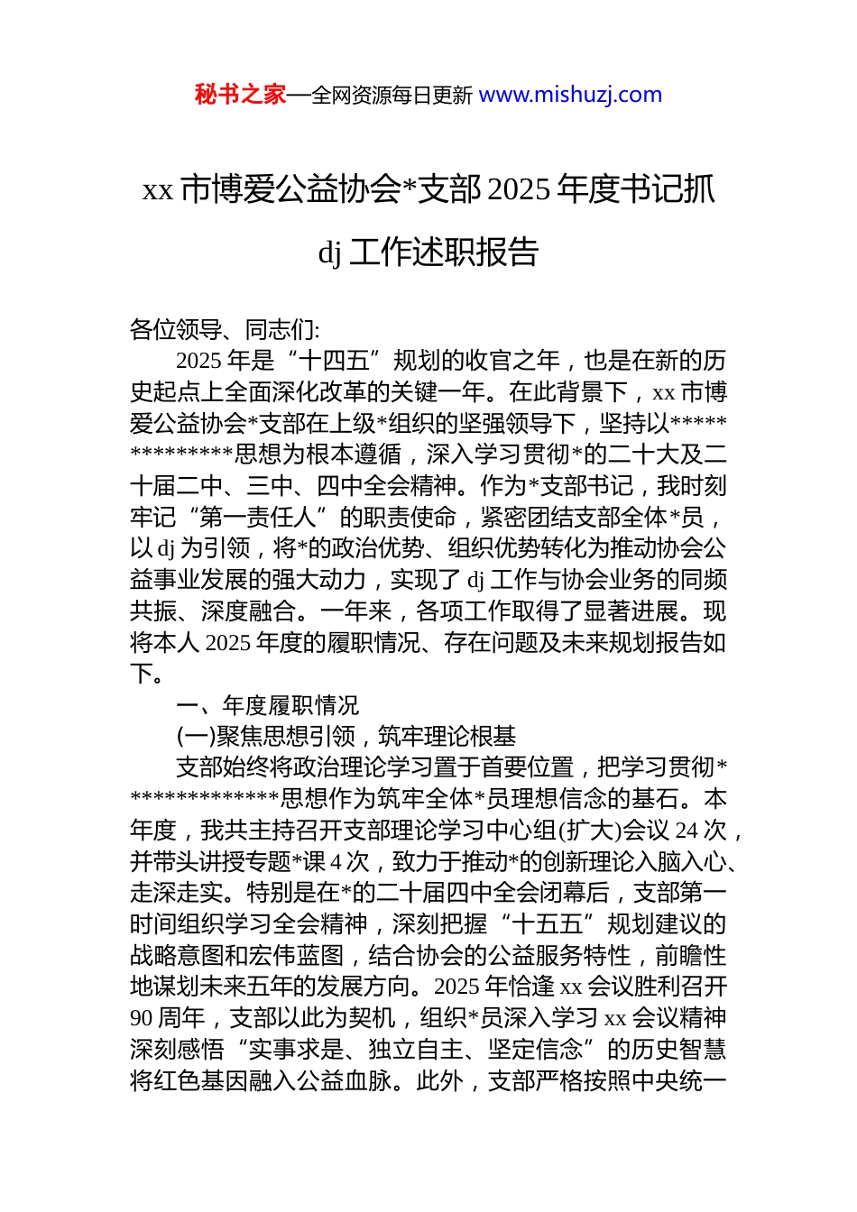 秘书之家—全网资源每日更新 www.mishuzj.comxx 市博爱公益协会*支部 2025 年度书记抓dj 工作述职报告各位领导、同志们:2025 年是“十四五”规划的收官之年,也是在新的历史起点上全面深化改革的关键一年。在此背景下,xx 市博爱公益协会*支部在上级*组织的坚强领导下,坚持以**************思想为根本遵循,深入学习贯彻*的二十大及二十届二中、三中、四中全会精神。作为*支部书记,我时刻牢记“第一责任人”的职责使命,紧密团结支部全体*员,以 dj 为引领,将*的政治优势、组织优势转化为推动协会公益事业发展的强大动力,实现了 dj 工作与协会业务的同频共振、深度融合。一年来,各项工作取得了显著进展。现将本人 2025 年度的履职情况、存在问题及未来规划报告如下。一、年度履职情况(一)聚焦思想引领,筑牢理论根基支部始终将政治理论学习置于首要位置,把学习贯彻**************思想作为筑牢全体*员理想信念的基石。本年度,我共主持召开支部理论学习中心组(扩大)会议 24 次,并带头讲授专题*课 4 次,致力于推动*的创新理论入脑入心、走深走实。特别是在*的二十届四中全会闭幕后,支部第一时间组织学习全会精神,深刻把握“十五五”规划建议的战略意图和宏伟蓝图,结合协会的公益服务特性,前瞻性地谋划未来五年的发展方向。2025 年恰逢 xx 会议胜利召开90 周年,支部以此为契机,组织*员深入学习 xx 会议精神深刻感悟“实事求是、独立自主、坚定信念”的历史智慧将红色基因融入公益血脉。此外,支部严格按照中央统一秘书之家—全网资源每日更新 www.mishuzj.com部署,扎实开展了中央八项规定精神学习教育,通过集中学习《***关于加强*的作风建设论述摘编》、个人自学、交流研讨等多种形式,确保作风建设常态化、长效化。全年,支部*员理论学习参学率达到 100%,人均撰写学习笔记超过 2 万字,思想政治素质得到普遍提升。(二)夯实组织基础,规范支部生活支部严格执行*的组织生活制度,以制度化、规范化保障支部战斗堡垒作用的发挥。全年共召开支部*员大会 12 次、支部委员会会议 24 次、*小组会议 48 次,并确保每季度至少安排 1 次高质量的*课教育,使“三会一课”真正成为*员政治学习的阵地、思想交流的平台和*性锻炼的熔炉。在规范落实的基础上,支部积极探索组织生活形式的创新。围绕“dj 引领聚合力,博爱服务暖人心”的主题,策划并开展了 12 次特色鲜明的主题*日活动。活动内容不仅包括赴xx 会议会址等红色教育基地接受革命传统教育 3 次,更包括组织*员深入社区、乡村开展扶弱助残、环保宣传、应急救护知识普及等志愿服务 8 次。这些活动紧密结合协会的公益属性,使*员在服务群众的实践中锤炼*性,全年主题*日活动*员出勤率稳定在 98%以上。年中,支部召开了作风建设专题组织生活会,会上,我带头开展批评与自我批评,聚焦“四个带头”要求,全体*员开诚布公,共查摆出各类问题 15 条,并制定了详尽的整改措施,现已全部整改到位。年底,规范开展了民主评议*员工作,评选出 5 名年度优秀*员,并对 1 名基本合格*员进行了“一对一”的谈心谈话和结对帮扶,帮助其改进提升。全年,我与支部*员开展谈心谈话累计达 86 人次,有效掌握了*员的思想动态,增强了支部的凝聚力和向心力。(三)强化队伍建设,激发组织活力支部坚持“成熟一个,发展一个”的原则,严把*员“入口关”,确保新发展*员的质量。本年度,经过严格的培养和考察程序,共确定入*积极分子 6 名,发展预备*员 3秘书之家—全网资源每日更新 www.mishuzj.com名,按期转正*员 2 名。新发展的*员中,大专及以上学历占比 100%,平均年龄 32 岁,主要来自协会的青年业务骨干和优秀志愿者,为*组织注入了新鲜血液。支部持续深化“四强”*支部创建工作,对照“政治功能强、支部班子强、*员队伍强、作用发挥强”的目标,进一步健全和完善了各项工作制度。为推动*员作用发挥具体化,支部创新性地设立了“*员责任区”和“*员示范岗”。例如,在协会运营的“博爱商城”电商助农项目中设立“线上运营*员示范岗”,在“博爱家园”社区服务项目中设立“空...