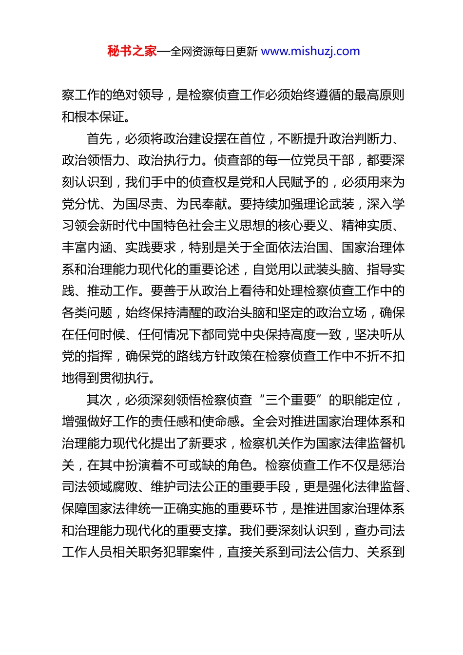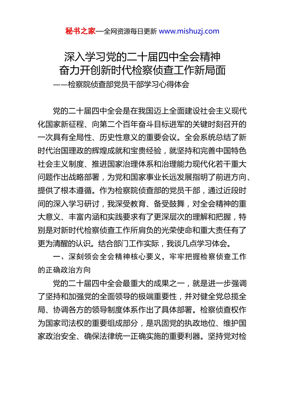 秘书之家—全网资源每日更新 www.mishuzj.com深入学习党的二十届四中全会精神奋力开创新时代检察侦查工作新局面——检察院侦查部党员干部学习心得体会党的二十届四中全会是在我国迈上全面建设社会主义现代化国家新征程、向第二个百年奋斗目标进军的关键时刻召开的一次具有全局性、历史性意义的重要会议。全会系统总结了新时代治国理政的辉煌成就和宝贵经验,就坚持和完善中国特色社会主义制度、推进国家治理体系和治理能力现代化若干重大问题作出战略部署,为党和国家事业长远发展指明了前进方向、提供了根本遵循。作为检察院侦查部的党员干部,通过近段时间的深入学习研讨,我深受教育、备受鼓舞,对全会精神的重大意义、丰富内涵和实践要求有了更深层次的理解和把握,特别是对新时代检察侦查工作所肩负的光荣使命和重大责任有了更为清醒的认识。结合部门工作实际,我谈几点学习体会。一、深刻领会全会精神核心要义,牢牢把握检察侦查工作的正确政治方向党的二十届四中全会最重大的成果之一,就是进一步强调了坚持和加强党的全面领导的极端重要性,并对健全党总揽全局、协调各方的领导制度体系作出了具体部署。检察侦查权作为国家司法权的重要组成部分,是巩固党的执政地位、维护国家政治安全、确保法律统一正确实施的重要利器。坚持党对检秘书之家—全网资源每日更新 www.mishuzj.com察工作的绝对领导,是检察侦查工作必须始终遵循的最高原则和根本保证。首先,必须将政治建设摆在首位,不断提升政治判断力、政治领悟力、政治执行力。侦查部的每一位党员干部,都要深刻认识到,我们手中的侦查权是党和人民赋予的,必须用来为党分忧、为国尽责、为民奉献。要持续加强理论武装,深入学习领会新时代中国特色社会主义思想的核心要义、精神实质、丰富内涵、实践要求,特别是关于全面依法治国、国家治理体系和治理能力现代化的重要论述,自觉用以武装头脑、指导实践、推动工作。要善于从政治上看待和处理检察侦查工作中的各类问题,始终保持清醒的政治头脑和坚定的政治立场,确保在任何时候、任何情况下都同党中央保持高度一致,坚决听从党的指挥,确保党的路线方针政策在检察侦查工作中不折不扣地得到贯彻执行。其次,必须深刻领悟检察侦查“三个重要”的职能定位,增强做好工作的责任感和使命感。全会对推进国家治理体系和治理能力现代化提出了新要求,检察机关作为国家法律监督机关,在其中扮演着不可或缺的角色。检察侦查工作不仅是惩治司法领域腐败、维护司法公正的重要手段,更是强化法律监督、保障国家法律统一正确实施的重要环节,是推进国家治理体系和治理能力现代化的重要支撑。我们要深刻认识到,查办司法工作人员相关职务犯罪案件,直接关系到司法公信力、关系到秘书之家—全网资源每日更新 www.mishuzj.com社会公平正义、关系到人民群众的法治获得感。必须站在推进国家治理现代化的战略高度,来认识和把握检察侦查工作的特殊重要性,将其置于检察工作全局乃至党和国家工作大局中去谋划和推进,切实担负起党和人民赋予的神圣职责。再次,必须坚决落实“依法稳慎、务必搞准”的总体要求确保检察侦查工作行稳致远。这八字要求,深刻体现了党中央对检察侦查工作规律性的科学把握,是我们在复杂严峻的斗争中必须坚守的工作准则。“依法”是底线,要求我们必须严格依照宪法和法律行使侦查权,确保每一个侦查环节、每一项侦查措施都于法有据、程序规范。“稳慎”是策略,要求我们保持战略定力,讲究斗争策略,审时度势,精准出击,特别是在处理敏感复杂案件时,更要周密谋划、稳妥处置,防止因工作简单化、片面化引发不必要的风险。“务必搞准”是目标,要求我们必须以事实为根据,以法律为准绳,把案件办成铁案,经得起法律和历史的检验。这要求我们在工作中必须坚持实事求是,重证据、重调查研究,严禁刑讯逼供,确保案件质量这条生命线。二、聚焦主责主业,以“三个善于”为指引,推动检察侦查办案高质效发展全会对严格公正司法提出了明确要求。检察侦查工作要服务保障这一目标的实现,关键在于提升办案质效,精准有力打击司法腐败,促进廉洁司法、公正司法。文档中提出的...