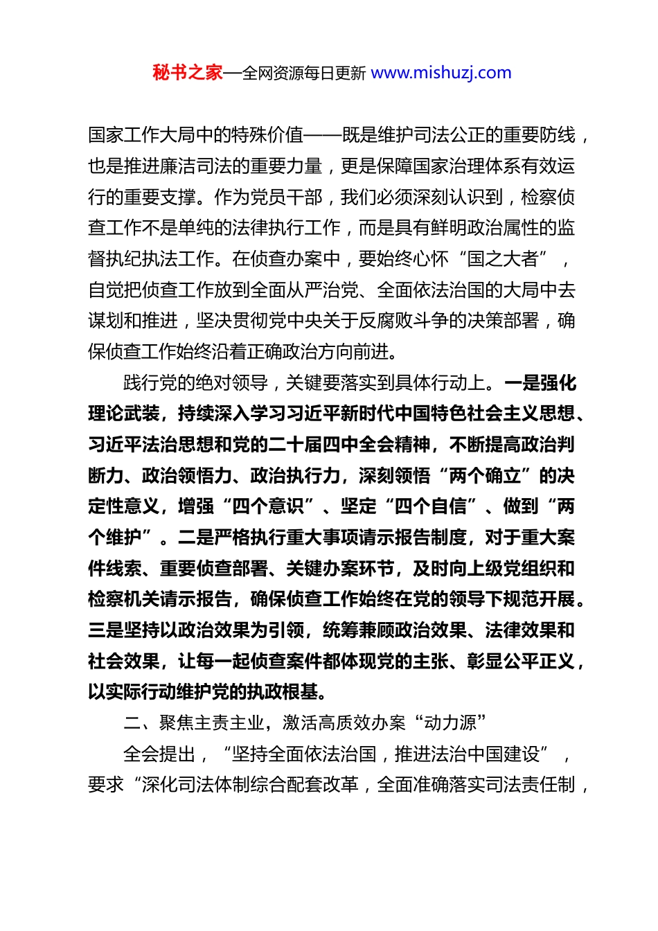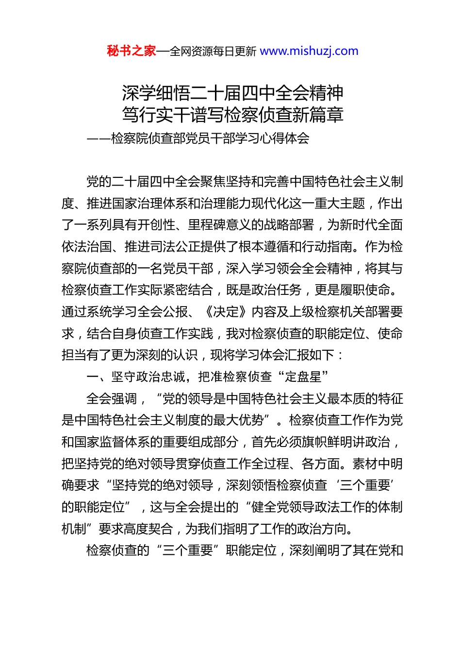 秘书之家—全网资源每日更新 www.mishuzj.com深学细悟二十届四中全会精神笃行实干谱写检察侦查新篇章——检察院侦查部党员干部学习心得体会党的二十届四中全会聚焦坚持和完善中国特色社会主义制度、推进国家治理体系和治理能力现代化这一重大主题,作出了一系列具有开创性、里程碑意义的战略部署,为新时代全面依法治国、推进司法公正提供了根本遵循和行动指南。作为检察院侦查部的一名党员干部,深入学习领会全会精神,将其与检察侦查工作实际紧密结合,既是政治任务,更是履职使命。通过系统学习全会公报、《决定》内容及上级检察机关部署要求,结合自身侦查工作实践,我对检察侦查的职能定位、使命担当有了更为深刻的认识,现将学习体会汇报如下:一、坚守政治忠诚,把准检察侦查“定盘星”全会强调,“党的领导是中国特色社会主义最本质的特征是中国特色社会主义制度的最大优势”。检察侦查工作作为党和国家监督体系的重要组成部分,首先必须旗帜鲜明讲政治,把坚持党的绝对领导贯穿侦查工作全过程、各方面。素材中明确要求“坚持党的绝对领导,深刻领悟检察侦查‘三个重要’的职能定位”,这与全会提出的“健全党领导政法工作的体制机制”要求高度契合,为我们指明了工作的政治方向。检察侦查的“三个重要”职能定位,深刻阐明了其在党和秘书之家—全网资源每日更新 www.mishuzj.com国家工作大局中的特殊价值——既是维护司法公正的重要防线,也是推进廉洁司法的重要力量,更是保障国家治理体系有效运行的重要支撑。作为党员干部,我们必须深刻认识到,检察侦查工作不是单纯的法律执行工作,而是具有鲜明政治属性的监督执纪执法工作。在侦查办案中,要始终心怀“国之大者”,自觉把侦查工作放到全面从严治党、全面依法治国的大局中去谋划和推进,坚决贯彻党中央关于反腐败斗争的决策部署,确保侦查工作始终沿着正确政治方向前进。践行党的绝对领导,关键要落实到具体行动上。一是强化理论武装,持续深入学习习近平新时代中国特色社会主义思想、习近平法治思想和党的二十届四中全会精神,不断提高政治判断力、政治领悟力、政治执行力,深刻领悟“两个确立”的决定性意义,增强“四个意识”、坚定“四个自信”、做到“两个维护”。二是严格执行重大事项请示报告制度,对于重大案件线索、重要侦查部署、关键办案环节,及时向上级党组织和检察机关请示报告,确保侦查工作始终在党的领导下规范开展。三是坚持以政治效果为引领,统筹兼顾政治效果、法律效果和社会效果,让每一起侦查案件都体现党的主张、彰显公平正义,以实际行动维护党的执政根基。二、聚焦主责主业,激活高质效办案“动力源”全会提出,“坚持全面依法治国,推进法治中国建设”,要求“深化司法体制综合配套改革,全面准确落实司法责任制,秘书之家—全网资源每日更新 www.mishuzj.com加快建设公正高效权威的社会主义司法制度”。检察侦查工作作为司法监督的重要环节,其核心职责是查办司法工作人员相关职务犯罪,维护司法廉洁和公正。素材中“突出重点,有案必办,以‘三个善于’确保立办有力度有质效的案件”的要求,正是对全会精神的具体落实,为我们提升办案质效指明了路径。突出办案重点,彰显侦查力度。当前,司法领域的腐败问题仍是人民群众反映强烈的突出问题,直接损害司法公信力和法治权威。作为检察侦查干部,我们必须坚持问题导向,聚焦司法工作人员滥用职权、玩忽职守、徇私枉法等职务犯罪,特别是对影响重大、社会关注度高的案件,要敢于亮剑、一查到底。要树立“人人都是侦查员”的理念,打破部门壁垒和思维定势,主动拓展案源渠道——既要重视群众举报、上级交办、部门移送的线索,也要善于从日常监督、案件评查、信访接待中发现隐藏的犯罪线索,确保“有案必立、有案必办”,让腐败分子无处遁形。践行“三个善于”,提升办案质效。高质效办案是检察侦查工作的生命线,也是全会要求的“公正高效权威”的具体体现。一是善于做实做细初查工作,初查是侦查工作的基础,直接关系到案件的成败。要坚持“依法稳慎、务必搞准”的总体要求,运用合规合法的初查手段,全面收集固定证据,准确研判案件性...