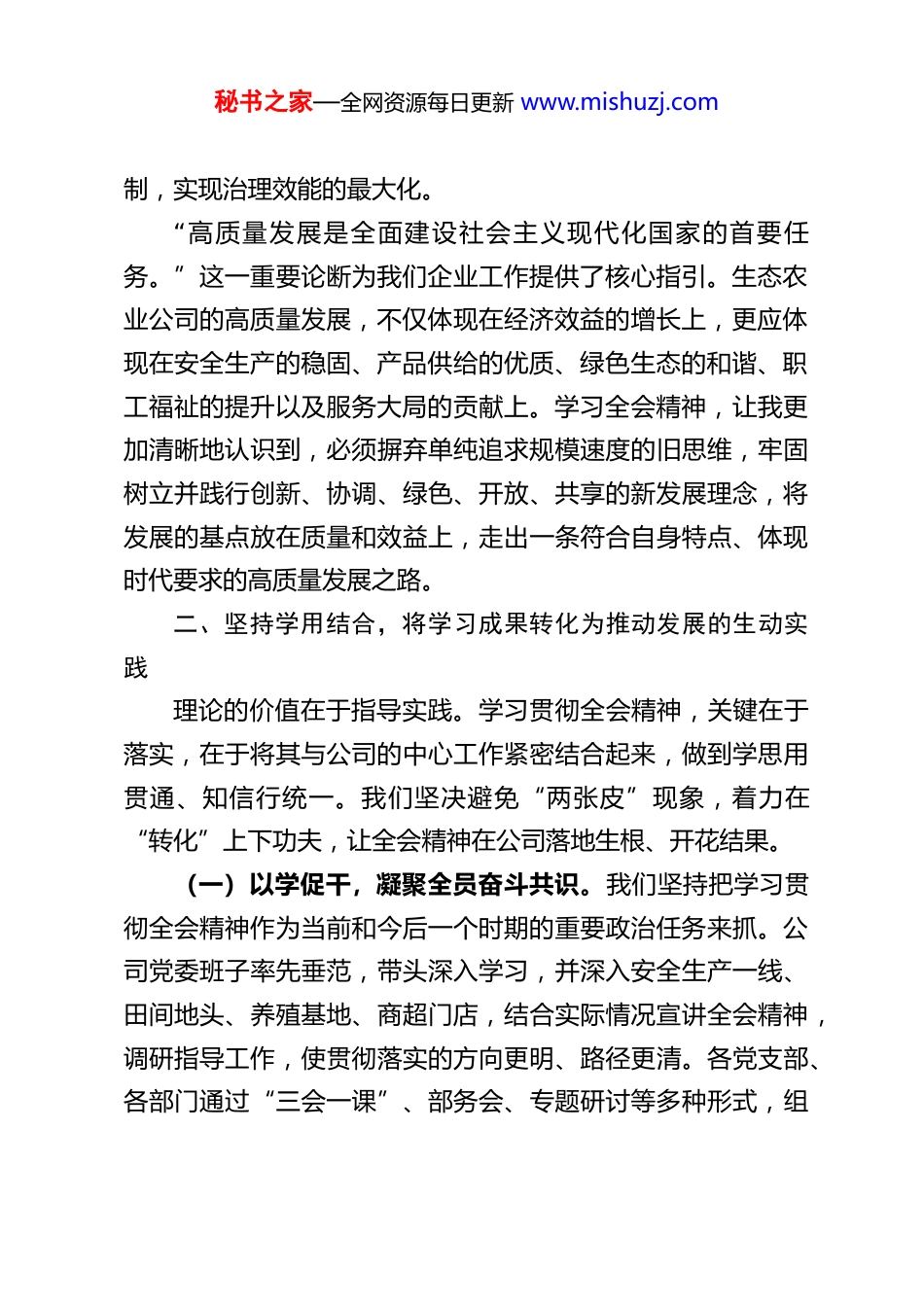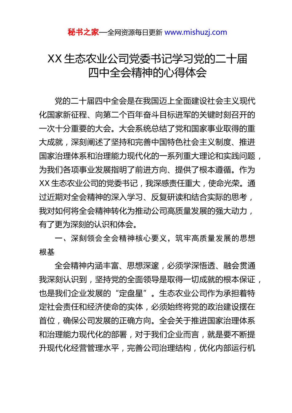 秘书之家—全网资源每日更新 www.mishuzj.comXX 生态农业公司党委书记学习党的二十届四中全会精神的心得体会党的二十届四中全会是在我国迈上全面建设社会主义现代化国家新征程、向第二个百年奋斗目标进军的关键时刻召开的一次十分重要的大会。大会系统总结了党和国家事业取得的重大成就,深刻阐述了坚持和完善中国特色社会主义制度、推进国家治理体系和治理能力现代化的一系列重大理论和实践问题,为我们各项事业发展指明了前进方向、提供了根本遵循。作为XX 生态农业公司的党委书记,我深感责任重大,使命光荣。通过近期对全会精神的深入学习、反复研读和结合实际的思考,我对如何将全会精神转化为推动公司高质量发展的强大动力,有了更为深刻的认识和体会。一、深刻领会全会精神核心要义,筑牢高质量发展的思想根基全会精神内涵丰富、思想深邃,必须学深悟透、融会贯通我深刻认识到,坚持党的全面领导是取得一切成就的根本保证,也是我们企业发展的“定盘星”。生态农业公司作为承担着特定社会责任和经济使命的实体,必须始终将党的政治建设摆在首位,确保公司发展的正确方向。全会关于推进国家治理体系和治理能力现代化的部署,对于我们企业而言,就是要不断提升现代化经营管理水平,完善公司治理结构,优化内部运行机秘书之家—全网资源每日更新 www.mishuzj.com制,实现治理效能的最大化。“高质量发展是全面建设社会主义现代化国家的首要任务。”这一重要论断为我们企业工作提供了核心指引。生态农业公司的高质量发展,不仅体现在经济效益的增长上,更应体现在安全生产的稳固、产品供给的优质、绿色生态的和谐、职工福祉的提升以及服务大局的贡献上。学习全会精神,让我更加清晰地认识到,必须摒弃单纯追求规模速度的旧思维,牢固树立并践行创新、协调、绿色、开放、共享的新发展理念,将发展的基点放在质量和效益上,走出一条符合自身特点、体现时代要求的高质量发展之路。二、坚持学用结合,将学习成果转化为推动发展的生动实践理论的价值在于指导实践。学习贯彻全会精神,关键在于落实,在于将其与公司的中心工作紧密结合起来,做到学思用贯通、知信行统一。我们坚决避免“两张皮”现象,着力在“转化”上下功夫,让全会精神在公司落地生根、开花结果。(一)以学促干,凝聚全员奋斗共识。我们坚持把学习贯彻全会精神作为当前和今后一个时期的重要政治任务来抓。公司党委班子率先垂范,带头深入学习,并深入安全生产一线、田间地头、养殖基地、商超门店,结合实际情况宣讲全会精神,调研指导工作,使贯彻落实的方向更明、路径更清。各党支部、各部门通过“三会一课”、部务会、专题研讨等多种形式,组秘书之家—全网资源每日更新 www.mishuzj.com织广大党员和职工深入学习、交流体会,引导大家将会议精神内化于心、外化于行,融入到日常的业务开展、技术攻关、服务提升和隐患排查等具体工作中。同时,我们充分利用现代信息技术,通过微信公众号等平台,及时推送图文解读、知识要点、有声读物等学习资料,方便职工利用碎片化时间进行自主学习,营造了“人人学、时时学、处处学”的浓厚氛围,进一步凝聚了“聚焦目标、完成任务”的思想共识和行动合力。(二)聚焦“六位一体”,筑牢安全经营双防线。全会强调要统筹发展和安全。我们深刻领会这一精神,将其具体落实到推进“六位一体”安全支撑体系建设中。安全是发展的前提,我们始终绷紧安全生产这根弦,将安全基础管理摆在突出位置。今年以来,公司组织开展了覆盖用电安全、消防安全、设施大棚、水面种植、渡船运行、门店运营等各环节的全面安全检查20 余次,对发现的风险隐患建立台账、明确责任、限期整改,形成了闭环管理,有效筑牢了安全防线,为生产经营活动的正常开展提供了坚实保障。在经营创效方面,我们以全会精神激发干事创业的精气神持续在挖潜增效上做文章。一是优化农业产业结构。我们科学规划果蔬种植,按计划完成了 71.8 亩的定植任务,并积极引种试种了“中科蜜 6 号”网纹甜瓜、“大黄冰糖脆”甜瓜、“青甜 2 号”小番茄等 5 个市场潜力大、经济效益好的新品种,丰富了产品品类,提升了市场...