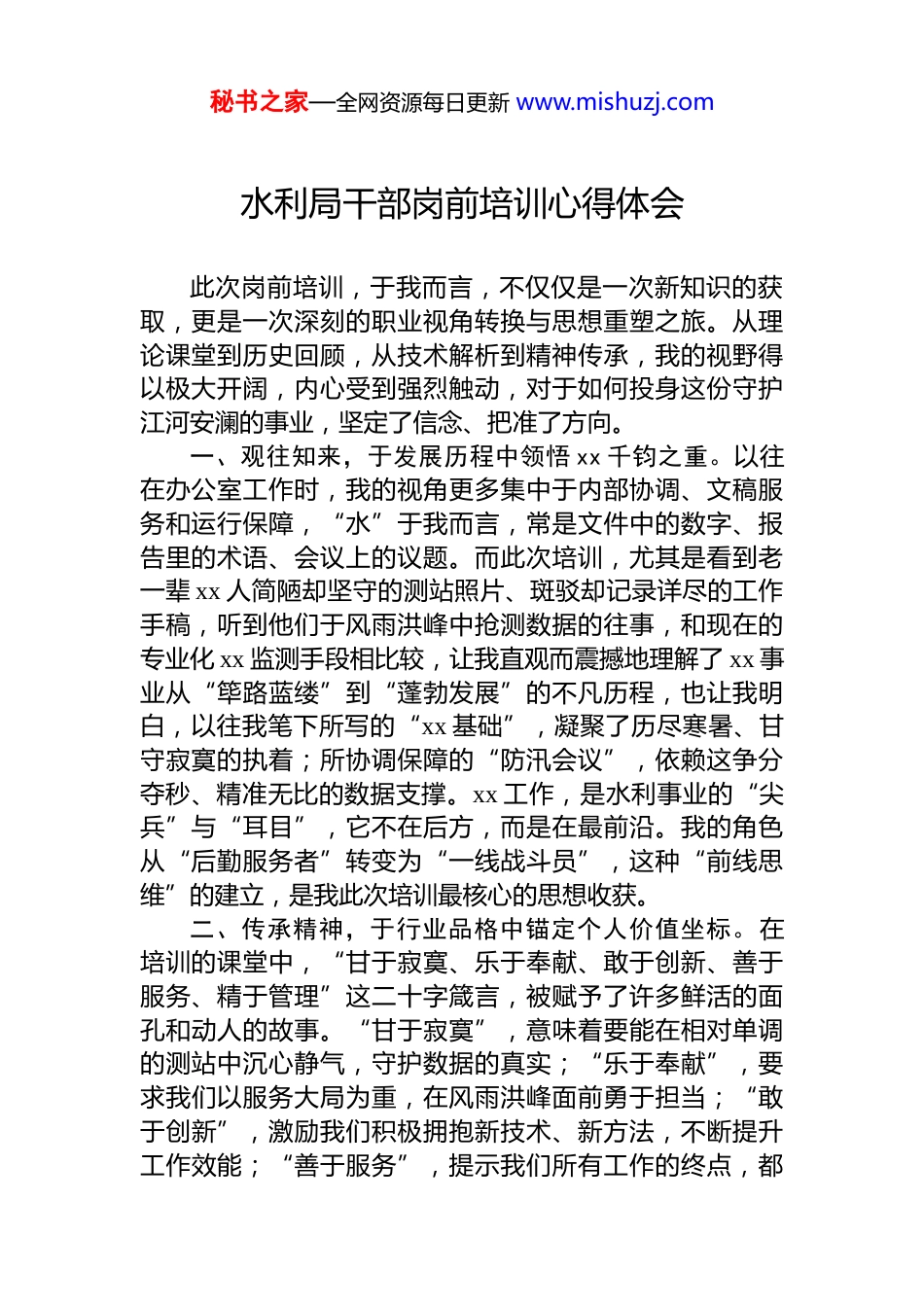 秘书之家—全网资源每日更新 www.mishuzj.com水利局干部岗前培训心得体会此次岗前培训,于我而言,不仅仅是一次新知识的获取,更是一次深刻的职业视角转换与思想重塑之旅。从理论课堂到历史回顾,从技术解析到精神传承,我的视野得以极大开阔,内心受到强烈触动,对于如何投身这份守护江河安澜的事业,坚定了信念、把准了方向。一、观往知来,于发展历程中领悟 xx 千钧之重。以往在办公室工作时,我的视角更多集中于内部协调、文稿服务和运行保障,“水”于我而言,常是文件中的数字、报告里的术语、会议上的议题。而此次培训,尤其是看到老一辈 xx 人简陋却坚守的测站照片、斑驳却记录详尽的工作手稿,听到他们于风雨洪峰中抢测数据的往事,和现在的专业化 xx 监测手段相比较,让我直观而震撼地理解了 xx 事业从“筚路蓝缕”到“蓬勃发展”的不凡历程,也让我明白,以往我笔下所写的“xx 基础”,凝聚了历尽寒暑、甘守寂寞的执着;所协调保障的“防汛会议”,依赖这争分夺秒、精准无比的数据支撑。xx 工作,是水利事业的“尖兵”与“耳目”,它不在后方,而是在最前沿。我的角色从“后勤服务者”转变为“一线战斗员”,这种“前线思维”的建立,是我此次培训最核心的思想收获。二、传承精神,于行业品格中锚定个人价值坐标。在培训的课堂中,“甘于寂寞、乐于奉献、敢于创新、善于服务、精于管理”这二十字箴言,被赋予了许多鲜活的面孔和动人的故事。“甘于寂寞”,意味着要能在相对单调的测站中沉心静气,守护数据的真实;“乐于奉献”,要求我们以服务大局为重,在风雨洪峰面前勇于担当;“敢于创新”,激励我们积极拥抱新技术、新方法,不断提升工作效能;“善于服务”,提示我们所有工作的终点,都秘书之家—全网资源每日更新 www.mishuzj.com是为了更好地支撑决策,服务好社会经济发展;“精于管理”,则强调要以科学严谨的态度,对待每一次的测量、计算、整编和分析。我将自觉以老 xx 人为榜样,在日复一日的观测中积蓄耐力,在服务决策与社会的需求中激发动力,让“奉献”成为行动自觉,让“创新”服务于提升工作效率与预报精度。并以这二十字箴言为镜,不断审视和提升自我,真正做到内化于心、外化于行。三、知行合一,于笃行实干中锤炼过硬专业本领。面对这份事业,空有热情远远不够,必须以扎实的行动将培训所得转化为实际工作能力。首先,要沉下心学习,完成从“门外汉”到“内行人”的跨越。以“空杯心态”重新出发,向规范学、向老同志学、在实践中学,尽快弥补专业短板,熟练掌握 xx 测验、资料整编等核心业务的理论知识。其次,要俯下身实践,完成从“新兵”到“合格战斗员”的转变。告别办公室的相对“恒定”,践行“脚沾泥土”的一线工作法,主动适应 xx 站点分布广、野外作业多、应急任务重的工作特点。不怕艰苦,参与完整的测验流程在具体的行动中真切感受江河脉搏,理解数据产生的每一个环节。在实践中将理论吃透、将技能练精。此次培训是终点,更是起点,从“舞文弄墨”的办公室到“测风量雨”的 xx 一线,变的是工作岗位和环境,不变的是对水利事业的忠诚与热爱。我已做好准备,将此次培训的收获转化为前进的动力,以归零的心态重新出发,在新的岗位上,用脚步丈量江河,用数据书写忠诚,努力为 xxxx 事业的发展添砖加瓦,在守望江河、服务人民的征程中,书写无愧于时代的职业篇章。