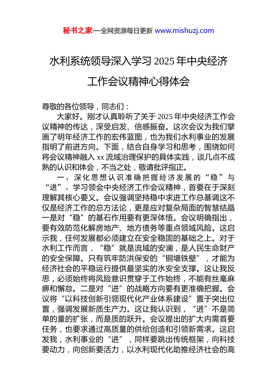 秘书之家—全网资源每日更新 www.mishuzj.com水利系统领导深入学习 2025 年中央经济工作会议精神心得体会尊敬的各位领导,同志们:大家好。刚才认真聆听了关于 2025 年中央经济工作会议精神的传达,深受启发、倍感振奋。这次会议为我们擘画了明年经济工作的宏伟蓝图,也为我们水利事业的发展指明了前进方向。下面,结合自身学习和思考,围绕如何将会议精神融入 xx 流域治理保护的具体实践,谈几点不成熟的认识和体会,不当之处,敬请批评指正。一、深化思想认识准确把握经济发展的“稳”与“进”。学习领会中央经济工作会议精神,首要在于深刻理解其核心要义。会议强调坚持稳中求进工作总基调这不仅是经济工作的总方法论,更是应对复杂局面的智慧结晶一是对“稳”的基石作用要有更深体悟。会议明确指出,要有效防范化解房地产、地方债务等重点领域风险。这启示我,任何发展都必须建立在安全稳固的基础之上。对于水利工作而言,“稳”就是流域的安澜,是人民生命财产的安全保障。只有筑牢防洪保安的“铜墙铁壁”,才能为经济社会的平稳运行提供最坚实的水安全支撑。这让我反思,必须始终将风险意识贯穿于工作始终,不能有丝毫麻痹和懈怠。二是对“进”的战略方向要有更准确把握。会议将“以科技创新引领现代化产业体系建设”置于突出位置,强调发展新质生产力。这让我认识到,“进”不是简单的量的扩张,而是质的跃升。会议提出的扩大内需首要任务,也要求通过高质量的供给创造和引领新需求。这启发我,水利事业的“进”,同样要跳出传统框架,向科技要动力,向创新要活力,以水利现代化助推经济社会的高秘书之家—全网资源每日更新 www.mishuzj.com质量发展。三是对“稳”与“进”的辩证关系要有更强自觉。会议提出的“做优增量、盘活存量”正是“稳”与“进”辩证统一的生动体现。这让我联想到 xx 流域的治理工作,既要通过建设重大工程来优化水资源配置、做优发展“增量”,也要通过精细化调度、数字化管理来盘活现有工程的巨大潜力,提升水资源利用效率,实现存量资产的效益最大化。处理好两者的关系,是推动流域保护治理可持续发展的关键。二、立足流域实际主动融入高质量发展新格局。作为一名水利工作者,学习会议精神,关键在于找到贯彻落实的切入点和着力点。中央经济工作会议为我们描绘了国家经济发展的宏图,而我们的职责,就是在这幅宏图中找准水利坐标,主动担当作为。一是找准水利在扩大内需中的支撑点。会议再次强调把扩大内需作为首要任务。水利工程建设投资规模大、产业链条长、带动效应强,是扩大有效投资的重要领域。根据预测,2025 年全国水利建设投资规模有望达到 1.5 万亿元。这对我们既是机遇也是责任。xx单位承担的进一步治理 xx 河流 38 项工程等任务,不仅是水利工程,更是重要的民生工程、发展工程。加快推进这些重大工程建设,本身就是对扩大内需最直接、最有效的贡献,每投资 1000 亿元,就能带动 gdp 增长 0.15 个百分点,并创造大量就业岗位。二是找准水利在统筹发展和安全中的关键点。会议强调要更好统筹发展和安全。水安全是国家安全体系的重要组成部分,水旱灾害防御事关人民群众生命财产安全和经济社会发展全局。xx 流域地处南北气候过渡带,水旱灾害频发。落实会议精神,就是要坚决扛起防汛抗旱的天职,加快完善以水库、河道及堤防、蓄滞洪区为主要组成的现代化流域防洪减灾体系,确保流域安澜为经济社会发展营造安全稳定的环境。这既是必须守住的安全底线,也是推动高质量发展的基本前提。三是找准水利在发展新质生产力中的结合点。会议强调要以科技创新秘书之家—全网资源每日更新 www.mishuzj.com推动产业创新。在水利领域,新质生产力就是智慧水利。正如 xx 单位正在系统深化的数字孪生 xx 河流建设,就是将大数据、人工智能等前沿技术与水利业务深度融合,实现对流域物理状态的实时模拟、精准预测和智能决策。这不仅能革命性地提升防洪调度、水资源管理的效率和水平,更是水利行业自身转型升级、迈向现代化的必由之路。发展水利新质生产力,正是我们服务和融入新发展格局的具体行动。三、强化责任担当奋力谱...