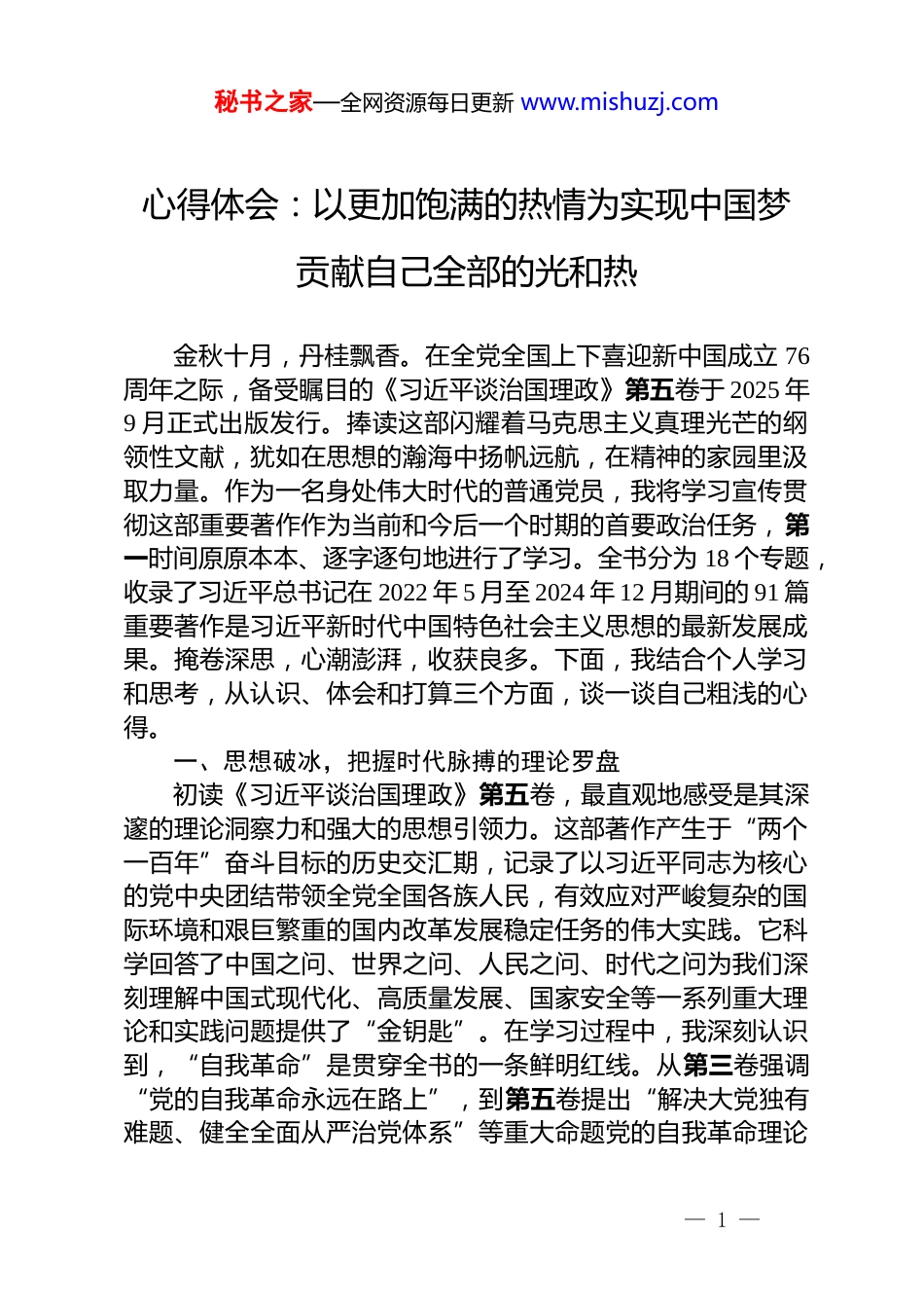 秘书之家—全网资源每日更新 www.mishuzj.com心得体会:以更加饱满的热情为实现中国梦贡献自己全部的光和热金秋十月,丹桂飘香。在全党全国上下喜迎新中国成立 76周年之际,备受瞩目的《习近平谈治国理政》第五卷于 2025 年9 月正式出版发行。捧读这部闪耀着马克思主义真理光芒的纲领性文献,犹如在思想的瀚海中扬帆远航,在精神的家园里汲取力量。作为一名身处伟大时代的普通党员,我将学习宣传贯彻这部重要著作作为当前和今后一个时期的首要政治任务,第一时间原原本本、逐字逐句地进行了学习。全书分为 18 个专题,收录了习近平总书记在 2022 年 5 月至 2024 年 12 月期间的 91 篇重要著作是习近平新时代中国特色社会主义思想的最新发展成果。掩卷深思,心潮澎湃,收获良多。下面,我结合个人学习和思考,从认识、体会和打算三个方面,谈一谈自己粗浅的心得。一、思想破冰,把握时代脉搏的理论罗盘初读《习近平谈治国理政》第五卷,最直观地感受是其深邃的理论洞察力和强大的思想引领力。这部著作产生于“两个一百年”奋斗目标的历史交汇期,记录了以习近平同志为核心的党中央团结带领全党全国各族人民,有效应对严峻复杂的国际环境和艰巨繁重的国内改革发展稳定任务的伟大实践。它科学回答了中国之问、世界之问、人民之问、时代之问为我们深刻理解中国式现代化、高质量发展、国家安全等一系列重大理论和实践问题提供了“金钥匙”。在学习过程中,我深刻认识到,“自我革命”是贯穿全书的一条鲜明红线。从第三卷强调“党的自我革命永远在路上”,到第五卷提出“解决大党独有难题、健全全面从严治党体系”等重大命题党的自我革命理论— 1 —秘书之家—全网资源每日更新 www.mishuzj.com体系在实践中不断丰富和发展。特别是书中系统阐述了深入推进自我革命“九个以”的实践要求这标志着党对如何跳出历史周期率的“第二个答案”的认识达到了新的高度。这让我明白,自我革命不是一句空洞的口号,而是具体的、实践的。它要求我们必须坚持和加强党中央集中统一领导,以刮骨疗毒的勇气和刀刃向内的自觉,不断清除一切侵蚀党的健康肌体的病毒。通过学习,我更加清醒地认识到,当前世界百年未有之大变局加速演进,我国发展进入战略机遇和风险挑战并存、不确定难预料因素增多的时期。面对风高浪急甚至是惊涛骇浪的重大考验,只有时刻保持解决大党独有难题的清醒和坚定,把党的伟大自我革命进行到底,才能确保党在新时代坚持和发展中国特色社会主义的历史进程中始终成为坚强领导核心。这部著作,正是指引我们在迷雾中辨明方向、在挑战中抓住机遇的思想罗盘,其出版标志着党的创新理论体系更加完整、系统和全面。二、内心触动,感悟人民至上的赤子情怀如果说理论的深度决定了认识的高度,那么情感的温度则决定了信仰的牢度。《习近平谈治国理政》第五卷不仅是一部博大精深的理论著作,更是一部饱含深情的为民实录。字里行间充盈着“江山就是人民,人民就是江山”的赤子情怀,彰显着“我将无我,不负人民”的使命担当。学习中,书中一幅幅生动的照片深深打动了我。全书精选的 41 幅图片定格了习近平总书记深入田间地头、工厂车间、社区家庭的温暖瞬间。这些画面与闪耀着思想光辉的文字相互映照,让我感受到理论的根脉深深植根于人民群众的沃土之中。理论不再是冰冷的条文,而是带着泥土芬芳、充满人间烟火的真切话语。这让我深刻体会到,党的理论创新成果之所以具有强大的生命力,正是因为它始终坚持人民至上,始终与人民同呼吸、共命运、心连心。这种情感上的共鸣,让我对自己作为一名共产党员的身份有了更深地理解。中国共产党之所以拥有自我革命的非凡勇气,根— 2 —秘书之家—全网资源每日更新 www.mishuzj.com源在于党除了国家、民族、人民的利益,没有任何自己的特殊利益。不忘初心、牢记使命,不是一句挂在嘴边的漂亮话,而是融入血脉的价值追求。第五卷的学习,对我而言是一次深刻的党性教育和灵魂洗礼。它让我不断反躬自省:我的初心是否依旧炽热?我的使命感是否有所淡化?在日常工作中,是否真正做到了想群众之所想,急群众之所急?这种触及灵魂的拷问...