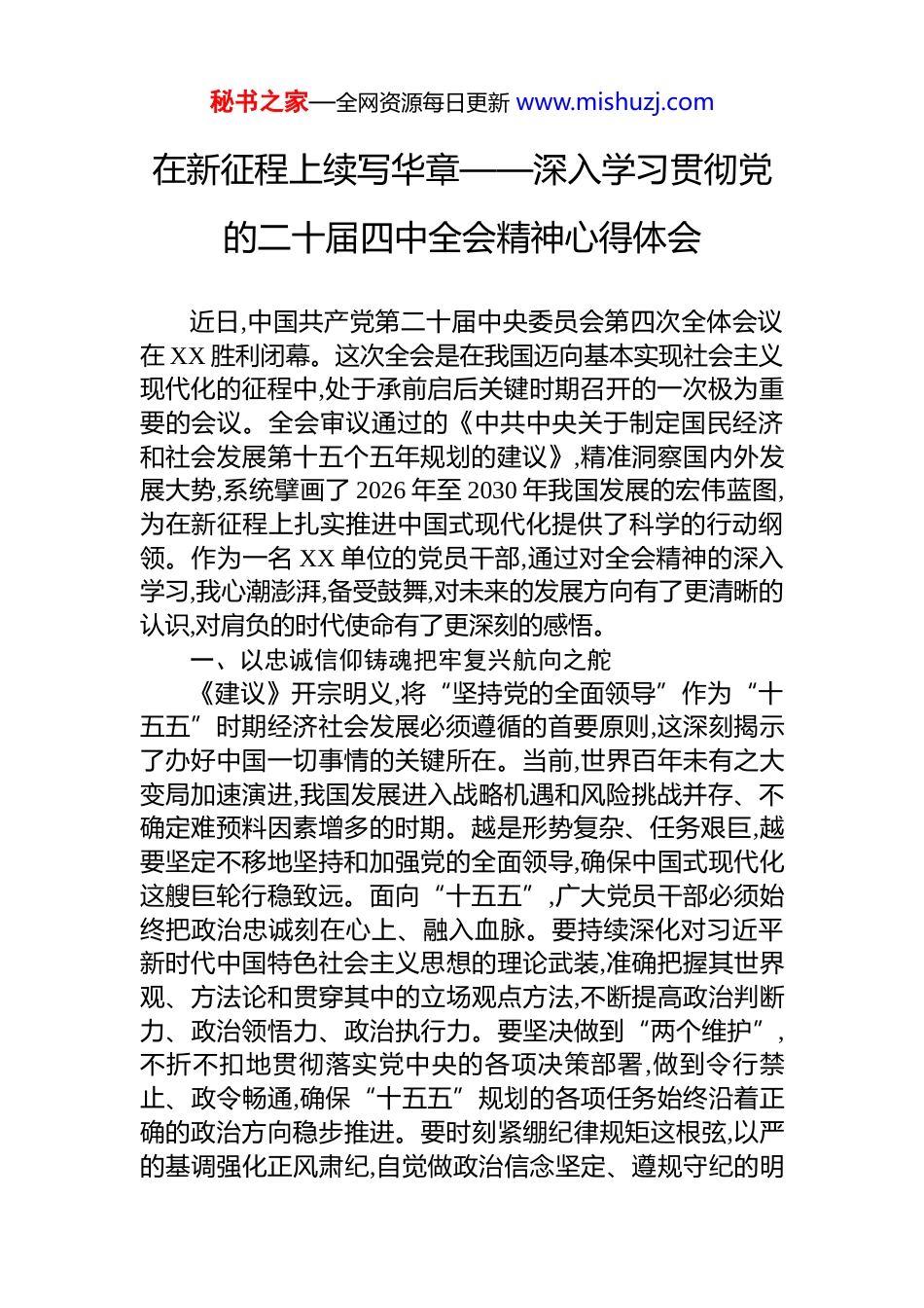 秘书之家—全网资源每日更新 www.mishuzj.com在新征程上续写华章——深入学习贯彻党的二十届四中全会精神心得体会近日,中国共产党第二十届中央委员会第四次全体会议在 XX 胜利闭幕。这次全会是在我国迈向基本实现社会主义现代化的征程中,处于承前启后关键时期召开的一次极为重要的会议。全会审议通过的《中共中央关于制定国民经济和社会发展第十五个五年规划的建议》,精准洞察国内外发展大势,系统擘画了 2026 年至 2030 年我国发展的宏伟蓝图,为在新征程上扎实推进中国式现代化提供了科学的行动纲领。作为一名 XX 单位的党员干部,通过对全会精神的深入学习,我心潮澎湃,备受鼓舞,对未来的发展方向有了更清晰的认识,对肩负的时代使命有了更深刻的感悟。一、以忠诚信仰铸魂把牢复兴航向之舵《建议》开宗明义,将“坚持党的全面领导”作为“十五五”时期经济社会发展必须遵循的首要原则,这深刻揭示了办好中国一切事情的关键所在。当前,世界百年未有之大变局加速演进,我国发展进入战略机遇和风险挑战并存、不确定难预料因素增多的时期。越是形势复杂、任务艰巨,越要坚定不移地坚持和加强党的全面领导,确保中国式现代化这艘巨轮行稳致远。面向“十五五”,广大党员干部必须始终把政治忠诚刻在心上、融入血脉。要持续深化对习近平新时代中国特色社会主义思想的理论武装,准确把握其世界观、方法论和贯穿其中的立场观点方法,不断提高政治判断力、政治领悟力、政治执行力。要坚决做到“两个维护”,不折不扣地贯彻落实党中央的各项决策部署,做到令行禁止、政令畅通,确保“十五五”规划的各项任务始终沿着正确的政治方向稳步推进。要时刻紧绷纪律规矩这根弦,以严的基调强化正风肃纪,自觉做政治信念坚定、遵规守纪的明秘书之家—全网资源每日更新 www.mishuzj.com白人,让党的领导这一最大制度优势在实践中得到最充分的彰彰。二、以实干担当固本夯实高质量发展之基发展是党执政兴国的第一要务,高质量发展是全面建设社会主义现代化国家的首要任务。《建议》明确指出,“十五五”时期要推动经济实现质的有效提升和量的合理增长,这为未来五年的发展定下了清晰的主基调。宏伟蓝图不可能一蹴而就,必须依靠实干担当才能变为美好现实。党员干部作为改革发展的中坚力量,必须摒弃“等靠要”思想,以钉钉子精神狠抓落实。要坚持眼睛向下、脚步向下,主动深入基层一线,到项目建设的前沿、服务群众的窗口、矛盾集中的地方去察实情、听真话、找症结,把情况摸透、把问题找准、把对策提实。要聚焦发展的核心任务和瓶颈制约,紧扣加快实现高水平科技自立自强、构建现代化产业体系、培育壮大新质生产力等战略任务,敢于动真碰硬,善于创新突破。在推动 XX 地区的产业转型升级中,就需要围绕产业链的薄弱环节,加大研发投入,攻克关键核心技术,提升产业链供应链的韧性和安全水平。要树立和践行正确的政绩观,坚持“功成不必在我、功成必定有我”,多做一些打基础、利长远、惠民生的实事,坚决反对形式主义、官僚主义,以实实在在的发展成效赢得人民群众的信任与支持。三、以人民至上立根践行初心使命之本江山就是人民,人民就是江山。《建议》将“坚持人民至上”列为必须遵循的重要原则,深刻彰显了我们党始终不变的为民情怀和价值追求。习近平总书记强调,中国式现代化,是全体人民共同富裕的现代化。奋进“十五五”,必须始终把人民放在心中最高位置,把实现好、维护好、发展好最广大人民根本利益作为一切工作的出发点和落脚点。要带着深厚感情去解决民生难题,聚焦就业增收、教育医疗、养老托育、住房保障等群众最关心、最直接、最现实的利益问题,推出更多暖民心、惠民生的务实举措。以 XX 市的城秘书之家—全网资源每日更新 www.mishuzj.com市更新项目为例,在规划改造老旧小区时,不仅要改善硬件设施,更要充分听取居民意见,增设社区食堂、老年活动中心、普惠托育机构等公共服务设施,让发展成果更多更公平惠及全体人民,不断增强人民群众的获得感、幸福感、安全感。要坚持问计于民、问需于民,健全群众参与基层社会治理的制度化渠道,搭建线上线下联动的议事平台,把群众的“金点子”转化为破解发展难题的“金钥匙”。要着力...