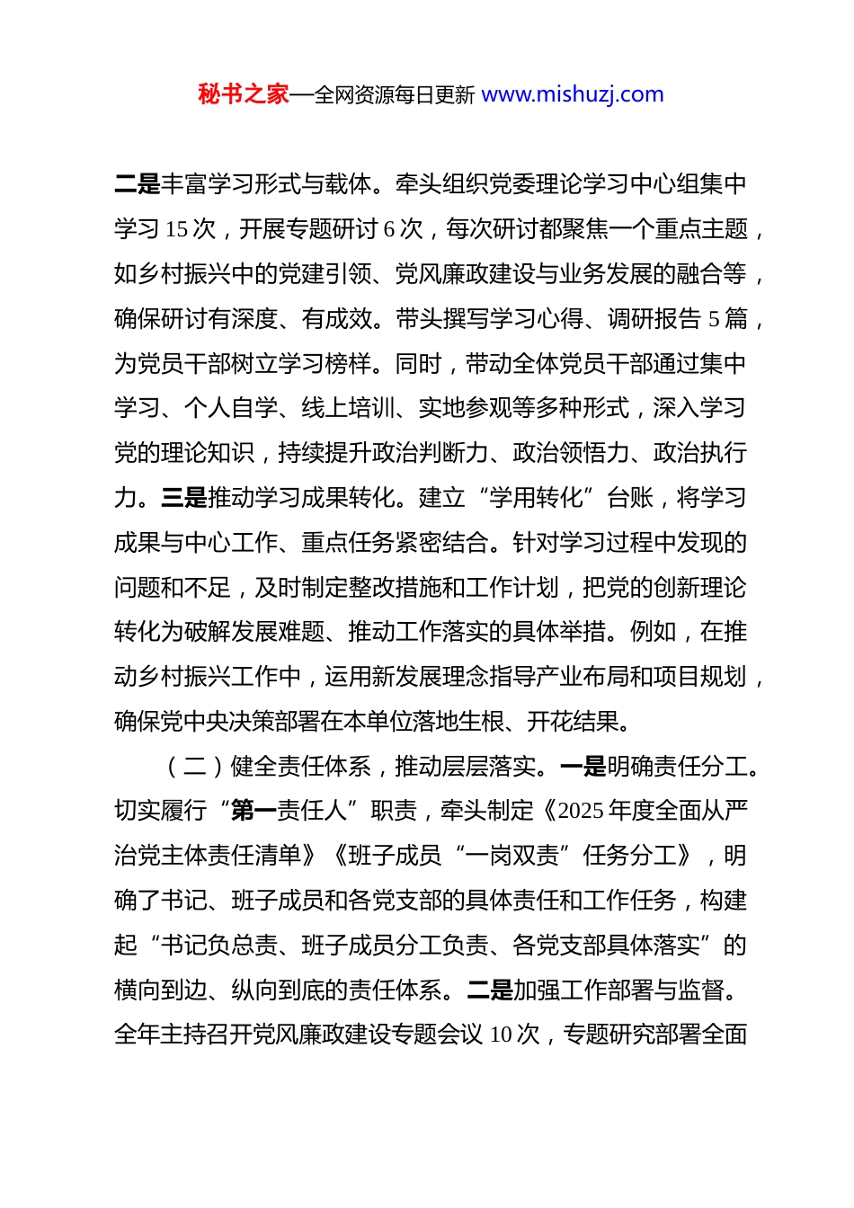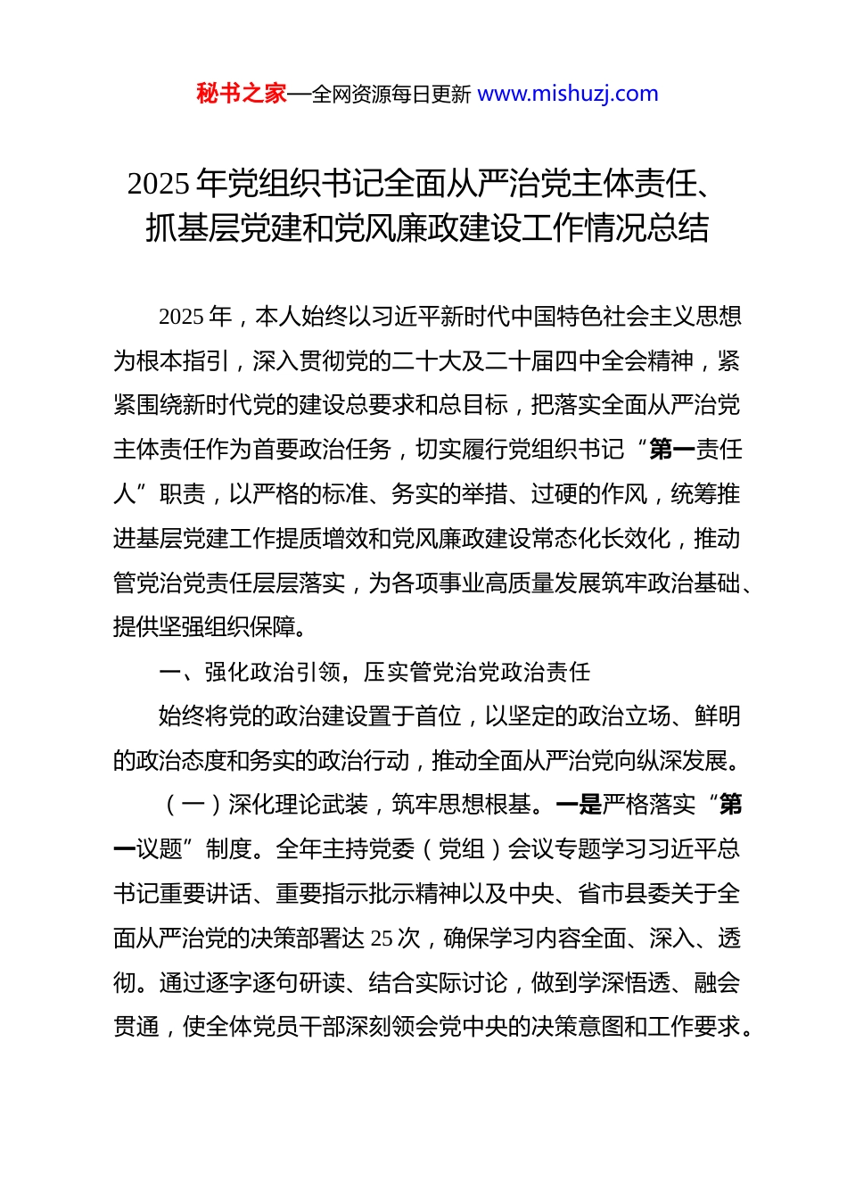 秘书之家—全网资源每日更新 www.mishuzj.com2025 年党组织书记全面从严治党主体责任、抓基层党建和党风廉政建设工作情况总结 2025 年,本人始终以习近平新时代中国特色社会主义思想为根本指引,深入贯彻党的二十大及二十届四中全会精神,紧紧围绕新时代党的建设总要求和总目标,把落实全面从严治党主体责任作为首要政治任务,切实履行党组织书记“第一责任人”职责,以严格的标准、务实的举措、过硬的作风,统筹推进基层党建工作提质增效和党风廉政建设常态化长效化,推动管党治党责任层层落实,为各项事业高质量发展筑牢政治基础、提供坚强组织保障。一、强化政治引领,压实管党治党政治责任始终将党的政治建设置于首位,以坚定的政治立场、鲜明的政治态度和务实的政治行动,推动全面从严治党向纵深发展。(一)深化理论武装,筑牢思想根基。一是严格落实“第一议题”制度。全年主持党委(党组)会议专题学习习近平总书记重要讲话、重要指示批示精神以及中央、省市县委关于全面从严治党的决策部署达 25 次,确保学习内容全面、深入、透彻。通过逐字逐句研读、结合实际讨论,做到学深悟透、融会贯通,使全体党员干部深刻领会党中央的决策意图和工作要求。秘书之家—全网资源每日更新 www.mishuzj.com二是丰富学习形式与载体。牵头组织党委理论学习中心组集中学习 15 次,开展专题研讨 6 次,每次研讨都聚焦一个重点主题,如乡村振兴中的党建引领、党风廉政建设与业务发展的融合等,确保研讨有深度、有成效。带头撰写学习心得、调研报告 5 篇,为党员干部树立学习榜样。同时,带动全体党员干部通过集中学习、个人自学、线上培训、实地参观等多种形式,深入学习党的理论知识,持续提升政治判断力、政治领悟力、政治执行力。三是推动学习成果转化。建立“学用转化”台账,将学习成果与中心工作、重点任务紧密结合。针对学习过程中发现的问题和不足,及时制定整改措施和工作计划,把党的创新理论转化为破解发展难题、推动工作落实的具体举措。例如,在推动乡村振兴工作中,运用新发展理念指导产业布局和项目规划,确保党中央决策部署在本单位落地生根、开花结果。(二)健全责任体系,推动层层落实。一是明确责任分工。切实履行“第一责任人”职责,牵头制定《2025 年度全面从严治党主体责任清单》《班子成员“一岗双责”任务分工》,明确了书记、班子成员和各党支部的具体责任和工作任务,构建起“书记负总责、班子成员分工负责、各党支部具体落实”的横向到边、纵向到底的责任体系。二是加强工作部署与监督。全年主持召开党风廉政建设专题会议 10 次,专题研究部署全面秘书之家—全网资源每日更新 www.mishuzj.com从严治党工作,分析形势、查找问题、制定措施。听取班子成员履责情况汇报 8 次,对班子成员、基层党支部书记开展谈心谈话、提醒谈话 40 余人次,及时发现并纠正苗头性、倾向性问题。通过定期汇报和谈话,督促各级责任人切实履行职责,确保工作落实到位。三是强化考核评价。坚持党建工作与业务工作同谋划、同部署、同推进、同考核,将全面从严治党工作纳入年度绩效考核核心内容,占比达到 X%。制定详细的考核指标和评价体系,对各级党组织和党员干部的工作进行量化考核。对考核结果优秀的进行表彰奖励,对考核不达标或存在严重问题的进行问责处理,层层传导压力,确保责任落实不打折扣、不走过场。二、聚焦基层党建,提升党组织凝聚力战斗力以提升组织力为重点,突出政治功能,全面加强基层党组织建设,推动基层党组织全面进步、全面过硬。(一)优化组织设置,健全组织体系。一是科学调整党组织设置。根据工作实际和党员分布情况,对基层党组织进行科学调整和优化。新建党支部 X 个,撤销合并党支部 X 个,确保党组织设置与工作需求相适应。同时,加强对党支部的标准化建设,规范党支部的工作流程和运行机制,提高党支部的工作效率和质量。二是加强党组织班子建设。选优配强党支部书记秘书之家—全网资源每日更新 www.mishuzj.com和班子成员,注重选拔政治素质高、工作能力强、群众威信好的党员担任党支部书记。全年举办党支部书记培训班 X...