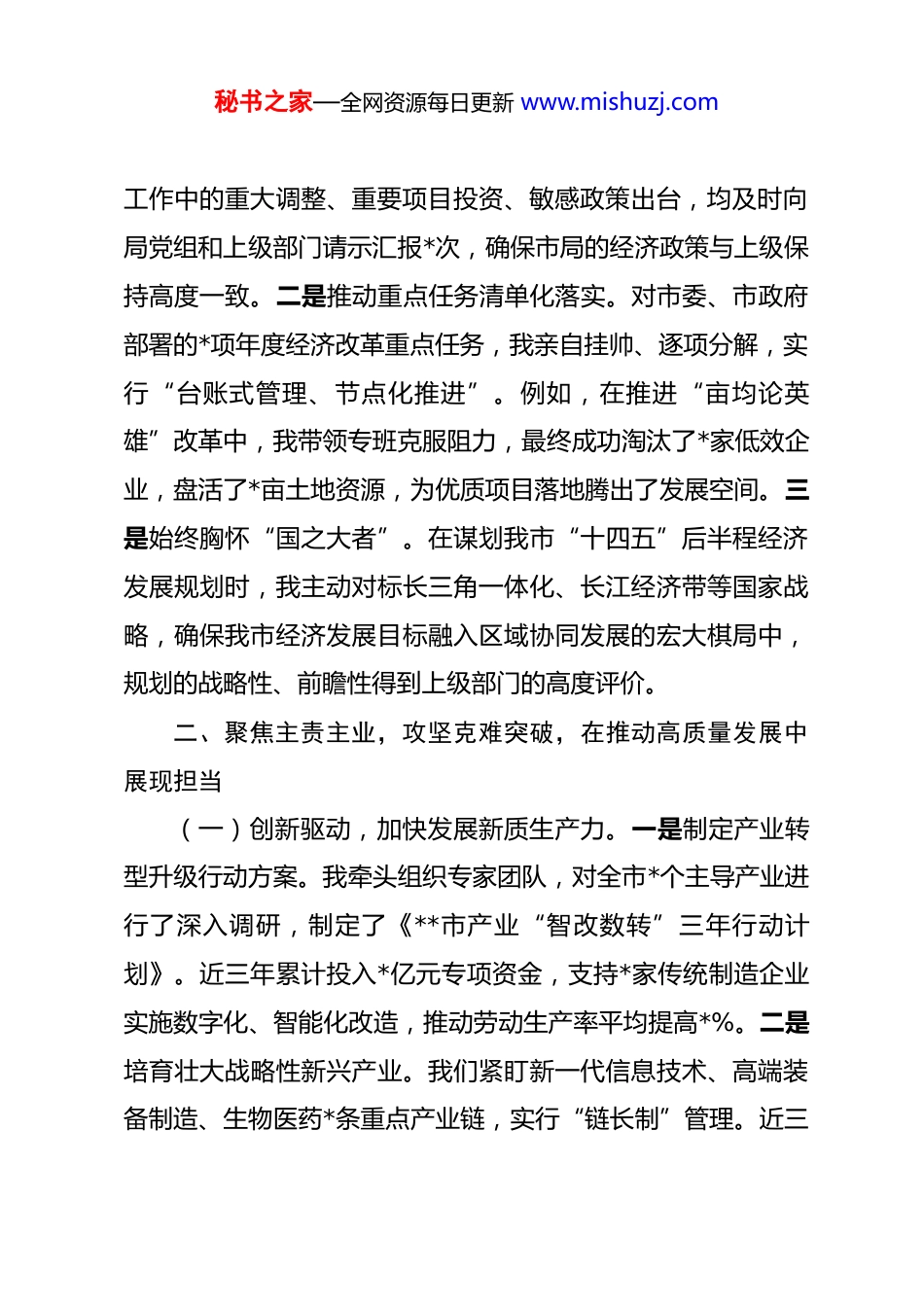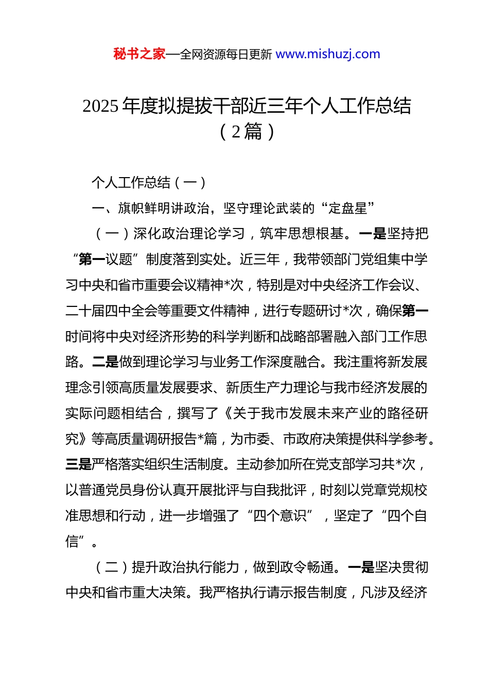 秘书之家—全网资源每日更新 www.mishuzj.com2025 年度拟提拔干部近三年个人工作总结(2 篇)个人工作总结(一)一、旗帜鲜明讲政治,坚守理论武装的“定盘星”(一)深化政治理论学习,筑牢思想根基。一是坚持把“第一议题”制度落到实处。近三年,我带领部门党组集中学习中央和省市重要会议精神*次,特别是对中央经济工作会议、二十届四中全会等重要文件精神,进行专题研讨*次,确保第一时间将中央对经济形势的科学判断和战略部署融入部门工作思路。二是做到理论学习与业务工作深度融合。我注重将新发展理念引领高质量发展要求、新质生产力理论与我市经济发展的实际问题相结合,撰写了《关于我市发展未来产业的路径研究》等高质量调研报告*篇,为市委、市政府决策提供科学参考。三是严格落实组织生活制度。主动参加所在党支部学习共*次,以普通党员身份认真开展批评与自我批评,时刻以党章党规校准思想和行动,进一步增强了“四个意识”,坚定了“四个自信”。(二)提升政治执行能力,做到政令畅通。一是坚决贯彻中央和省市重大决策。我严格执行请示报告制度,凡涉及经济秘书之家—全网资源每日更新 www.mishuzj.com工作中的重大调整、重要项目投资、敏感政策出台,均及时向局党组和上级部门请示汇报*次,确保市局的经济政策与上级保持高度一致。二是推动重点任务清单化落实。对市委、市政府部署的*项年度经济改革重点任务,我亲自挂帅、逐项分解,实行“台账式管理、节点化推进”。例如,在推进“亩均论英雄”改革中,我带领专班克服阻力,最终成功淘汰了*家低效企业,盘活了*亩土地资源,为优质项目落地腾出了发展空间。三是始终胸怀“国之大者”。在谋划我市“十四五”后半程经济发展规划时,我主动对标长三角一体化、长江经济带等国家战略,确保我市经济发展目标融入区域协同发展的宏大棋局中,规划的战略性、前瞻性得到上级部门的高度评价。二、聚焦主责主业,攻坚克难突破,在推动高质量发展中展现担当(一)创新驱动,加快发展新质生产力。一是制定产业转型升级行动方案。我牵头组织专家团队,对全市*个主导产业进行了深入调研,制定了《**市产业“智改数转”三年行动计划》。近三年累计投入*亿元专项资金,支持*家传统制造企业实施数字化、智能化改造,推动劳动生产率平均提高*%。二是培育壮大战略性新兴产业。我们紧盯新一代信息技术、高端装备制造、生物医药*条重点产业链,实行“链长制”管理。近三秘书之家—全网资源每日更新 www.mishuzj.com年成功引进*个高新技术项目,培育省级“专精特新”企业*家,使得新兴产业产值占规上工业产值的比重提升了*个百分点,为经济发展注入了新动能。三是强化科技创新平台建设。积极对接高校和科研院所,成功组建了*个新型研发机构和*个企业技术中心,推动*项重大科技成果在本地转化应用,为我市新质生产力的发展提供了坚实的技术支撑。(二)深化改革,持续优化营商环境。一是刀刃向内推进“放管服”改革。我主导推动了行政审批制度改革,将涉及企业注册、项目投资的*项高频事项进行流程再造,实现“一件事一次办”。目前,企业开办时间已压缩至*小时,企业群众办事满意度达到*%。二是创新监管模式提升服务效率。推广“互联网+监管”模式,建立了*个重点行业信用监管体系。通过事前指导、事中监管、事后评估,确保了监管的精准性和公正性,降低了企业的合规成本。三是落实要素市场化配置改革。推行“标准地+告知承诺制”出让模式,深化土地、资本、劳动力等要素市场化配置。近三年,通过优化配置,每亩土地的平均投资强度提升了*%,有效保障了优质项目的要素需求。(三)有效投资,全面增强经济发展后劲。一是坚持“项目为王”理念。我带领团队构建了“谋划一批、储备一批、开工一批、投产一批”的良性项目滚动机制,近三年储备重点项秘书之家—全网资源每日更新 www.mishuzj.com目*个,总投资超过*亿元。二是强化投资项目全生命周期服务。建立重大项目绿色通道,为总投资*亿元以上的*个项目提供“保姆式”服务,实行并联审批、容缺受理,确保项目从立项到开工的平均时间缩短了*%,形成了更多的实物工作量。三是积极争取外...