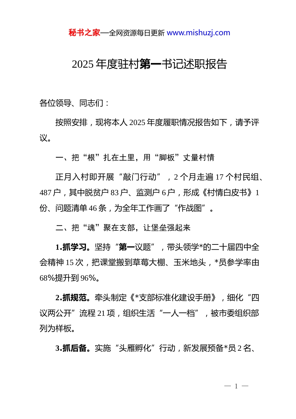 秘书之家—全网资源每日更新 www.mishuzj.com2025 年度驻村第一书记述职报告各位领导、同志们:按照安排,现将本人 2025 年度履职情况报告如下,请予评议。一、把“根”扎在土里,用“脚板”丈量村情正月入村即开展“敲门行动”,2 个月走遍 17 个村民组、487 户,其中脱贫户 83 户、监测户 6 户,形成《村情白皮书》1份、问题清单 46 条,为全年工作画了“作战图”。二、把“魂”聚在支部,让堡垒强起来1.抓学习。坚持“第一议题”,带头领学*的二十届四中全会精神 15 次,把课堂搬到草莓大棚、玉米地头,*员参学率由68%提升到 96%。2.抓规范。牵头制定《*支部标准化建设手册》,细化“四议两公开”流程 21 项,组织生活“一人一档”,被市委组织部列为样板。3.抓后备。实施“头雁孵化”行动,新发展预备*员 2 名、— 1 —秘书之家—全网资源每日更新 www.mishuzj.com吸纳致富能手 3 人进入村“两委”跟班,为 2026 年换届储备“源头活水”。三、把“业”兴在田间,让钱包鼓起来1.产业联合体。整合 150 亩撂荒地,组建“果蔬产业 dj 联合体”,与市农科院、大型商超签订“种苗+技术+保底收购”三方协议,亩均增收 30%,带动 42 户农户(含 8 户脱贫户)。2.直播带货。开设“周五有约”助农直播间,年内直播 24场,销售草莓、蜜桃 5000 余斤,线上销售额 15 万元;市区同步布设“\*村优品”展销专柜,全年帮销农产品 82 万元,村集体经济收入由 5 万元增至 8.2 万元,增幅 64%。3.零工驿站。针对农闲闲置劳动力,建立“零工市场”台账,对接周边园区、合作社,累计提供短期岗位 28 个,人均月增收 1800 元。四、把“心”贴近群众,让日子美起来1.“一老一小”。争取派出单位资金 12 万元,升级留守儿童活动室,配齐图书 300 册;组织 65 岁以上老人免费体检 1 次,覆盖 126 人。— 2 —秘书之家—全网资源每日更新 www.mishuzj.com2.人居环境。发动*员志愿服务队 12 次集中整治,改造卫生厕所 37 座,种植花卉 2000 株,村容村貌“一眼净、一眼美”。3.矛盾化解。推行“书记板凳议事会”,年内调解宅基地、邻里纠纷 8 起,实现“小事不出村、矛盾不上交”。五、把“廉”落在日常,让风气正起来带头签订《廉洁承诺书》,严格执行“四议两公开”,项目资金全部公示上墙;开展警示教育 2 次,覆盖*员干部 58 人次,全年零违纪、零上访。六、存在不足1.产业链条仍偏短,深加工、冷链物流短板明显;2.青年人才回流不够,“空心化”压力依然较大;3.个人在项目包装、资本运作方面经验不足,争取大额资金能力有待加强。七、2026 年工作打算1.延长链条。新建果蔬预冷烘干车间,开发果干、冻干蔬菜等初级加工品,提高附加值 20%以上。— 3 —秘书之家—全网资源每日更新 www.mishuzj.com2.农旅融合。依托草莓基地,打造“采摘+研学+露营”乡村休闲线路,力争年接待游客 1 万人次、旅游收入 100 万元。3.人才回引。设立“乡村青年创业基金”,定向开展电商、种植技术培训 3 期,回引 5 名 35 岁以下本土大学生返乡创业。4.治理升级。将“板凳议事会”与网格化管理深度融合,建成数字乡村平台,实现“群众点单—干部接单—平台晒单”闭环运行。八、结束语驻村一年,我深刻体会到“脚下沾有多少泥土,心中就沉淀多少真情”。新的一年,我将把组织的信任、群众的期盼化作奋进的动力,在乡村振兴的大舞台上继续挥洒汗水、贡献智慧,用实干实绩回报这片热土!述职完毕,恳请各位领导、同志们批评指正。谢谢大家!述职人:×××2025 年 xx 月 xx 日— 4 —