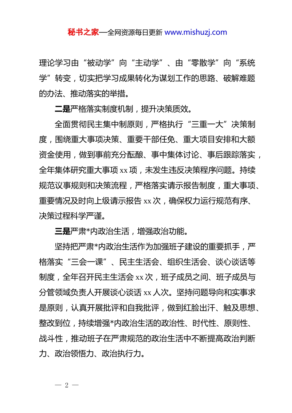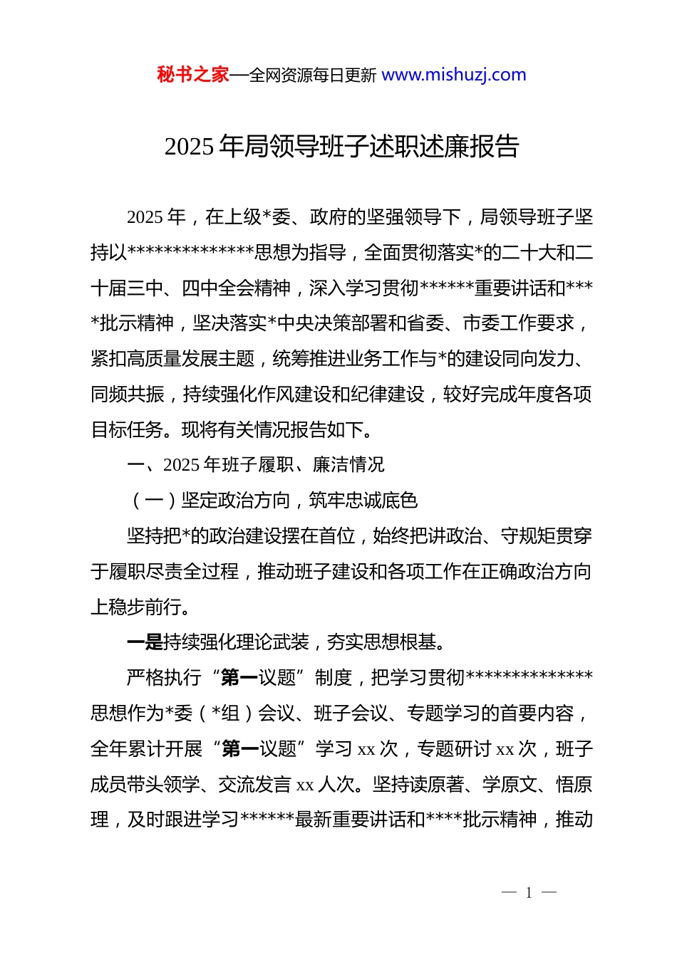 秘书之家—全网资源每日更新 www.mishuzj.com2025 年局领导班子述职述廉报告2025 年,在上级*委、政府的坚强领导下,局领导班子坚持以**************思想为指导,全面贯彻落实*的二十大和二十届三中、四中全会精神,深入学习贯彻******重要讲话和****批示精神,坚决落实*中央决策部署和省委、市委工作要求,紧扣高质量发展主题,统筹推进业务工作与*的建设同向发力、同频共振,持续强化作风建设和纪律建设,较好完成年度各项目标任务。现将有关情况报告如下。一、2025 年班子履职、廉洁情况(一)坚定政治方向,筑牢忠诚底色坚持把*的政治建设摆在首位,始终把讲政治、守规矩贯穿于履职尽责全过程,推动班子建设和各项工作在正确政治方向上稳步前行。一是持续强化理论武装,夯实思想根基。严格执行“第一议题”制度,把学习贯彻**************思想作为*委(*组)会议、班子会议、专题学习的首要内容,全年累计开展“第一议题”学习 xx 次,专题研讨 xx 次,班子成员带头领学、交流发言 xx 人次。坚持读原著、学原文、悟原理,及时跟进学习******最新重要讲话和****批示精神,推动— 1 —秘书之家—全网资源每日更新 www.mishuzj.com理论学习由“被动学”向“主动学”、由“零散学”向“系统学”转变,切实把学习成果转化为谋划工作的思路、破解难题的办法、推动落实的举措。二是严格落实制度机制,提升决策质效。全面贯彻民主集中制原则,严格执行“三重一大”决策制度,围绕重大事项决策、重要干部任免、重大项目安排和大额资金使用,做到事前充分酝酿、事中集体讨论、事后跟踪落实,全年集体研究重大事项 xx 项,未发生违反决策程序问题。持续规范议事规则和决策流程,严格落实请示报告制度,重大事项、重要情况及时向上级请示报告 xx 次,确保权力运行规范有序、决策过程科学严谨。三是严肃*内政治生活,增强政治功能。坚持把严肃*内政治生活作为加强班子建设的重要抓手,严格落实“三会一课”、民主生活会、组织生活会、谈心谈话等制度,全年召开民主生活会 xx 次,班子成员之间、班子成员与分管领域负责人开展谈心谈话 xx 人次。坚持问题导向和实事求是原则,认真开展批评和自我批评,做到红脸出汗、触及思想、整改到位,持续增强*内政治生活的政治性、时代性、原则性、战斗性,推动班子在严肃规范的政治生活中不断提高政治判断力、政治领悟力、政治执行力。— 2 —秘书之家—全网资源每日更新 www.mishuzj.com(二)聚焦主责主业,提升发展质效坚持把服务中心大局作为履职尽责的根本要求,紧扣年度目标任务和重点工作安排,统筹谋划、精准发力,推动各项工作在稳中有进、进中提质中取得实效。一是紧扣目标任务,系统谋划推进。围绕年度重点工作和阶段性目标,局领导班子坚持年初有部署、季度有调度、年中有评估、年底有总结,系统梳理形成年度重点任务清单 xx 项、专项工作台账 xx 本。班子成员按照分工抓统筹、抓协调、抓落实,定期召开专题会议和推进会议xx 次,对重点任务逐项研究、逐项分解、逐项压实责任,确保目标任务方向不偏、节奏不乱、推进有序。二是突出重点难点,强化攻坚突破。坚持问题导向、目标导向、结果导向相统一,聚焦制约工作推进的堵点难点问题,实行清单化管理、专班化推进、节点化调度,对重点事项明确责任领导、责任科室和完成时限,推动问题逐项销号、闭环管理。全年围绕重点领域、关键环节开展专项推进 xx 项,协调解决突出问题 xx 个,有效推动重点工作取得阶段性成效。三是健全推进机制,提升落实质效。持续完善“清单化管理、项目化推进、闭环式落实”工作— 3 —秘书之家—全网资源每日更新 www.mishuzj.com机制,将任务分解到岗、责任落实到人、进度明确到点,定期开展督查调度和跟踪问效 xx 次。对进展缓慢、落实不力的事项,及时提醒、限期整改,确保各项工作有人抓、抓得紧、落得实,推动工作落实从“完成任务”向“提升质量”转变。四是注重统筹协同,增强整体效能。坚持系统观念,加强内部协同和上下联动,注重在整体谋划中找准切入点、在协同推进中形成合力。围绕跨科室、跨领域事项,建立协同...