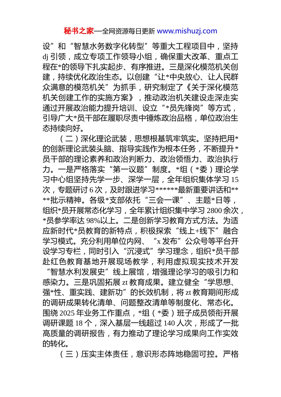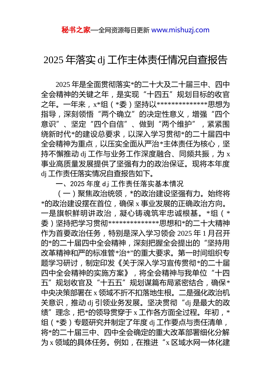 秘书之家—全网资源每日更新 www.mishuzj.com2025 年落实 dj 工作主体责任情况自查报告2025 年是全面贯彻落实*的二十大及二十届三中、四中全会精神的关键之年,是实现“十四五”规划目标的收官之年。一年来,x*组(*委)坚持以**************思想为指导,深刻领悟“两个确立”的决定性意义,增强“四个意识”、坚定“四个自信”、做到“两个维护”,紧紧围绕新时代*的建设总要求,以深入学习贯彻*的二十届四中全会精神为重点,以压实全面从严治*主体责任为核心,坚持不懈推动 dj 工作与业务工作深度融合、同频共振,为 x事业高质量发展提供了坚强有力的政治保证。现将本年度dj 工作责任落实情况自查报告如下。一、2025 年度 dj 工作责任落实基本情况(一)聚焦政治统领,*的政治建设坚强有力。始终将*的政治建设摆在首位,确保 x 事业发展的正确政治方向。一是旗帜鲜明讲政治,凝心铸魂筑牢忠诚根基。*组(*委)坚持把学习贯彻**************思想和*的二十大精神作为首要政治任务,特别是深入学习领会 2025 年 1 月召开的*的二十届四中全会精神,深刻把握全会提出的“坚持用改革精神和严的标准管*治*”的重大要求。第一时间组织专题学习研讨,制定印发《关于深入学习宣传贯彻*的二十届四中全会精神的实施方案》,将全会精神与我单位“十四五”规划收官及“十五五”规划谋篇布局紧密结合,确保*中央决策部署在 x 领域不折不扣落地生根。二是强化政治机关意识,推动 dj 引领业务发展。坚决贯彻“dj 是最大的政绩”理念,把*的领导贯穿于 x 工作各方面全过程。年初,*组(*委)专题研究并制定了年度 dj 工作要点与责任清单,将*的二十届三中、四中全会确定的重大改革部署细化分解为 x 领域的具体任务。例如,在推进“x 区域水网一体化建秘书之家—全网资源每日更新 www.mishuzj.com设”和“智慧水务数字化转型”等重大工程项目中,坚持dj 引领,成立专项工作领导小组,确保重大改革、重点工程在*的领导下扎实起步、有序推进。三是深化模范机关创建,持续优化政治生态。以创建“让*中央放心、让人民群众满意的模范机关”为抓手,研究制定了《关于深化模范机关创建工作的实施方案》,推动政治机关建设走深走实通过开展政治能力提升培训、设立“*员先锋岗”等方式,引导广大*员干部在履职尽责中锤炼政治品格,单位政治生态持续向好。(二)深化理论武装,思想根基筑牢筑实。坚持把用*的创新理论武装头脑、指导实践作为根本任务,不断提升*员干部的理论素养和政治判断力、政治领悟力、政治执行力。一是严格落实“第一议题”制度。*组(*委)理论学习中心组坚持先学一步、深学一层,全年组织集体学习 15次,专题研讨 6 次,及时跟进学习******最新重要讲话和****批示精神。各级*支部依托“三会一课”、主题*日等,组织*员开展常态化学习,全年累计组织集中学习 2800 余次,*员参学率达 98%以上。二是创新学习教育方式方法。为适应新时代*员教育的新特点,积极探索“线上+线下”融合学习模式。充分利用单位内网、“x 发布”公众号等平台开设学习专栏,同时引入“沉浸式”学习理念,组织*员干部赴红色教育基地开展现场教学,利用虚拟现实技术开发“智慧水利发展史”线上展馆,增强理论学习的吸引力和感染力。三是巩固拓展 zt 教育成果。建立健全“学思想、强*性、重实践、建新功”的长效机制,将 zt 教育期间形成的调研成果转化清单、问题整改清单等制度化、常态化。围绕 2025 年业务工作重点,*组(*委)班子成员领衔开展调研课题 18 个,深入基层一线超过 140 人次,形成了一批高质量的调研报告,有力推动了理论学习成果向工作实效的转化。(三)压实主体责任,意识形态阵地稳固可控。严格秘书之家—全网资源每日更新 www.mishuzj.com落实意识形态工作责任制,牢牢掌握意识形态工作领导权管理权、话语权。一是健全分析研判机制。坚持和完善意识形态风险“月分析、季会商”工作制度,*组(*委)每季度专题听取意识形态工作汇报,分析研判单位内部及相关领域的风险隐患,制定应对预案,源材料)。定期向市委报告意识形态工作情况,并向系...