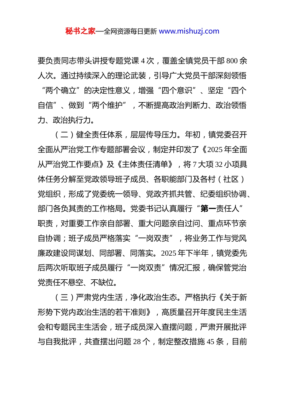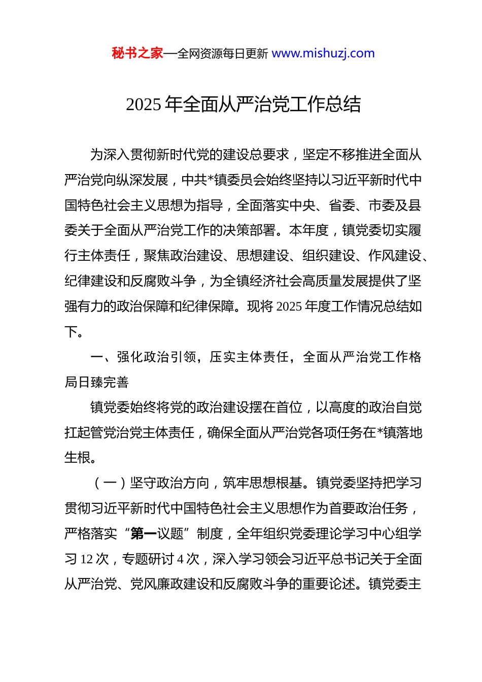 秘书之家—全网资源每日更新 www.mishuzj.com2025 年全面从严治党工作总结 为深入贯彻新时代党的建设总要求,坚定不移推进全面从严治党向纵深发展,中共*镇委员会始终坚持以习近平新时代中国特色社会主义思想为指导,全面落实中央、省委、市委及县委关于全面从严治党工作的决策部署。本年度,镇党委切实履行主体责任,聚焦政治建设、思想建设、组织建设、作风建设、纪律建设和反腐败斗争,为全镇经济社会高质量发展提供了坚强有力的政治保障和纪律保障。现将 2025 年度工作情况总结如下。一、强化政治引领,压实主体责任,全面从严治党工作格局日臻完善镇党委始终将党的政治建设摆在首位,以高度的政治自觉扛起管党治党主体责任,确保全面从严治党各项任务在*镇落地生根。(一)坚守政治方向,筑牢思想根基。镇党委坚持把学习贯彻习近平新时代中国特色社会主义思想作为首要政治任务,严格落实“第一议题”制度,全年组织党委理论学习中心组学习 12 次,专题研讨 4 次,深入学习领会习近平总书记关于全面从严治党、党风廉政建设和反腐败斗争的重要论述。镇党委主秘书之家—全网资源每日更新 www.mishuzj.com要负责同志带头讲授专题党课 4 次,覆盖全镇党员干部 800 余人次。通过持续深入的理论武装,引导广大党员干部深刻领悟“两个确立”的决定性意义,增强“四个意识”、坚定“四个自信”、做到“两个维护”,不断提高政治判断力、政治领悟力、政治执行力。(二)健全责任体系,层层传导压力。年初,镇党委召开全面从严治党工作专题部署会议,制定并印发了《2025 年全面从严治党工作要点》及《主体责任清单》,将 7 大项 32 小项具体任务分解至党政领导班子成员、各职能部门及各村(社区)党组织,形成了党委统一领导、党政齐抓共管、纪委组织协调、部门各负其责的工作格局。党委书记认真履行“第一责任人”职责,对重要工作亲自部署、重大问题亲自过问、重点环节亲自协调;班子成员严格落实“一岗双责”,将业务工作与党风廉政建设同谋划、同部署、同落实。2025 年下半年,镇党委先后两次听取班子成员履行“一岗双责”情况汇报,确保管党治党责任不悬空、不缺位。(三)严肃党内生活,净化政治生态。严格执行《关于新形势下党内政治生活的若干准则》,高质量召开年度民主生活会和专题民主生活会,班子成员深入查摆问题,严肃开展批评与自我批评,共查摆出问题 28 个,制定整改措施 45 条,目前秘书之家—全网资源每日更新 www.mishuzj.com已全部整改到位。同时,加强对各基层党组织组织生活会的指导,确保党内政治生活的政治性、时代性、原则性、战斗性。严格执行“三重一大”事项集体决策制度,全年共召开党委会26 次,研究决策重大事项 78 项,决策过程科学民主、公开透明,有效防范了决策风险。二、夯实基层基础,建强战斗堡垒,组织力与凝聚力实现新提升镇党委坚持大抓基层的鲜明导向,以提升组织力为重点,推动基层党组织全面进步、全面过硬,打通全面从严治党的“最后一公里”。(一)规范组织建设,提升标准化水平。全镇现有基层党组织 35 个,其中党委 2 个,党总支 3 个,党支部 30 个;共有党员 1052 名。上半年,镇党委严格按照发展党员工作规程,新发展入党积极分子 19 人,接收预备党员 11 人,为党员队伍注入了新鲜血液。持续推进党支部标准化规范化建设,严格落实“三会一课”、主题党日、组织生活会、民主评议党员等制度。据统计,全年各支部累计召开党员大会 150 余次,支委会 380余次,党小组会超过 700 次。镇党委对各支部“三会一课”落实情况开展了 2 轮全覆盖督导检查,对发现的记录不规范、内容不充实等问题,现场反馈并督促整改,确保组织生活制度落秘书之家—全网资源每日更新 www.mishuzj.com到实处。(二)创新治理模式,延伸监督触角。深化“党建+网格管理”模式,将全面从严治党的要求延伸至社会治理的最末梢。全镇划分一级网格 12 个、二级网格 68 个,配备网格员 95 名,其中党员网格员占比超过 70%。推动监督执纪力量下沉,在每个网格设立廉情监督员,负责收集社情民意、监督惠民政策...