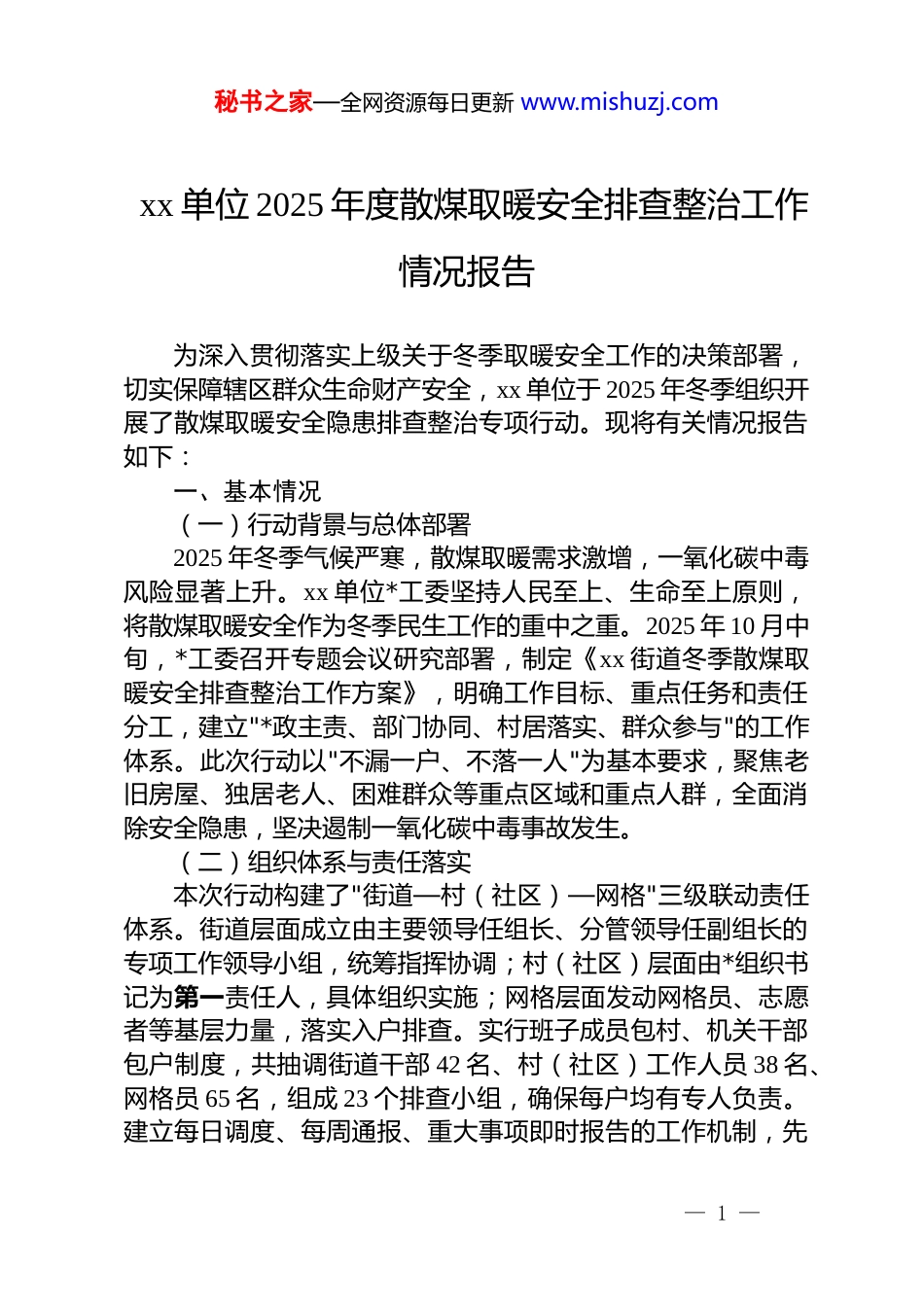 秘书之家—全网资源每日更新 www.mishuzj.comxx 单位 2025 年度散煤取暖安全排查整治工作情况报告为深入贯彻落实上级关于冬季取暖安全工作的决策部署,切实保障辖区群众生命财产安全,xx 单位于 2025 年冬季组织开展了散煤取暖安全隐患排查整治专项行动。现将有关情况报告如下:一、基本情况(一)行动背景与总体部署2025 年冬季气候严寒,散煤取暖需求激增,一氧化碳中毒风险显著上升。xx 单位*工委坚持人民至上、生命至上原则,将散煤取暖安全作为冬季民生工作的重中之重。2025 年 10 月中旬,*工委召开专题会议研究部署,制定《xx 街道冬季散煤取暖安全排查整治工作方案》,明确工作目标、重点任务和责任分工,建立"*政主责、部门协同、村居落实、群众参与"的工作体系。此次行动以"不漏一户、不落一人"为基本要求,聚焦老旧房屋、独居老人、困难群众等重点区域和重点人群,全面消除安全隐患,坚决遏制一氧化碳中毒事故发生。(二)组织体系与责任落实本次行动构建了"街道—村(社区)—网格"三级联动责任体系。街道层面成立由主要领导任组长、分管领导任副组长的专项工作领导小组,统筹指挥协调;村(社区)层面由*组织书记为第一责任人,具体组织实施;网格层面发动网格员、志愿者等基层力量,落实入户排查。实行班子成员包村、机关干部包户制度,共抽调街道干部 42 名、村(社区)工作人员 38 名、网格员 65 名,组成 23 个排查小组,确保每户均有专人负责。建立每日调度、每周通报、重大事项即时报告的工作机制,先— 1 —秘书之家—全网资源每日更新 www.mishuzj.com后召开推进会 5 次、现场协调会 12 次,印发工作通报 8 期,层层传导压力,级级压实责任。(三)排查范围与工作方法本次排查行动覆盖辖区全部散煤取暖用户。经摸底统计,全街道共有散煤取暖户 1247 户,涉及 7 个行政村和 3 个社区。其中,使用传统煤炉取暖户 892 户,使用土暖气取暖户 278 户,使用土炕取暖户 77 户。排查工作采取"清单化管理、销号式推进"模式,各排查小组对照《散煤取暖户基本信息台账》,逐户上门、精准对接。入户过程中,工作人员严格执行"三必查、三必测、三必问"标准:必查取暖设备安全性、必查通风条件、必查报警器安装使用情况;必测报警器灵敏度、必测室内一氧化碳浓度、必测设备运转状态;必问群众知晓度、必问操作熟练度、必问应急处置能力。通过"看、问、查、测"四字工作法,实现排查全覆盖、无死角。(四)技术检测与设备维护本次行动重点强化一氧化碳报警器的技术检测与维护。累计检测一氧化碳报警器 1186 台,检测覆盖率 95.1%。经专业测试,发现故障报警器 87 台,故障率 7.3%,主要问题包括传感器失效、电池耗尽、误报频发等。对故障设备实行"即发现、即登记、即更换",全部完成更换,更换率 100%。同时,新安装报警器 61 台,重点针对此前未安装的老弱病残户和新增取暖户。建立报警器动态管理台账,详细记录设备型号、安装时间、检测状态、更换记录等信息。委托专业技术机构对 256 台使用超过 3 年的老旧报警器进行性能评估,建议更换的已全部纳入明年更新计划。此外,排查发现不合格或超期服役的取暖炉具143 台,均督促用户限期整改,目前已更换符合国家安全标准的炉具 118 台。(五)宣传培训与教育引导将宣传教育作为防范事故的第一道防线,创新采用"线上+— 2 —秘书之家—全网资源每日更新 www.mishuzj.com线下"融合模式。线下印制《散煤取暖安全明白纸》3000 份,张贴《冬季取暖安全须知》海报 500 份,确保每户至少发放一份。组织安全知识讲座 15 场,覆盖群众 2100 余人次,重点讲解一氧化碳中毒机理、早期症状识别、应急急救措施等内容。线上通过村(社区)微信群、公众号推送安全提示信息 86 条,制作播放警示教育短视频 3 部,总浏览量超过 1.2 万次。特别针对老年群体,开展"一对一"精准辅导,工作人员现场演示报警器正确使用、故障复位、电池更换等操作,确保老人熟练掌握。在 xx 村,工作人员为 72 岁独居老人详细讲解报警器误报处理流程,反复演练直至老人完全掌握,获得...