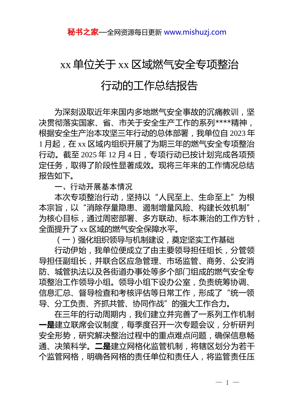 秘书之家—全网资源每日更新 www.mishuzj.comxx 单位关于 xx 区域燃气安全专项整治行动的工作总结报告为深刻汲取近年来国内多地燃气安全事故的沉痛教训,坚决贯彻落实国家、省、市关于安全生产工作的系列****精神,根据安全生产治本攻坚三年行动的总体部署,我单位自 2023 年1 月起,在 xx 区域内组织开展了为期三年的燃气安全专项整治行动。截至 2025 年 12 月 4 日,专项行动已按计划完成各项预定任务,取得了阶段性显著成效。现将三年来的工作情况总结报告如下。一、行动开展基本情况本次专项整治行动,坚持以“人民至上、生命至上”为根本宗旨,以“消除存量隐患、遏制增量风险、构建长效机制”为核心目标,通过周密部署、多方联动、标本兼治的工作方针,全面提升了 xx 区域的燃气安全保障水平。(一)强化组织领导与机制建设,奠定坚实工作基础行动伊始,我单位便成立了由主要领导担任组长,分管领导担任副组长,并联合区应急管理、市场监管、商务、公安消防、城管执法以及各街道办事处等多个部门组成的燃气安全专项整治工作领导小组。领导小组下设办公室,负责统筹协调、信息汇总、督导检查和考核评估等日常工作,形成了“统一领导、分工负责、齐抓共管、协同作战”的强大工作合力。在三年的行动周期内,我们建立并完善了一系列工作机制一是建立联席会议制度,每季度召开一次专题会议,分析研判安全形势,研究解决整治过程中的重点难点问题,确保信息畅通、决策科学。二是建立网格化监管机制,将辖区划分为若干个监管网格,明确各网格的责任单位和责任人,将监管责任压— 1 —秘书之家—全网资源每日更新 www.mishuzj.com实到“最后一米”,实现了监管区域的全覆盖。三是建立信息通报与挂牌督办制度,对排查出的重大安全隐患实行挂牌督办,明确整改责任、措施、资金、时限和预案,定期通报整改进展,对整改不力、逾期未完成的单位和个人进行严肃问责。据统计,三年间共召开联席会议 12 次,挂牌督办重大隐患 30 余项,均已完成闭环整改。(二)深化隐患排查与联合执法,实现监管高压态-势隐患排查是专项整治行动的核心环节。我单位始终坚持“全覆盖、零容忍、严执法、重实效”的原则,组织开展了多轮次、多形式的排查整治工作。一是聚焦重点领域,实施精准排查。行动重点聚焦餐饮经营场所、老旧小区、大型商业综合体、农贸市场等人员密集区域的燃气使用安全。排查内容涵盖燃气管道、阀门、灶具、连接软管、燃气报警器及紧急切断阀等设施设备的安装使用情况。针对 xx 风情街及 xx 桥等餐饮商户高度集中的区域,我们特别组织了多次夜间联合突击检查。据统计,三年累计开展各类检查行动超过 150 次,其中夜间联合检查 5 次,覆盖各类燃气用户超过 6000 户,其中高风险餐饮商户 400 余家。二是坚持问题导向,开展专项治理。针对排查中发现的共性问题,开展了系列专项治理行动。例如,针对燃气软管老化、龟裂、超长使用等问题,开展了“安心管”更换行动;针对可燃气体报警器安装不规范、未通电、功能失效等问题,开展了“守护神”计划专项检查。据统计,行动期间累计排查并整改各类问题隐患超过 850 项,其中涉及燃气软管问题 200 余项,报警器及切断阀相关问题 150 余项,有效消除了一大批潜在的安全风险。三是强化联合执法,形成强大震慑。我单位联合应急、市场监管、公安等部门,对非法储存、运输、经营瓶装液化气的“黑窝点”、“黑气瓶”进行严厉打击;对拒不整改重大安全— 2 —秘书之家—全网资源每日更新 www.mishuzj.com隐患、不落实安全生产主体责任的企业,依法采取停产停业、上限罚款、吊销许可等处罚措施。通过严格执法,有力地规范了市场秩序,营造了“不敢违、不能违、不想违”的良好氛围。(三)创新宣传教育与培训模式,提升全民安全素养提升全民燃气安全意识是治本之策。我单位坚持将宣传教育贯穿于专项整治行动的全过程,采取了线上与线下相结合、传统媒体与新媒体互补的多元化宣传策略。一是开展沉浸式现场宣传与指导。在日常检查和联合执法过程中,执法人员转变为安全宣传员,向居民和商户现场讲解燃气泄漏的...