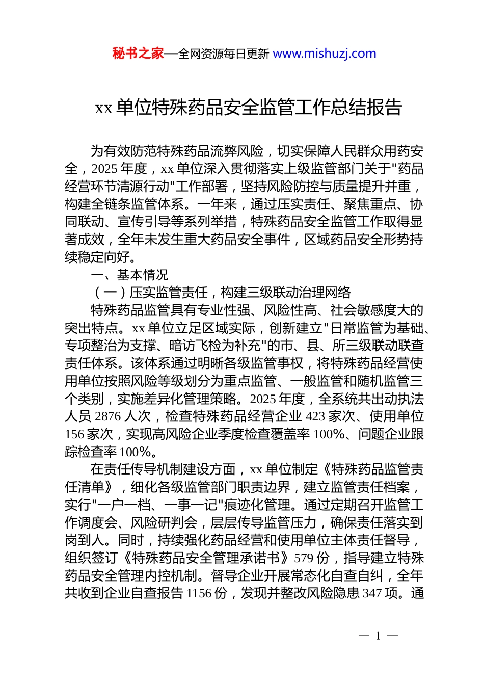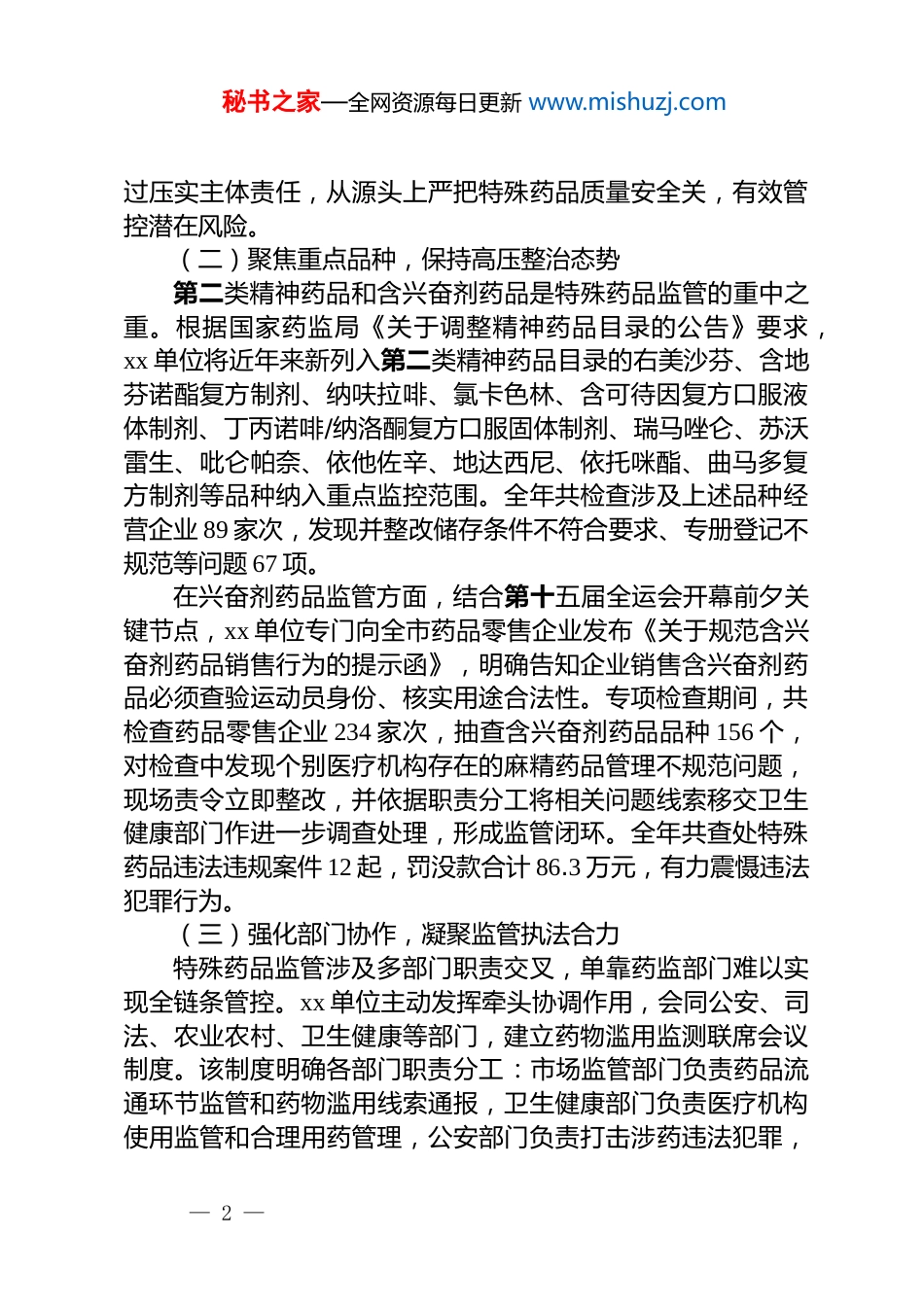 秘书之家—全网资源每日更新 www.mishuzj.comxx 单位特殊药品安全监管工作总结报告为有效防范特殊药品流弊风险,切实保障人民群众用药安全,2025 年度,xx 单位深入贯彻落实上级监管部门关于"药品经营环节清源行动"工作部署,坚持风险防控与质量提升并重,构建全链条监管体系。一年来,通过压实责任、聚焦重点、协同联动、宣传引导等系列举措,特殊药品安全监管工作取得显著成效,全年未发生重大药品安全事件,区域药品安全形势持续稳定向好。一、基本情况(一)压实监管责任,构建三级联动治理网络特殊药品监管具有专业性强、风险性高、社会敏感度大的突出特点。xx 单位立足区域实际,创新建立"日常监管为基础、专项整治为支撑、暗访飞检为补充"的市、县、所三级联动联查责任体系。该体系通过明晰各级监管事权,将特殊药品经营使用单位按照风险等级划分为重点监管、一般监管和随机监管三个类别,实施差异化管理策略。2025 年度,全系统共出动执法人员 2876 人次,检查特殊药品经营企业 423 家次、使用单位156 家次,实现高风险企业季度检查覆盖率 100%、问题企业跟踪检查率 100%。在责任传导机制建设方面,xx 单位制定《特殊药品监管责任清单》,细化各级监管部门职责边界,建立监管责任档案,实行"一户一档、一事一记"痕迹化管理。通过定期召开监管工作调度会、风险研判会,层层传导监管压力,确保责任落实到岗到人。同时,持续强化药品经营和使用单位主体责任督导,组织签订《特殊药品安全管理承诺书》579 份,指导建立特殊药品安全管理内控机制。督导企业开展常态化自查自纠,全年共收到企业自查报告 1156 份,发现并整改风险隐患 347 项。通— 1 —秘书之家—全网资源每日更新 www.mishuzj.com过压实主体责任,从源头上严把特殊药品质量安全关,有效管控潜在风险。(二)聚焦重点品种,保持高压整治态势第二类精神药品和含兴奋剂药品是特殊药品监管的重中之重。根据国家药监局《关于调整精神药品目录的公告》要求,xx 单位将近年来新列入第二类精神药品目录的右美沙芬、含地芬诺酯复方制剂、纳呋拉啡、氯卡色林、含可待因复方口服液体制剂、丁丙诺啡/纳洛酮复方口服固体制剂、瑞马唑仑、苏沃雷生、吡仑帕奈、依他佐辛、地达西尼、依托咪酯、曲马多复方制剂等品种纳入重点监控范围。全年共检查涉及上述品种经营企业 89 家次,发现并整改储存条件不符合要求、专册登记不规范等问题 67 项。在兴奋剂药品监管方面,结合第十五届全运会开幕前夕关键节点,xx 单位专门向全市药品零售企业发布《关于规范含兴奋剂药品销售行为的提示函》,明确告知企业销售含兴奋剂药品必须查验运动员身份、核实用途合法性。专项检查期间,共检查药品零售企业 234 家次,抽查含兴奋剂药品品种 156 个,对检查中发现个别医疗机构存在的麻精药品管理不规范问题,现场责令立即整改,并依据职责分工将相关问题线索移交卫生健康部门作进一步调查处理,形成监管闭环。全年共查处特殊药品违法违规案件 12 起,罚没款合计 86.3 万元,有力震慑违法犯罪行为。(三)强化部门协作,凝聚监管执法合力特殊药品监管涉及多部门职责交叉,单靠药监部门难以实现全链条管控。xx 单位主动发挥牵头协调作用,会同公安、司法、农业农村、卫生健康等部门,建立药物滥用监测联席会议制度。该制度明确各部门职责分工:市场监管部门负责药品流通环节监管和药物滥用线索通报,卫生健康部门负责医疗机构使用监管和合理用药管理,公安部门负责打击涉药违法犯罪,— 2 —秘书之家—全网资源每日更新 www.mishuzj.com司法部门负责戒毒场所药品管理,农业农村部门负责兽用特殊药品监管。机制建立以来,各部门紧密联系、通力协作,定期召开季度联席会议 4 次,通报各自工作中发现的敏感风险信息 23 条,开展联合核查处置行动 8 次。市禁毒办通报药物滥用线索 3 起,市市场监管局通报相关线索 2 起,均得到及时有效处置。通过信息共享、联合执法、风险会商,形成了打击违法犯罪、封堵管理漏洞的强大合力,提升了综合治理效能。特别是在打击非法渠道购销特殊药品方面,药监与公安部门...