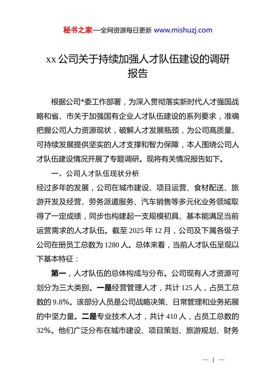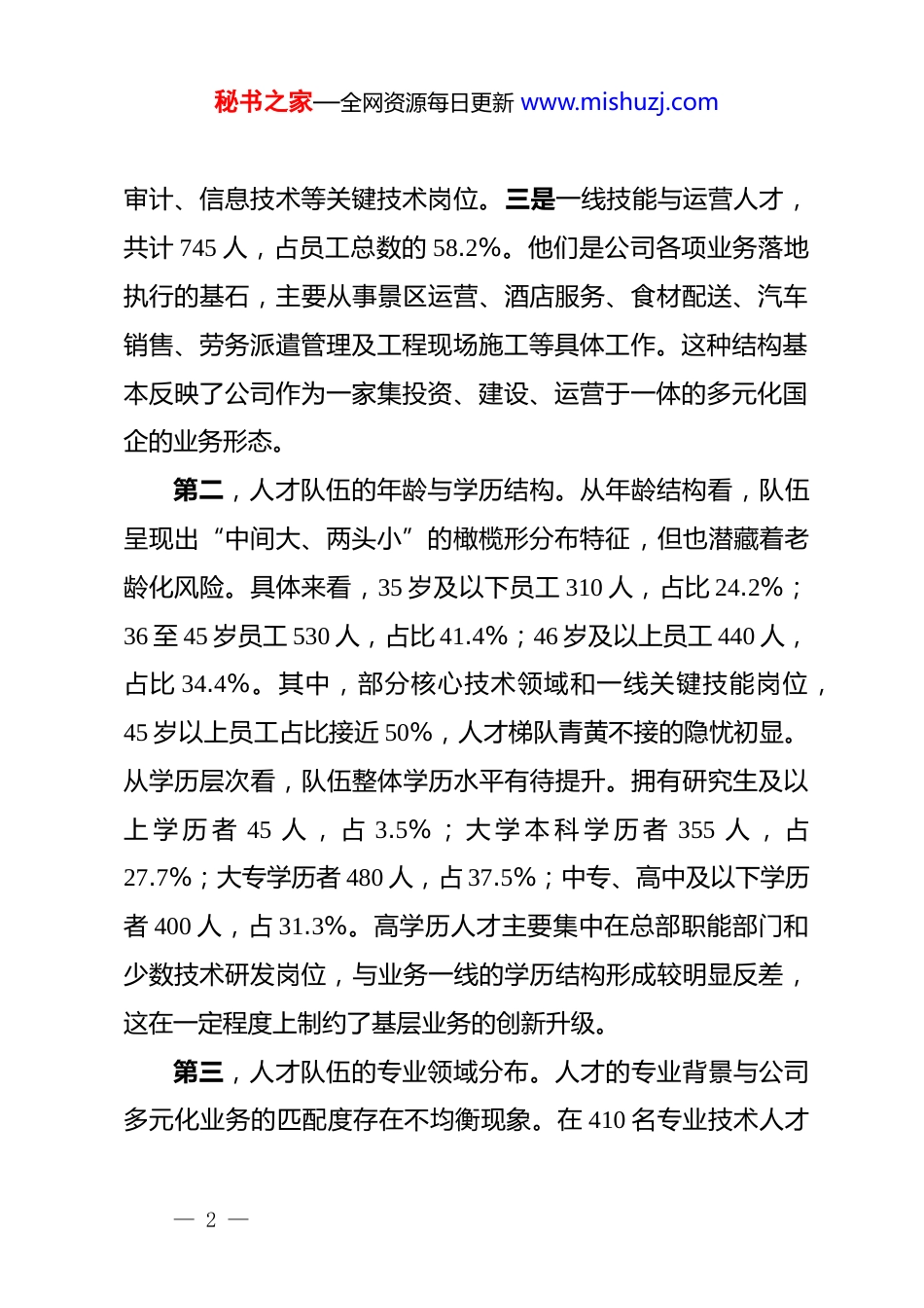 秘书之家—全网资源每日更新 www.mishuzj.comxx 公司关于持续加强人才队伍建设的调研报告根据公司*委工作部署,为深入贯彻落实新时代人才强国战略和省、市关于加强国有企业人才队伍建设的系列要求,准确把握公司人力资源现状,破解人才发展瓶颈,为公司高质量、可持续发展提供坚实的人才支撑和智力保障,本人围绕公司人才队伍建设情况开展了专题调研。现将有关情况报告如下。一、公司人才队伍现状分析经过多年的发展,公司在城市建设、项目运营、食材配送、旅游开发及经营、劳务派遣服务、汽车销售等多元化业务领域取得了一定成绩,同步也构建起一支规模初具、基本能满足当前运营需求的人才队伍。截至 2025 年 12 月,公司及下属各级子公司在册员工总数为 1280 人。总体来看,当前人才队伍呈现以下基本特征:第一,人才队伍的总体构成与分布。公司现有人才资源可划分为三大类别。一是经营管理人才,共计 125 人,占员工总数的 9.8%。该部分人员是公司战略决策、日常管理和业务拓展的中坚力量。二是专业技术人才,共计 410 人,占员工总数的32%。他们广泛分布在城市建设、项目策划、旅游规划、财务— 1 —秘书之家—全网资源每日更新 www.mishuzj.com审计、信息技术等关键技术岗位。三是一线技能与运营人才,共计 745 人,占员工总数的 58.2%。他们是公司各项业务落地执行的基石,主要从事景区运营、酒店服务、食材配送、汽车销售、劳务派遣管理及工程现场施工等具体工作。这种结构基本反映了公司作为一家集投资、建设、运营于一体的多元化国企的业务形态。第二,人才队伍的年龄与学历结构。从年龄结构看,队伍呈现出“中间大、两头小”的橄榄形分布特征,但也潜藏着老龄化风险。具体来看,35 岁及以下员工 310 人,占比 24.2%;36 至 45 岁员工 530 人,占比 41.4%;46 岁及以上员工 440 人,占比 34.4%。其中,部分核心技术领域和一线关键技能岗位,45 岁以上员工占比接近 50%,人才梯队青黄不接的隐忧初显。从学历层次看,队伍整体学历水平有待提升。拥有研究生及以上 学 历 者 45 人 , 占 3.5% ; 大 学 本 科 学 历 者 355 人 , 占27.7%;大专学历者 480 人,占 37.5%;中专、高中及以下学历者 400 人,占 31.3%。高学历人才主要集中在总部职能部门和少数技术研发岗位,与业务一线的学历结构形成较明显反差,这在一定程度上制约了基层业务的创新升级。第三,人才队伍的专业领域分布。人才的专业背景与公司多元化业务的匹配度存在不均衡现象。在 410 名专业技术人才— 2 —秘书之家—全网资源每日更新 www.mishuzj.com中,工程建设与土木管理类专业人才约 120 人,占比 29.3%,有力支撑了公司的城市建设项目。传统旅游管理与酒店服务类人才约 95 人,占比 23.2%。财会、法律、行政等通用职能类人才约 105 人,占比 25.6%。然而,与公司未来发展战略紧密相关的新兴专业人才储备明显不足,例如,与智慧旅游和文旅深度融合相关的数字化运营、内容营销、ip 策划等新媒体和技术人才仅有约 25 人;与现代供应链管理和冷链物流相关的专业人才在食材配送板块中仍是短板;汽车销售板块也面临着新能源汽车技术服务和数字化营销人才的缺口。这种专业分布的不均衡,反映出人才结构未能完全跟上公司业务转型升级的步伐。二、人才队伍建设面临的突出问题在调研中发现,对照公司“十四五”发展规划和日益激烈的市场竞争环境,当前人才队伍建设仍面临一系列亟待解决的突出问题,这些问题既有公司内部机制的原因,也与外部宏观环境紧密相关。第一,人才总量相对不足与关键岗位人才流失并存。公司当前 1280 人的总规模,相对于覆盖 xx 市多个重点产业领域的庞大业务体量而言,人力资源配置总体偏紧。特别是在新项目集中上马、新业务快速拓展的时期,各业务板块普遍反映人手不足,关键岗位“一个萝卜一个坑”,缺乏有效的备份和轮岗— 3 —秘书之家—全网资源每日更新 www.mishuzj.com机制,增加了运营风险。更值得警惕的是,人才“引不进”和“留不住”的问题同时存在。一方面,受限于地域、薪酬待遇及发...