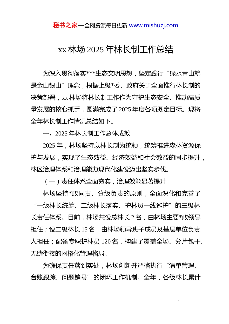 秘书之家—全网资源每日更新 www.mishuzj.comxx 林场 2025 年林长制工作总结为深入贯彻落实***生态文明思想,坚定践行“绿水青山就是金山银山”理念,根据上级*委、政府关于全面推行林长制的决策部署,xx 林场将林长制工作作为守护生态安全、推动高质量发展的核心抓手,圆满完成了 2025 年度各项既定目标。现将全年林长制工作情况总结如下。一、2025 年林长制工作总体成效2025 年,林场坚持以林长制为统领,统筹推进森林资源保护与发展,实现了生态效益、经济效益和社会效益的同步提升,林区治理体系和治理能力现代化建设迈出坚实步伐。(一)责任体系全面夯实,治理效能显著提升林场坚持*政同责、分级负责的原则,全面深化和完善了“一级林长统筹、二级林长落实、护林员一线巡护”的三级林长责任体系。目前,林场共设总林长 2 名,由林场主要*政领导担任;设二级林长 15 名,由林场领导班子成员及基层单位负责人担任;配备专职护林员 120 名,构建了覆盖全场、分片包干、无缝衔接的网格化管理格局。为确保责任落到实处,林场创新并严格执行“清单管理、台账跟踪、问题销号”的闭环工作机制。全年,各级林长累计— 1 —秘书之家—全网资源每日更新 www.mishuzj.com开展巡林 1800 余人次,通过巡查发现并解决林木盗伐隐患、林地破坏苗头、森林防火风险等各类问题 230 余项,问题整改销号率达到 100%。该机制的有效运行,将责任压力传导至“最后一公里”,确保了“山有人管、林有人护、责有人担”。(二)森林资源量质齐增,生态屏障更加牢固林场始终将提升森林质量作为林长制的核心任务,大力实施森林资源培育工程。2025 年,林场科学规划并超额完成年度造林任务,全年完成人工植苗造林 3.5 万亩,超出年度计划任务 1.3 万亩的 3.8%。特别是在春季造林工作中,林场抢抓农时,周密部署,截至 2 月底便完成 1.14 万亩的造林任务,实现了“开门红”。在造林过程中,我们严格遵循“四良”造林法,即使用良种、良法、良地、良势,并积极推广应用乡土阔叶树种混交模式,有效提升了新造林的生态稳定性与生物多样性。重点生态项目建设取得重大进展。预算投入 208.65 万元的“xx 河流域石漠化综合治理及生物多样性保护项目”按计划稳步推进,通过更替修复、采伐迹地更新等措施完成退化林修复1.2 万亩,项目区植被盖度显著提升,水土流失得到有效遏制。同时,中央财政投入 462 万元支持的 5000 亩油茶营造项目已全部完成高标准种植,不仅为林场未来开辟了新的经济增长点,更形成了一片重要的生态经济复合型林地。— 2 —秘书之家—全网资源每日更新 www.mishuzj.com在资源利用方面,林场严格执行年度森林采伐限额管理制度。全年共完成木材采伐与销售约 52 万立方米,所有采伐活动均在“采前培训、边界确认、承诺签署”的严格程序下进行,实现了经济效益与生态保护的平衡。初步探索碳汇能力提升路径。林场已启动森林碳汇计量监测体系建设的前期工作,对新增造林地块及重点生态修复区域的碳储量进行基线调查与潜力评估。据初步测算,仅 2025 年新增的 3.5 万亩森林,未来完全成熟后预计可形成年均约 4.2 万吨的碳汇增量,为林场未来参与碳汇交易、实现生态产品价值转换奠定了坚实基础。(三)科技赋能成效凸显,监管手段迭代升级林场将“智慧林场”建设作为提升林长制效能的“倍增器”,大力推动现代信息技术与林业管理的深度融合。2025 年,林场投入专项资金,初步建成了“天、空、地、人、网”五位一体的森林资源智慧监管平台。“天”即利用高分辨率卫星遥感技术,每季度对林场范围内的林地变化、森林覆盖率等进行动态监测。“空”即购置并部署了 4 架工业级 xx-m300-rtk 型无人机,对人类巡护难以到达的偏远林区、火灾高风险区进行常态化空中巡查,有效弥补了地面巡护的盲区。“地”即在 15 个关键入山路口及重点林区安装— 3 —秘书之家—全网资源每日更新 www.mishuzj.com了高清林火视频监控与智能语音广播设备,实现了 24 小时不间断监控与远程预警喊话。“人”即为全部 120 名护林员配备了搭载北斗模块的智能巡护终端...