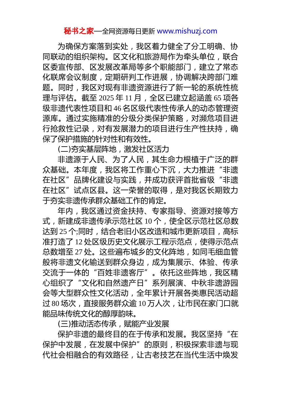 秘书之家—全网资源每日更新 www.mishuzj.comxx 区关于 2025 年度非物质文化遗产保护工作的总结报告在中华优秀传统文化实现创造性转化、创新性发展的新时代背景下,守护与传承非物质文化遗产是赓续历史文脉、增强文化自信、建设社会主义文化强国的重要基石。2025 年,在区委、区政府的坚强领导与统筹部署下,我区文化和旅游局及相关单位以高度的文化自觉和历史担当,紧密围绕《关于进一步加强非物质文化遗产保护的工作方案》的总体要求,扎实推进各项工作,取得了显著成效。为系统梳理经验、审视不足、擘画未来,现将本年度非遗保护工作情况总结报告如下。一、固本强基与守正创新并举,非遗保护工作取得新成效2025 年是全面落实我区非遗保护工作新方案的开局之年。一年来,全区上下凝聚共识,多措并举,推动非遗保护工作从“抢救性保护”向“系统性保护”纵深发展,从“静态传承”向“活态利用”全面转型,形成了政府主导社会参与、传承人为主体、多方协同的工作新格局,为建设文化强区注入了强劲动力。(一)健全工作体系,筑牢制度根基科学高效的顶层设计是推动非遗保护工作行稳致远的根本保障。年初,xx 区人民政府正式印发《关于进一步加强非物质文化遗产保护的工作方案》,纲举目张地提出了涵盖资源普查、传承人培育、整体性保护、活化利用、宣传推广等九项具体举措,明确了我区非遗保护传承的中长期目标任务。该方案的出台,标志着我区非遗保护工作进入了体系化、法治化的新阶段。秘书之家—全网资源每日更新 www.mishuzj.com为确保方案落到实处,我区着力健全了分工明确、协同联动的组织架构。区文化和旅游局作为牵头单位,联合区委宣传部、区发展改革局等多个职能部门,建立了常态化联席会议制度,定期研判工作进展,协调解决跨部门难题。同时,我区对现有非遗资源进行了新一轮的系统性梳理与评估。截至 2025 年 11 月,全区已建立起涵盖 65 项各级非遗代表性项目和 46 名区级代表性传承人的动态管理资源库。通过实施精准的分级分类保护策略,对濒危项目进行抢救性记录,对有发展潜力的项目进行生产性扶持,确保了保护措施的针对性和有效性。(二)夯实基层阵地,激发社区活力非遗源于人民、为了人民,其生命力根植于广泛的群众基础。本年度,我区将工作重心下沉,大力推进“非遗在社区”品牌化建设与实践,并成功获评首批省级“非遗在社区”试点区县。这一荣誉的取得,是对我区长期致力于夯实非遗传承群众基础工作的肯定。年内,我区通过资金扶持、专家指导、资源对接等方式,新建成非遗传承示范社区 10 个,使全区示范社区总数达到 25 个;同时,结合老旧小区改造和城市更新项目,高标准打造了 12 处区级历史文化展示工程示范点,使得示范点总数增至 27 处。这些遍布城乡的文化阵地,如同毛细血管般将非遗文化输送到群众身边,成为集展示、体验、传承交流于一体的“百姓非遗客厅”。依托这些阵地,我区精心组织了“文化和自然遗产日”系列展演、中秋非遗游园会等大型群众性文化活动,全年累计开展各类惠民活动超过 80 场次,直接服务群众逾 10 万人次,让市民在家门口就能品味传统文化的醇厚韵味。(三)推动活态传承,赋能产业发展保护非遗的最终目的在于传承和发展。我区坚持“在保护中发展,在发展中保护”的原则,积极探索非遗与现代社会相融合的有效路径,让古老技艺在当代生活中焕发秘书之家—全网资源每日更新 www.mishuzj.com出新的生机与活力。一是扶持传承主体,激发内生动力。为解决传承人“人走艺绝”的困境,我区加大了对代表性传承人的扶持力度。通过设立专项工作室,成功扶持打造了“兴隆舞狮工作室”、“济南叶雕工作室”等一批具有市场潜力和品牌效应的非遗项目工作室。这些工作室不仅成为技艺传承的核心基地,更通过“大师带徒”模式,培养了一批青年传承人。同时,我区探索成立了“非物质文化遗产工坊联盟”,通过资源整合与平台共享,帮助传承人对接市场、拓展销路,切实提高了其经济收入和行业地位。二是打造品牌活动,扩大社会影响。我区深入实施中国传统节日振兴工程,将非遗元素深度融入节庆活动。通过持续提升“玉符河文...