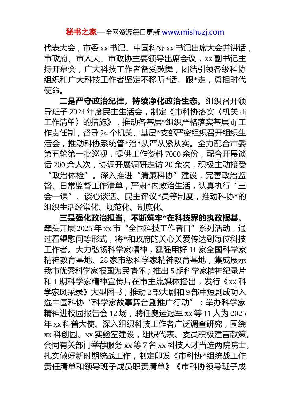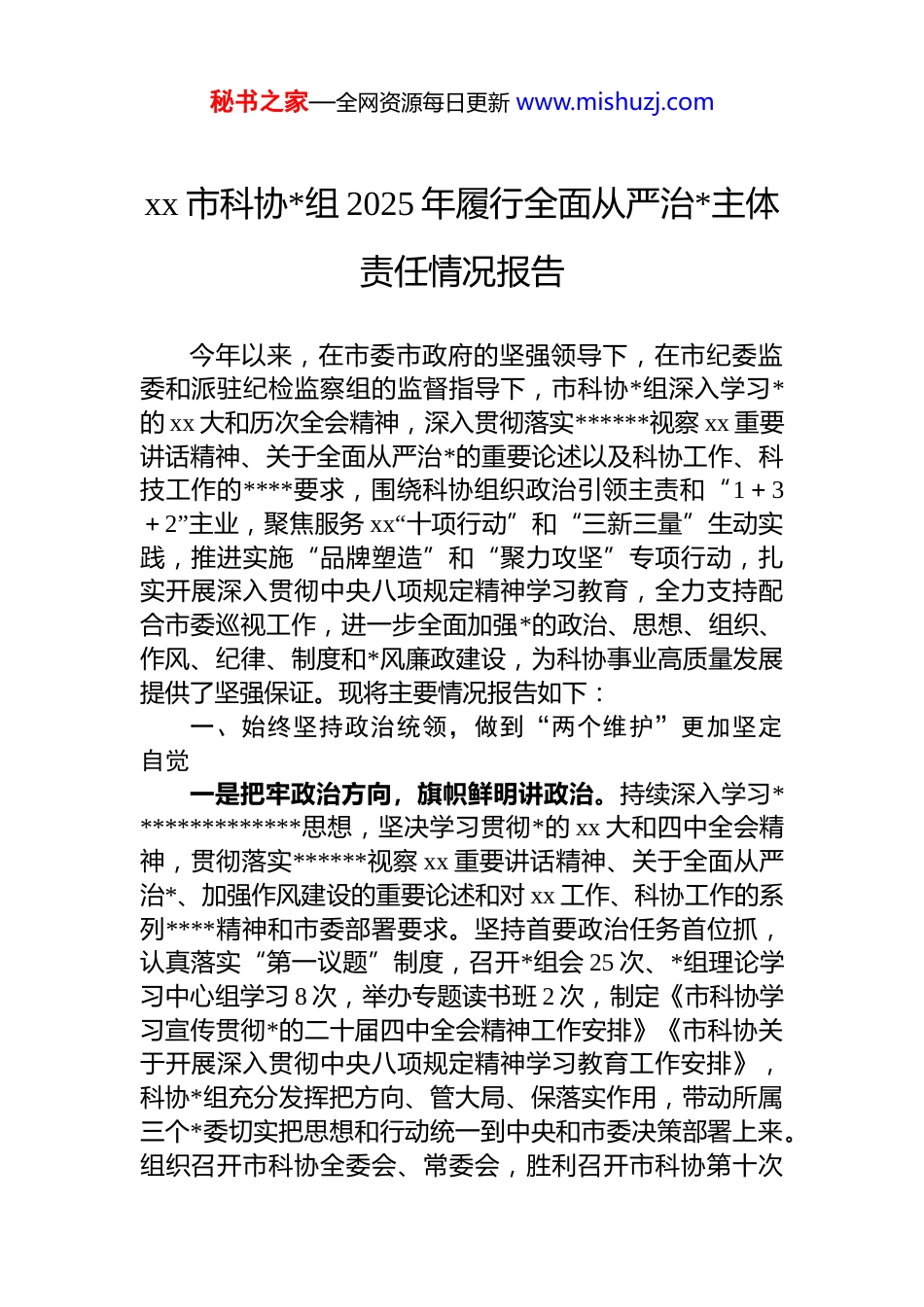 秘书之家—全网资源每日更新 www.mishuzj.comxx 市科协*组 2025 年履行全面从严治*主体责任情况报告今年以来,在市委市政府的坚强领导下,在市纪委监委和派驻纪检监察组的监督指导下,市科协*组深入学习*的 xx 大和历次全会精神,深入贯彻落实******视察 xx 重要讲话精神、关于全面从严治*的重要论述以及科协工作、科技工作的****要求,围绕科协组织政治引领主责和“1+3+2”主业,聚焦服务 xx“十项行动”和“三新三量”生动实践,推进实施“品牌塑造”和“聚力攻坚”专项行动,扎实开展深入贯彻中央八项规定精神学习教育,全力支持配合市委巡视工作,进一步全面加强*的政治、思想、组织、作风、纪律、制度和*风廉政建设,为科协事业高质量发展提供了坚强保证。现将主要情况报告如下:一、始终坚持政治统领,做到“两个维护”更加坚定自觉一是把牢政治方向,旗帜鲜明讲政治。持续深入学习**************思想,坚决学习贯彻*的 xx 大和四中全会精神,贯彻落实******视察 xx 重要讲话精神、关于全面从严治*、加强作风建设的重要论述和对 xx 工作、科协工作的系列****精神和市委部署要求。坚持首要政治任务首位抓,认真落实“第一议题”制度,召开*组会 25 次、*组理论学习中心组学习 8 次,举办专题读书班 2 次,制定《市科协学习宣传贯彻*的二十届四中全会精神工作安排》《市科协关于开展深入贯彻中央八项规定精神学习教育工作安排》,科协*组充分发挥把方向、管大局、保落实作用,带动所属三个*委切实把思想和行动统一到中央和市委决策部署上来。组织召开市科协全委会、常委会,胜利召开市科协第十次秘书之家—全网资源每日更新 www.mishuzj.com代表大会,市委 xx 书记、中国科协 xx 书记出席大会并讲话,市政府、市人大、市政协主要领导出席会议,xx 副书记主持开幕会,广大科技工作者备受鼓舞,团结引领各级科协组织和广大科技工作者坚定不移听*话、跟*走,勇担时代使命。二是严守政治纪律,持续净化政治生态。组织召开领导班子 2024 年度民主生活会,制定《市科协落实〈机关 dj工作清单〉的措施》,推动各基层*组织严格落实基层 dj 工作责任制,督导 24 个机关、基层*支部严密组织召开组织生活会,推动科协系统管*治*从严从紧从实。全力配合市委第五轮第一批巡视,提供工作资料 7000 余份,配合开展谈话 200 余人次,协调开展调研走访 20 余次,积极主动接受“政治体检”。深入推进“清廉科协”建设,完善政治监督、日常监督工作清单,严肃*内政治生活,认真执行“三会一课”、谈心谈话、民主评议*员等制度,推动科协*的组织生活经常化、规范化、制度化。三是强化政治担当,不断筑牢*在科技界的执政根基。牵头开展 2025 年 xx 市“全国科技工作者日”系列活动,通过看望慰问等形式,将*和政府的关心关爱传达到每位科技工作者。大力弘扬科学家精神,建强用好 11 家全国科学家精神教育基地、28 家市级科学家精神教育基地,集成展示我市优秀科学家报国为民情怀;推出 5 期科学家精神纪录片和 1 期科学家精神宣传片在市主流媒体播出,发行《xx 科学家风采录》大型图书;推动 2 部大剧和 9 部中短剧成功入选中国科协“科学家故事舞台剧推广行动”;举办科学家精神进校园报告会 12 场,聘任奥运冠军 xx 等 11 人为 2025年 xx 科普大使。深入组织科技工作者广泛调查研究,围绕xx 科创园、xx 实验室建设,组织代表、委员积极建言献策。会同有关部门举荐服务 xx 等 7 名 xx 科技人才当选两院院士。扎实做好新时期统战工作,制定印发《市科协*组统战工作责任清单和领导班子成员职责清单》《市科协领导班子成秘书之家—全网资源每日更新 www.mishuzj.com员与科技界*外代表人士联谊交友工作安排》等制度文件,推荐 10 名*外科技工作者进入中国科协*外人才库,向市委统战部报送市科协统战理论研究成果 1 篇。二、持续深化理论武装,干事创业思想根基进一步稳固一是压紧压实理论武装。严格落实《xx 市科协*组理论学习中心组学习细则》,坚持以**************思想为指导,以学习贯彻******视察 xx 重要讲...