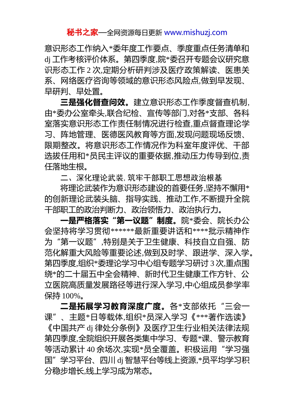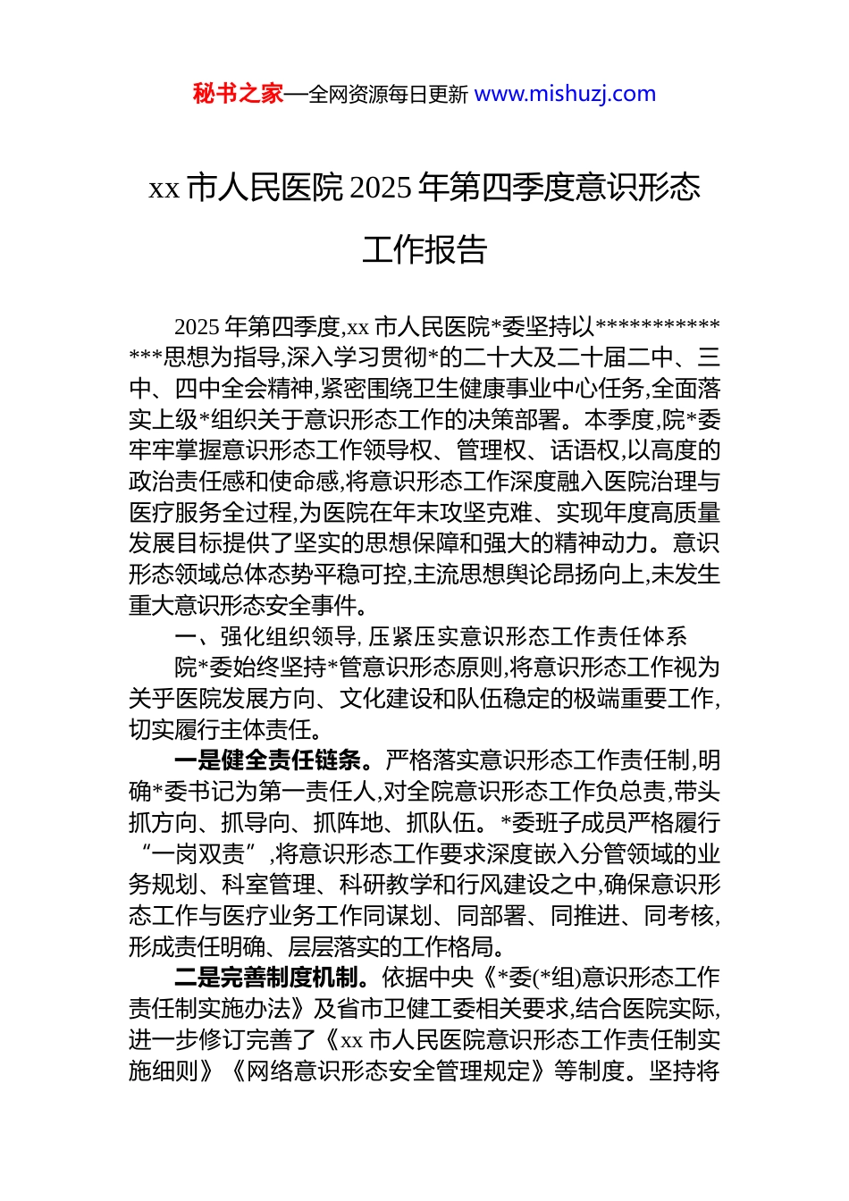 秘书之家—全网资源每日更新 www.mishuzj.comxx 市人民医院 2025 年第四季度意识形态工作报告2025 年第四季度,xx 市人民医院*委坚持以**************思想为指导,深入学习贯彻*的二十大及二十届二中、三中、四中全会精神,紧密围绕卫生健康事业中心任务,全面落实上级*组织关于意识形态工作的决策部署。本季度,院*委牢牢掌握意识形态工作领导权、管理权、话语权,以高度的政治责任感和使命感,将意识形态工作深度融入医院治理与医疗服务全过程,为医院在年末攻坚克难、实现年度高质量发展目标提供了坚实的思想保障和强大的精神动力。意识形态领域总体态势平稳可控,主流思想舆论昂扬向上,未发生重大意识形态安全事件。一、强化组织领导,压紧压实意识形态工作责任体系院*委始终坚持*管意识形态原则,将意识形态工作视为关乎医院发展方向、文化建设和队伍稳定的极端重要工作,切实履行主体责任。一是健全责任链条。严格落实意识形态工作责任制,明确*委书记为第一责任人,对全院意识形态工作负总责,带头抓方向、抓导向、抓阵地、抓队伍。*委班子成员严格履行“一岗双责”,将意识形态工作要求深度嵌入分管领域的业务规划、科室管理、科研教学和行风建设之中,确保意识形态工作与医疗业务工作同谋划、同部署、同推进、同考核,形成责任明确、层层落实的工作格局。二是完善制度机制。依据中央《*委(*组)意识形态工作责任制实施办法》及省市卫健工委相关要求,结合医院实际,进一步修订完善了《xx 市人民医院意识形态工作责任制实施细则》《网络意识形态安全管理规定》等制度。坚持将秘书之家—全网资源每日更新 www.mishuzj.com意识形态工作纳入*委年度工作要点、季度重点任务清单和dj 工作考核评价体系。第四季度,院*委召开专题会议研究意识形态工作 2 次,定期分析研判涉及医疗政策解读、医患关系、网络医疗咨询等领域的意识形态风险点,做到早发现、早研判、早处置。三是强化督查问效。建立意识形态工作季度督查机制,由*委办公室牵头,联合纪检、宣传等部门,对各*支部、各科室落实意识形态工作责任制情况进行检查,重点督查理论学习、阵地管理、医德医风教育等方面,发现问题现场反馈、限期整改。将意识形态工作情况作为科室年度评优、干部选拔任用和*员民主评议的重要依据,推动压力传导到位,责任落地生根。二、深化理论武装,筑牢干部职工思想政治根基将理论武装作为意识形态建设的首要任务,坚持不懈用*的创新理论武装头脑、指导实践、推动工作,不断提升全院干部职工的政治判断力、政治领悟力、政治执行力。一是严格落实“第一议题”制度。院*委会、院长办公会坚持将学习贯彻******最新重要讲话和****批示精神作为“第一议题”,特别是关于卫生健康、科技自立自强、防范化解重大风险等重要论述,做到及时学、跟进学、深入学。第四季度,组织*委理论学习中心组专题学习研讨 3 次,重点围绕*的二十届五中全会精神、新时代卫生健康工作方针、公立医院高质量发展路径等进行深入学习,中心组成员参学率保持 100%。二是拓展学习教育深度广度。各*支部依托“三会一课”、主题*日等载体,组织*员深入学习《***著作选读》《中国共产 dj 律处分条例》及医疗卫生行业相关法律法规第四季度,全院组织开展各类集中学习、专题*课、警示教育等活动累计 40 余场次,实现*员全覆盖。积极运用“学习强国”学习平台、四川 dj 智慧平台等线上资源,*员平均学习积分稳步增长,线上学习成为常态。秘书之家—全网资源每日更新 www.mishuzj.com三是推动学用结合与成果转化。引导干部职工将学习成果转化为提升医疗服务能力、改善患者就医体验的实际行动。围绕“提升急危重症救治能力”“优化门诊服务流程”“加强学科人才建设”等医院发展重点难点问题,院领导班子成员带头开展“1+1+n”模式调研,深入临床一线,形成问题清单、责任清单、任务清单,推动解决了一批患者关切和职工关心的实际问题,体现了理论指导实践的成效。三、加强阵地建设与管理,牢牢掌握意识形态主导权严格落实意识形态阵地管理责任,对院内各类思想文化阵地实行规范管理,确保可管可控,绝不给错误思想言论提供传播渠道。一是严格内部宣传阵地管理。对医院...