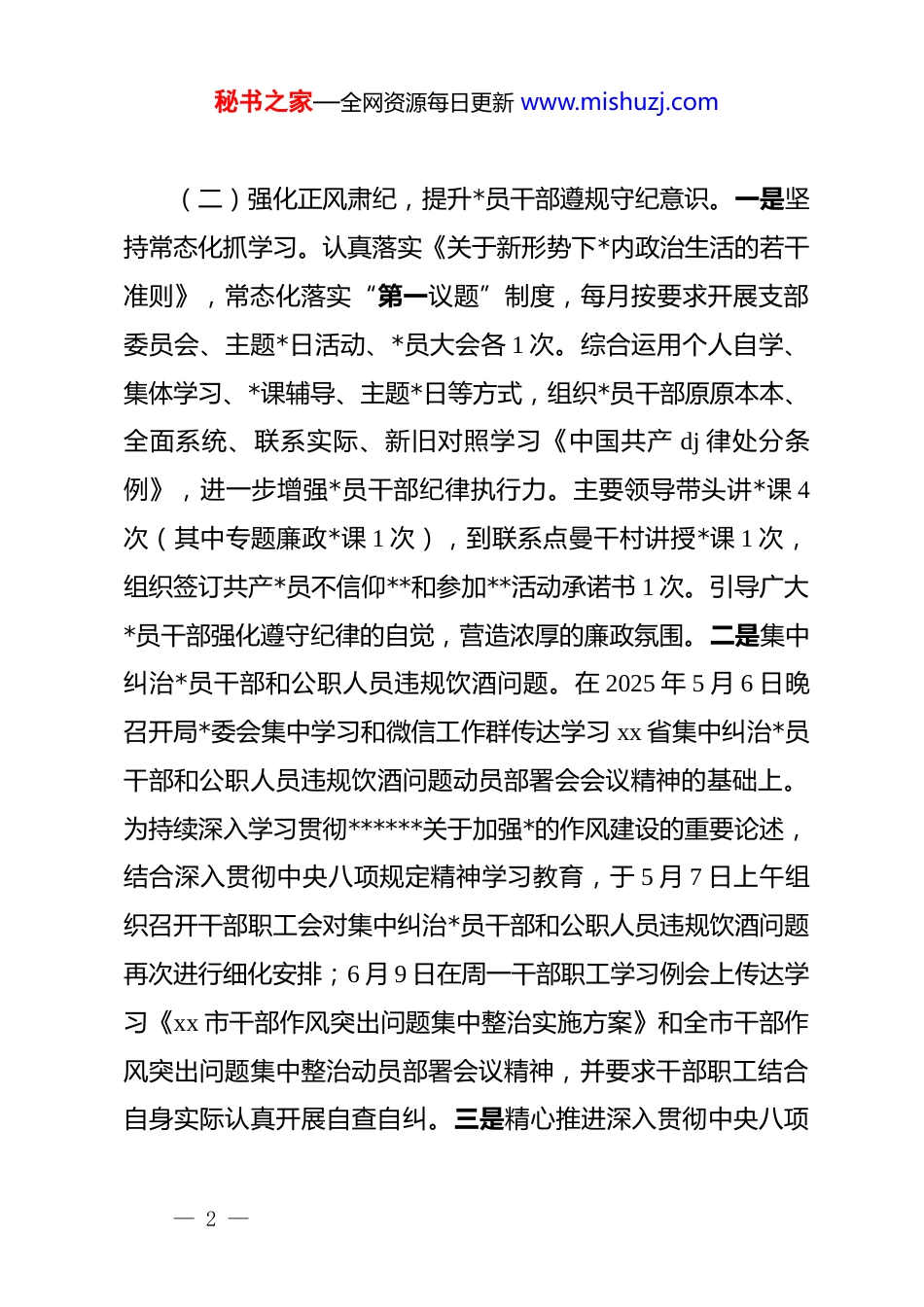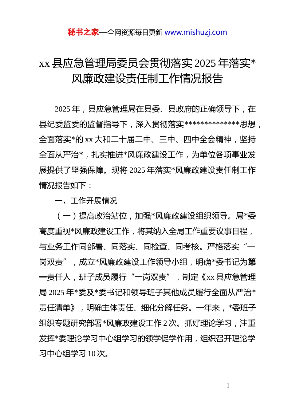 秘书之家—全网资源每日更新 www.mishuzj.comxx 县应急管理局委员会贯彻落实 2025 年落实*风廉政建设责任制工作情况报告2025 年,县应急管理局在县委、县政府的正确领导下,在县纪委监委的监督指导下,深入贯彻落实**************思想,全面落实*的 xx 大和二十届二中、三中、四中全会精神,坚持全面从严治*,扎实推进*风廉政建设工作,为单位各项事业发展提供了坚强保障。现将 2025 年落实*风廉政建设责任制工作情况报告如下:一、工作开展情况(一)提高政治站位,加强*风廉政建设组织领导。局*委高度重视*风廉政建设工作,将其纳入全局工作重要议事日程,与业务工作同部署、同落实、同检查、同考核。严格落实“一岗双责”,成立*风廉政建设工作领导小组,明确*委书记为第一责任人,班子成员履行“一岗双责”,制定《xx 县应急管理局 2025 年*委及*委书记和领导班子其他成员履行全面从严治*责任清单》,明确主体责任、细化分解任务。一年来,*委班子组织专题研究部署*风廉政建设工作 2 次。抓好理论学习,注重发挥*委理论学习中心组学习的领学促学作用,组织召开理论学习中心组学习 10 次。— 1 —秘书之家—全网资源每日更新 www.mishuzj.com(二)强化正风肃纪,提升*员干部遵规守纪意识。一是坚持常态化抓学习。认真落实《关于新形势下*内政治生活的若干准则》,常态化落实“第一议题”制度,每月按要求开展支部委员会、主题*日活动、*员大会各 1 次。综合运用个人自学、集体学习、*课辅导、主题*日等方式,组织*员干部原原本本、全面系统、联系实际、新旧对照学习《中国共产 dj 律处分条例》,进一步增强*员干部纪律执行力。主要领导带头讲*课 4次(其中专题廉政*课 1 次),到联系点曼干村讲授*课 1 次,组织签订共产*员不信仰**和参加**活动承诺书 1 次。引导广大*员干部强化遵守纪律的自觉,营造浓厚的廉政氛围。二是集中纠治*员干部和公职人员违规饮酒问题。在 2025 年 5 月 6 日晚召开局*委会集中学习和微信工作群传达学习 xx 省集中纠治*员干部和公职人员违规饮酒问题动员部署会会议精神的基础上。为持续深入学习贯彻******关于加强*的作风建设的重要论述,结合深入贯彻中央八项规定精神学习教育,于 5 月 7 日上午组织召开干部职工会对集中纠治*员干部和公职人员违规饮酒问题再次进行细化安排;6 月 9 日在周一干部职工学习例会上传达学习《xx 市干部作风突出问题集中整治实施方案》和全市干部作风突出问题集中整治动员部署会议精神,并要求干部职工结合自身实际认真开展自查自纠。三是精心推进深入贯彻中央八项— 2 —秘书之家—全网资源每日更新 www.mishuzj.com规定精神学习教育。及时组织*员干部深入学习中央八项规定及其实施细则精神,学习******关于加强*的作风建设的重要论述,引导*员干部深刻认识中央八项规定精神的重大意义,增强贯彻落实的思想自觉和行动自觉。利用*委理论学习中心组集中学习、*员大会、周一例会学习等会议及时传达学习上级文件精神和案例通报。2025 年 3 月 24 日召开*员大会,*委书记、局长邱兴喜同志传达学习了中央、省委和市委*的建设工作领导小组会议精神以及县委常委相关会议精神,并就我局开展深入贯彻中央八项规定精神学习教育作安排部署。4 月 14 日举办深入贯彻中央八项规定精神学习教育读书班暨*委理论学习中心组 2025 年第四次集中学习,局*委委员紧扣集中学习内容,并结合 2 个问题清单开展研讨发言。6 月 9 日举行*委理论学习中心组 2025 年第五次集中学习,局年轻干部列席旁听学习。6 月 23 日,召集局年轻干部围绕深入贯彻中央八项规定精神学习教育开展集中学习研讨。7 月 29 日组织全体干部职工到 xx 县廉洁教育基地参观,开展警示教育活动,深入学习领会******关于全面加强 d 的纪律建设的重要论述精神,推动深入贯彻中央八项规定精神学习教育走深走实。随后听取年轻干部问题整改情况。结束后全体*员回到局四楼会议室开展*性分析并组织开展 7 月份主题*日活动深入贯彻中央八项规定精神学习教育暨*风廉政建设专题*课。— 3 —秘书之家...