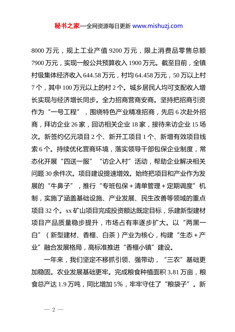 秘书之家—全网资源每日更新 www.mishuzj.comxx 镇 2025 年政府工作报告各位代表、同志们:根据会议安排,现在由我代表 xx 镇人民政府向大会报告工作,请予审议,并请列席的同志提出意见。一、2025 年工作和“十四五”时期发展回顾2025 年是全面实现“十四五”规划目标的冲刺之年,也是我镇在高质量发展道路上夯基垒台、积厚成势的关键一年。一年来,面对复杂多变的外部环境和艰巨繁重的发展任务,在县委、县政府和镇*委的坚强领导下,在镇人大的有力监督下,紧紧依靠全镇人民,坚持以**************思想为指导,全面贯彻*的 xx 大和二十届历次全会精神,深入贯彻******考察 xx 重要讲话精神,认真落实中央及省、市、县决策部署,积极应对经济下行压力,坚持稳中求进工作总基调,全面贯彻新发展理念,积极融入新发展格局,扎实推动高质量发展,实现了经济持续健康发展和社会大局和谐稳定,现代化美好 xx 建设迈出新步伐。一年来,我们坚定不移抓招引、建项目,镇域经济稳中提质。经济运行稳中向好。坚持发展为要,全力拼经济、拼项目、拼发展,经济运行稳中提质。预计全年累计完成固定资产投资— 1 —秘书之家—全网资源每日更新 www.mishuzj.com8000 万元,规上工业产值 9200 万元,限上消费品零售总额7900 万元,实现一般公共预算收入 1900 万元。截至目前,全镇村级集体经济收入 644.58 万元,村均 64.458 万元,50 万以上村7 个,其中 100 万元以上的村 2 个。城乡居民人均可支配收入增长实现与经济增长同步。全力招商营商安商。坚持把招商引资作为“一号工程”,围绕特色产业精准招商,先后 6 次赴外招商,拜访企业 26 家,回访相关企业 18 家,接待来访企业 15 场次。新签约亿元项目 2 个、新开工项目 1 个、新增有效项目线索 6 个。持续优化营商环境,落实领导干部包保企业制度,常态化开展“四送一服”“访企入村”活动,帮助企业解决相关问题 30 余件次。项目建设提速增效。始终把项目和产业作为发展的“牛鼻子”,推行“专班包保+清单管理+定期调度”机制,实施了涵盖基础设施、产业发展、民生改善等领域的重点项目 32 个。xx 矿山项目完成投资额达既定目标,乐建新型建材项目产品质量稳步提升,市场占有率逐步扩大。以“两黑一白”(新型建材、香榧、白茶)产业为核心,构建“生态+产业”融合发展格局,高标准推进“香榧小镇”建设。一年来,我们坚定不移抓引领、强带动,“三农”基础更加稳固。农业发展基础更牢。完成粮食种植面积 3.81 万亩,粮食总产达 1.9 万吨,同比增加 5%,牢牢守住了“粮袋子”。新— 2 —秘书之家—全网资源每日更新 www.mishuzj.com增土地流转大户 10 户,流转承包土地 2000 亩,新注册农业经营主体 5 家。稳步发展肉禽产业。全年共出栏生猪、牛羊 1.14万头,禽 18 万羽,禽蛋 450 吨。严格落实惠农政策,全年共发放各类农业补贴 576 万元,涉及新型农业经营主体 39 家,农户7600 户。农村改革深入推进,完成二轮延包面积确认 2.23 万亩,合同网签率达 99.92%。严守耕地保护红线。紧盯永久基本农田、耕地占补平衡,坚决遏制耕地“非农化”、防止“非粮化”。完成新增耕地复垦 3.98 亩,完成耕地恢复任务 66 亩。持续巩固省级森林城镇创建成果,森林覆盖率进一步提升。农村环境持续改善。完成 2024 年度省级中心村 xx 村 xx 中心村建设任务,加强已建成美丽乡村点的日常管护。农村改厕工作有序推进,完成 554 户厕所改建任务。深入开展“美丽家园,清洁有我”乡村清洁行动,建立常态化督查指导机制,农村人居环境得到显著改善。实施农村电网改造升级工程,农村生产生活条件不断优化。一年来我们坚定不移办实事、惠民生,社会事业全面进步监测帮扶精准到位。健全完善防止返贫动态监测和帮扶机制,新识别监测对象 4 户 15 人,通过精准帮扶实现风险消除 16 户55 人。申报自种自养项目奖补资金 236 户 52.35 万元,开发乡村公益性岗位 107 个,发放跨省就业交通补贴资金 798 人次— 3 —秘书之家—全网资源每日更新 www.mis...