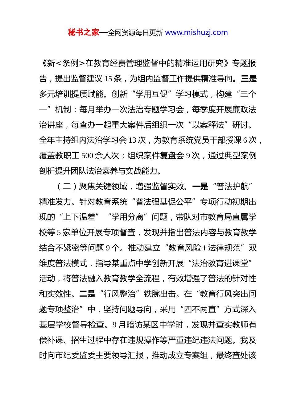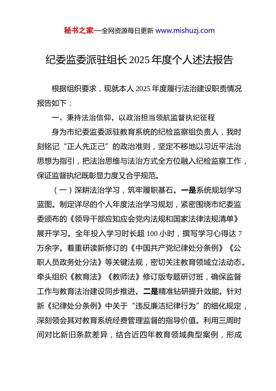 秘书之家—全网资源每日更新 www.mishuzj.com纪委监委派驻组长 2025 年度个人述法报告 根据组织要求,现就本人 2025 年度履行法治建设职责情况报告如下:一、秉持法治信仰,以政治担当领航监督执纪征程身为市纪委监委派驻教育系统的纪检监察组负责人,我时刻铭记“正人先正己”的政治准则,坚定不移地以习近平法治思想为指引,把法治思维与法治方式全方位融入纪检监察工作,保证监督执纪既彰显力度又合乎规范。(一)深耕法治学习,筑牢履职基石。一是系统规划学习蓝图。制定详尽的个人年度法治学习规划,紧密围绕市纪委监委颁布的《领导干部应知应会党内法规和国家法律法规清单》展开学习。全年投入学习时长超 100 小时,撰写学习心得达 7万余字。着重研读新修订的《中国共产党纪律处分条例》《公职人员政务处分法》等关键法规,密切关注教育领域立法动态。牵头组织《教育法》《教师法》修订版专题研讨班,确保监督工作与教育法治建设同步推进。二是精准钻研提升效能。针对新《纪律处分条例》中关于“违反廉洁纪律行为”的细化规定,深刻领会其对教育系统经费管理监督的指导价值。利用三周时间对比新旧条款差异,结合近四年教育领域典型案例,形成秘书之家—全网资源每日更新 www.mishuzj.com《新<条例>在教育经费管理监督中的精准运用研究》专题报告,提出监督建议 15 条,为组内监督工作提供精准导向。三是多元培训提质赋能。创新“学用互促”学习模式,构建“三个一”机制:每月举办一次法治专题学习会,每季度开展廉政法治讲座,每查办一起重大案件后组织一次“以案释法”研讨。全年主持组内法治学习会 13 次,为教育系统党员干部授课 6 次,覆盖教职工 500 余人次;组织案件复盘会 9 次,通过典型案例剖析提升团队法治素养与实战能力。(二)聚焦关键领域,增强监督实效。一是“普法护航”精准发力。针对教育系统“普法强基促公平”专项行动初期出现的“上下温差”“学用分离”问题,带队对市教育局直属学校等 5 家单位开展专项督查,发现并指出普法内容与教育教学结合不紧密等问题 9 个。推动建立“教育风险+法律规范”双维度普法模式,指导某重点中学创新开展“法治教育进课堂”活动,将普法融入教育教学全流程,有效增强了普法的针对性和实效性。二是“行风整治”铁腕出击。在“教育行风突出问题专项整治”中,坚持问题导向,采用“四不两直”方式深入基层学校督导检查。9 月暗访某区中学时,发现并查实教师有偿补课、招生过程中存在违规操作等严重违纪违法问题。我及时向市纪委监委主要领导汇报,推动成立专案组,最终查处该秘书之家—全网资源每日更新 www.mishuzj.com校 2 名教师和 1 名中层领导,形成强大震慑,推动全市教育行风显著改善。二、强化法治实践,以创新举措提升监督执纪水平(一)创新监督方式,拓展监督维度。一是科技赋能监督。引入大数据分析技术,对教育系统经费使用、招生录取等关键环节进行实时监测。建立教育领域廉政风险数据库,收集近五年教育系统违纪违法案例数据,通过数据分析精准定位廉政风险点。全年通过大数据分析发现异常数据线索 18 条,经核查立案查处 5 起,有效提升了监督的精准性和时效性。二是联动协作监督。加强与教育、审计、财政等部门的沟通协作,建立定期信息共享、线索移送、联合办案等工作机制。与市教育局联合开展教育项目专项检查,与审计部门共同对教育经费使用情况进行审计监督。全年与各部门联合开展检查 6 次,移送问题线索 10 条,形成监督合力,提升了监督效能。(二)严格案件查办,彰显法治权威。一是规范办案流程。严格遵循《中国共产党纪律检查机关监督执纪工作规则》《监察机关监督执法工作规定》等法规要求,规范案件受理、初核、立案、审查调查、审理等各个环节。建立案件质量评查机制,定期对已办结案件进行质量评查,发现问题及时整改。全年共查办案件 15 起,案件质量评查合格率达 100%。二是严肃责任秘书之家—全网资源每日更新 www.mishuzj.com追究。对违纪违法行为坚持“零容忍”态度,严肃追究相关人员责任。在查办某高校教师学术造假案件中,严格按照党...