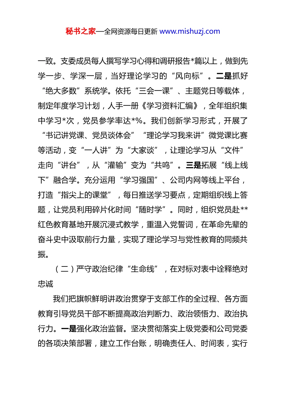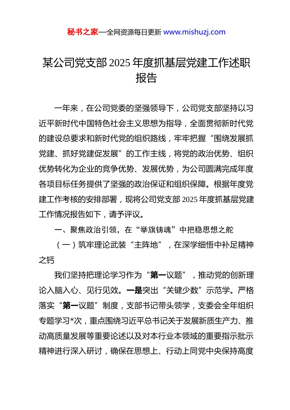 秘书之家—全网资源每日更新 www.mishuzj.com某公司党支部 2025 年度抓基层党建工作述职报告 一年来,在公司党委的坚强领导下,公司党支部坚持以习近平新时代中国特色社会主义思想为指导,全面贯彻新时代党的建设总要求和新时代党的组织路线,牢牢把握“围绕发展抓党建、抓好党建促发展”的工作主线,将党的政治优势、组织优势转化为企业的竞争优势、发展优势,为公司圆满完成年度各项目标任务提供了坚强的政治保证和组织保障。根据年度党建工作考核的安排部署,现将公司党支部 2025 年度抓基层党建工作情况报告如下,请予评议。一、聚焦政治引领,在“举旗铸魂”中把稳思想之舵(一)筑牢理论武装“主阵地”,在深学细悟中补足精神之钙我们坚持把理论学习作为“第一议题”,推动党的创新理论入脑入心、见行见效。一是突出“关键少数”示范学。严格落实“第一议题”制度,支部书记带头领学,支委会全年组织专题学习*次,重点围绕习近平总书记关于发展新质生产力、推动高质量发展等重要论述以及对本行业本领域的重要指示批示精神进行深入研讨,确保在思想上、行动上同党中央保持高度秘书之家—全网资源每日更新 www.mishuzj.com一致。支委成员每人撰写学习心得和调研报告*篇以上,做到先学一步、学深一层,当好理论学习的“风向标”。二是抓好“绝大多数”系统学。依托“三会一课”、主题党日等载体,制定年度学习计划,人手一册《学习资料汇编》,全年组织集中学习*次,党员参学率达*%。我们创新学习形式,开展了“书记讲党课、党员谈体会”“理论学习我来讲”微党课比赛等活动,变“一人讲”为“大家谈”,让理论学习从“文件”走向“讲台”,从“灌输”变为“共鸣”。三是拓展“线上线下”融合学。充分运用“学习强国”、公司内网等线上平台,打造“指尖上的课堂”,每日推送学习要点,定期组织线上答题,让党员利用碎片化时间“随时学”。同时,组织党员赴**红色教育基地开展沉浸式教学,重温入党誓词,在革命先辈的奋斗史中汲取前行力量,实现了理论学习与党性教育的同频共振。(二)严守政治纪律“生命线”,在对标对表中诠释绝对忠诚我们把旗帜鲜明讲政治贯穿于支部工作的全过程、各方面教育引导党员干部不断提高政治判断力、政治领悟力、政治执行力。一是强化政治监督。坚决贯彻落实上级党委和公司党委的各项决策部署,建立工作台账,明确责任人、时间表,实行秘书之家—全网资源每日更新 www.mishuzj.com销号管理,确保政令畅通、执行有力。针对公司年度*项重点任务,党支部逐一认领,将其作为检验党员政治成色的“试金石”和“赛马场”,确保公司决策部署在基层一线不折不扣落地。二是严肃党内政治生活。严格执行《关于新形势下党内政治生活的若干准则》,高质量开好组织生活会和民主评议党员大会。会前广泛征求意见*余条,会上支部书记带头开展批评与自我批评,真点问题、点真问题,达到了“红脸出汗、排毒治病”的效果。全年支部书记与党员谈心谈话*人次,及时掌握思想动态,做好一人一事的思想政治工作。三是净化政治生态。坚决抵制和反对个人主义、分散主义、自由主义等错误思想,教育引导党员在重大原则问题上立场坚定、旗帜鲜明。严格党员网络行为管理,要求党员在微信群、朋友圈等网络空间发挥正能量,不传播、不散布负面信息,自觉维护风清气正的良好政治生态。(三)唱响思想引导“主旋律”,在凝心聚力中汇聚发展正能量我们坚持党管宣传、党管意识形态,牢牢掌握意识形态工作领导权,为公司发展营造了良好的舆论氛围。一是建强宣传阵地。对支部宣传栏、党员活动室进行提档升级,打造了集学习、展示、交流于一体的党建文化墙。办好支部内部刊物《先秘书之家—全网资源每日更新 www.mishuzj.com锋号角》,全年刊发*期,宣传党的政策、报道支部动态、展示党员风采。二是选树先进典型。深入开展“向身边榜样学习”活动,挖掘在生产经营、技术创新等岗位上涌现出的党员先进事迹,评选出*名“党员先锋岗”和*个“党员示范团队”。通过事迹报告会、内网专栏等形式,大力宣传他们的感人故事,用身边事教育身边人,形成了“学先进、赶先进、当先进”的浓厚氛围...