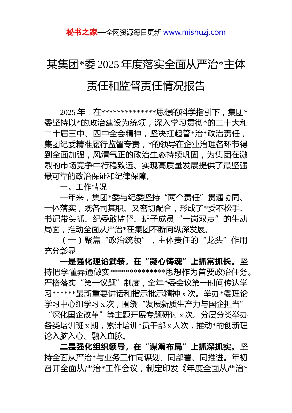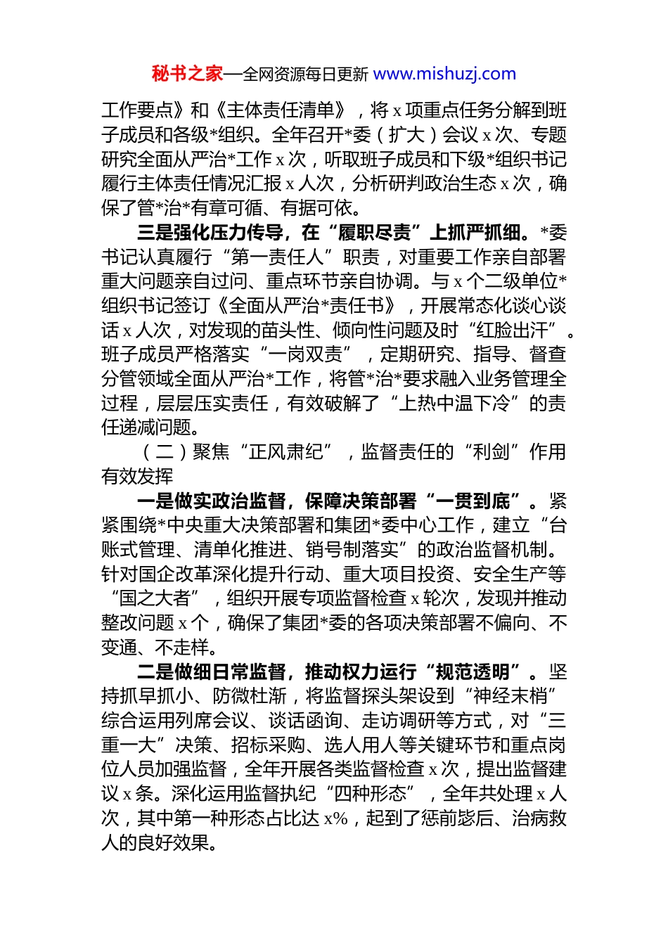 秘书之家—全网资源每日更新 www.mishuzj.com某集团*委 2025 年度落实全面从严治*主体责任和监督责任情况报告2025 年,在**************思想的科学指引下,集团*委坚持以*的政治建设为统领,深入学习贯彻*的二十大和二十届三中、四中全会精神,坚决扛起管*治*政治责任,集团纪委精准履行监督专责,*的领导在企业治理各环节得到全面加强,风清气正的政治生态持续巩固,为集团在激烈的市场竞争中行稳致远、实现高质量发展提供了最坚强最可靠的政治保证和纪律保障。一、工作情况一年来,集团*委与纪委坚持“两个责任”贯通协同、一体落实,既各司其职、又密切配合,形成了*委不松手、书记带头抓、纪委敢监督、班子成员“一岗双责”的生动局面,推动全面从严治*在集团不断向纵深发展。(一)聚焦“政治统领”,主体责任的“龙头”作用充分彰显一是强化理论武装,在“凝心铸魂”上抓常抓长。坚持把学懂弄通做实**************思想作为首要政治任务。严格落实“第一议题”制度,全年*委会议第一时间传达学习******最新重要讲话和指示批示精神 x 次。举办*委理论学习中心组学习 x 次,围绕“发展新质生产力与国企担当”“深化国企改革”等主题开展专题研讨 x 次。分层分类举办各类培训班 x 期,累计培训*员干部 x 人次,推动*的创新理论入脑入心、融入血脉。二是强化组织领导,在“谋篇布局”上抓深抓实。坚持全面从严治*与业务工作同谋划、同部署、同推进。年初召开全面从严治*工作会议,制定印发《年度全面从严治*秘书之家—全网资源每日更新 www.mishuzj.com工作要点》和《主体责任清单》,将 x 项重点任务分解到班子成员和各级*组织。全年召开*委(扩大)会议 x 次、专题研究全面从严治*工作 x 次,听取班子成员和下级*组织书记履行主体责任情况汇报 x 人次,分析研判政治生态 x 次,确保了管*治*有章可循、有据可依。三是强化压力传导,在“履职尽责”上抓严抓细。*委书记认真履行“第一责任人”职责,对重要工作亲自部署重大问题亲自过问、重点环节亲自协调。与 x 个二级单位*组织书记签订《全面从严治*责任书》,开展常态化谈心谈话 x 人次,对发现的苗头性、倾向性问题及时“红脸出汗”。班子成员严格落实“一岗双责”,定期研究、指导、督查分管领域全面从严治*工作,将管*治*要求融入业务管理全过程,层层压实责任,有效破解了“上热中温下冷”的责任递减问题。(二)聚焦“正风肃纪”,监督责任的“利剑”作用有效发挥一是做实政治监督,保障决策部署“一贯到底”。紧紧围绕*中央重大决策部署和集团*委中心工作,建立“台账式管理、清单化推进、销号制落实”的政治监督机制。针对国企改革深化提升行动、重大项目投资、安全生产等“国之大者”,组织开展专项监督检查 x 轮次,发现并推动整改问题 x 个,确保了集团*委的各项决策部署不偏向、不变通、不走样。二是做细日常监督,推动权力运行“规范透明”。坚持抓早抓小、防微杜渐,将监督探头架设到“神经末梢”综合运用列席会议、谈话函询、走访调研等方式,对“三重一大”决策、招标采购、选人用人等关键环节和重点岗位人员加强监督,全年开展各类监督检查 x 次,提出监督建议 x 条。深化运用监督执纪“四种形态”,全年共处理 x 人次,其中第一种形态占比达 x%,起到了惩前毖后、治病救人的良好效果。秘书之家—全网资源每日更新 www.mishuzj.com三是从严执纪问责,保持惩治腐败“高压态势”。坚持有案必查、有腐必惩,对违纪违法问题“零容忍”。全年共接收信访举报 x 件,处置问题线索 x 件,立案 x 件,给予 dj 政务处分 x 人,移送司法机关 x 人,为国家和企业挽回经济损失 x 万元。深刻剖析 x 起典型案件,拍摄制作警示教育片,在全集团范围内组织 x 场次警示教育大会,用身边事教育身边人,震慑常在。(三)聚焦“固本强基”,管*治*的“系统合力”全面形成一是筑牢组织堡垒,提升基层 dj“硬核实力”。深入实施“dj 强基”工程,对 x 个软弱涣散基层*组织进行集中整顿。严格落实“四同步、四对接”要求,确保*的组织和工作在新业务、新项目拓展中同步...