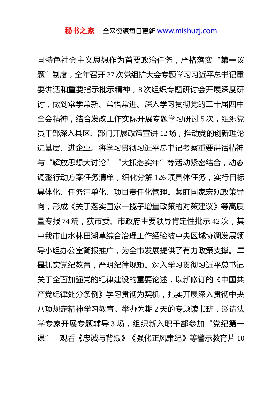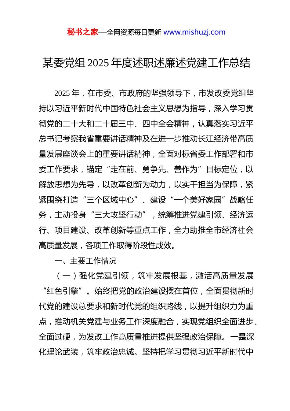 秘书之家—全网资源每日更新 www.mishuzj.com某委党组 2025 年度述职述廉述党建工作总结 2025 年,在市委、市政府的坚强领导下,市发改委党组坚持以习近平新时代中国特色社会主义思想为指导,深入学习贯彻党的二十大和二十届三中、四中全会精神,认真落实习近平总书记考察我省重要讲话精神及在进一步推动长江经济带高质量发展座谈会上的重要讲话精神,全面对标省委工作部署和市委工作要求,锚定“走在前、勇争先、善作为”目标定位,以解放思想为先导,以改革创新为动力,以实干担当为保障,紧紧围绕打造“三个区域中心”、建设“一个美好家园”战略任务,主动投身“三大攻坚行动”,统筹推进党建引领、经济运行、项目建设、改革创新等重点工作,全力助推全市经济社会高质量发展,各项工作取得阶段性成效。一、主要工作情况(一)强化党建引领,筑牢发展根基,激活高质量发展“红色引擎”。始终把党的政治建设摆在首位,全面贯彻新时代党的建设总要求和新时代党的组织路线,以提升组织力为重点,推动机关党建与业务工作深度融合,实现党组织全面进步、全面过硬,为发改工作高质量推进提供坚强政治保障。一是深化理论武装,筑牢政治忠诚。坚持把学习贯彻习近平新时代中秘书之家—全网资源每日更新 www.mishuzj.com国特色社会主义思想作为首要政治任务,严格落实“第一议题”制度,全年召开 37 次党组扩大会专题学习习近平总书记重要讲话和重要指示批示精神,8 次组织专题研讨会开展深度研讨,做到常学常新、常悟常进。深入学习贯彻党的二十届四中全会精神,结合发改工作实际开展专题学习研讨 5 次,组织党员干部深入县区、部门开展政策宣讲 12 场,推动党的创新理论进基层、进企业。将学习贯彻习近平总书记考察重要讲话精神与“解放思想大讨论”“大抓落实年”等活动紧密结合,动态调整行动方案任务清单,细化分解 126 项具体任务,实行目标具体化、任务清单化、项目责任化管理。紧盯国家宏观政策导向,形成《关于落实国家一揽子增量政策的对策建议》等高质量专报 74 篇,获市委、市政府主要领导肯定性批示 42 次,其中我市山水林田湖草综合治理工作经验被中央区域协调发展领导小组办公室简报推广,为全市发展提供了有力政策支撑。二是抓实党纪教育,严明纪律规矩。深入学习贯彻习近平总书记关于全面加强党的纪律建设的重要论述,以新修订的《中国共产党纪律处分条例》学习贯彻为契机,扎实开展深入贯彻中央八项规定精神学习教育。举办为期 2 天的专题读书班,邀请法学专家开展专题辅导 3 场,组织新入职干部参加“党纪第一课”,观看《忠诚与背叛》《强化正风肃纪》等警示教育片 10秘书之家—全网资源每日更新 www.mishuzj.com部,覆盖全委党员干部 800 余人次。“七一”前夕,邀请市政府分管领导讲授党纪教育专题党课,组织开展“学条例、守纪律、强担当”主题党日活动,推动党员干部学纪、知纪、明纪、守纪。建立纪律教育长效机制,将纪律教育融入日常工作,通过廉政谈话、案例通报等方式,常态化开展警示教育,全年开展纪律作风提醒谈话 156 人次,营造了崇廉尚洁的浓厚氛围。三是加强意识形态,筑牢思想阵地。严格落实意识形态工作责任制,将意识形态工作纳入党建考核、干部考核、民主生活会和组织生活会重要内容,全年专题研究意识形态工作 4 次,牢牢掌握意识形态工作领导权。精心运营“发改”微信公众号,发布政策解读、工作动态等权威信息 230 余条,阅读量突破 15万人次;高效办理“12345”政务服务热线、民生通道等平台诉求 320 余件,办结率和群众满意度均达 98%以上。加强对外宣传引导,精心策划“发改攻坚印记”系列报道,在市级以上媒体刊发稿件 86 篇,讲好发改故事、传播发改声音。严格落实信息发布“三审三校”制度,开展意识形态领域风险排查 6 次,及时化解苗头性、倾向性问题,确保意识形态领域安全稳定。四是建强干部队伍,提升履职能力。坚持党管干部原则,树立“不搞论资排辈、不搞平衡照顾、不唯推荐票数”的选人用人导向,选拔任用 18 名政治过硬、实绩突出的优秀干部,轮岗交秘书之家—全网资源每日更新 ww...