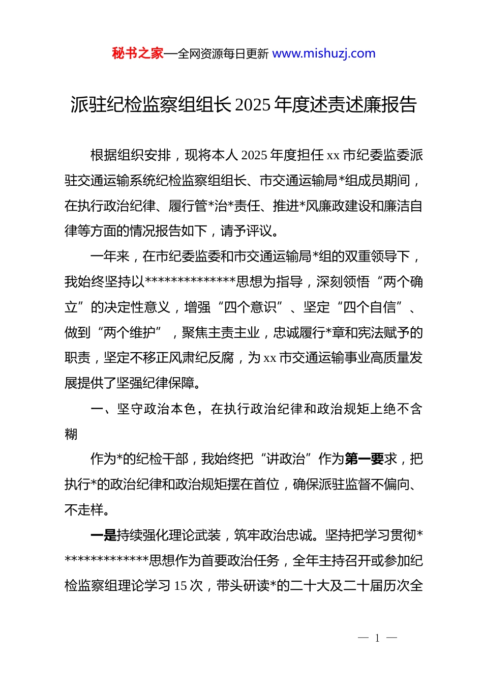 秘书之家—全网资源每日更新 www.mishuzj.com派驻纪检监察组组长 2025 年度述责述廉报告根据组织安排,现将本人 2025 年度担任 xx 市纪委监委派驻交通运输系统纪检监察组组长、市交通运输局*组成员期间,在执行政治纪律、履行管*治*责任、推进*风廉政建设和廉洁自律等方面的情况报告如下,请予评议。一年来,在市纪委监委和市交通运输局*组的双重领导下,我始终坚持以**************思想为指导,深刻领悟“两个确立”的决定性意义,增强“四个意识”、坚定“四个自信”、做到“两个维护”,聚焦主责主业,忠诚履行*章和宪法赋予的职责,坚定不移正风肃纪反腐,为 xx 市交通运输事业高质量发展提供了坚强纪律保障。一、坚守政治本色,在执行政治纪律和政治规矩上绝不含糊作为*的纪检干部,我始终把“讲政治”作为第一要求,把执行*的政治纪律和政治规矩摆在首位,确保派驻监督不偏向、不走样。一是持续强化理论武装,筑牢政治忠诚。坚持把学习贯彻**************思想作为首要政治任务,全年主持召开或参加纪检监察组理论学习 15 次,带头研读*的二十大及二十届历次全— 1 —秘书之家—全网资源每日更新 www.mishuzj.com会精神,深刻领会******关于全面从严治*、交通运输工作的重要论述。通过理论武装,不断提高政治判断力、政治领悟力、政治执行力,确保在思想上政治上行动上始终同以***同志为核心的*中央保持高度一致。二是深化政治监督,保障政令畅通。紧紧围绕*中央重大决策部署和省委、市委工作要求在交通运输系统的贯彻落实情况开展靶向监督。全年牵头组织对“xx 智慧交通一体化平台建设”、“xx 市域铁路 s1 线项目”等重大工程和重点任务开展专项政治监督检查 4 次,发现并推动整改贯彻落实不力、政策执行“打折扣”等问题 7 个,提出纪检监察建议 3 份,确保交通运输工作始终沿着正确的政治方向前进。我们强调,政治纪律是*的“六项纪律”中排在首位的,是维护*的团结统一、完成*的任务的根本保证,任何时候都不能有丝毫松懈。三是严肃*内政治生活,净化政治生态。协助局*组严格执行《关于新形势下*内政治生活的若干准则》,列席指导局*组及下级单位*组织民主生活会 12 次,对批评与自我批评“辣味”不足、查摆问题“避重就轻”等现象及时提醒纠正。坚决反对和抵制“七个有之”等问题,全年共处置违反政治纪律和政治规矩问题线索 2 件,对 1 名*员干部在网络上发表不当言论的行为进行了严肃处理,有力维护了*内政治生态的风清气正。— 2 —秘书之家—全网资源每日更新 www.mishuzj.com二、主动担当作为,在履行管*治*责任上绝不懈怠我深刻认识到,作为派驻纪检监察组组长,不仅要履行好监督责任,更要协助局*组扛起主体责任,推动“两个责任”同频共振、同向发力。一是协助压实主体责任。全年 4 次向局*组专题汇报全面从严治*工作形势,提出工作建议 10 余条,协助*组书记履行好“第一责任人”职责。推动建立健全管*治*责任清单,协助局*组与 32 个内设处室、下属单位“一把手”签订《2025 年度*风廉政建设责任书》,将责任逐级传导、压实到岗。通过推动“两个责任”贯通协同,形成了*委不松手、书记不甩手、纪委敢出手的良好局面。二是精准运用“四种形态”。坚持严管厚爱结合、激励约束并重,精准把握政策策略,把监督挺在前面。2025 年,全系统运用“四种形态”处理 118 人次。其中,运用第一种形态批评教育、谈话提醒 88 人次,占比 74.6%;运用第二种形态给予dj 轻处分和组织调整 20 人,占比 16.9%;运用第三种形态给予dj 重处分和重大职务调整 4 人,占比 3.4%;运用第四种形态严肃查处严重违纪违法涉嫌犯罪的 6 人,占比 5.1%。通过抓早抓小、防微杜渐,体现了组织对干部的严管与厚爱。三是加强制度建设和风险防控。着眼于权力运行的关键环— 3 —秘书之家—全网资源每日更新 www.mishuzj.com节,协助局*组对交通项目招投标、行政审批、大宗物资采购等高风险领域进行廉政风险再排查,新识别和更新风险点 45 个。推动出台《xx 市交通运输局关于加强工程建设项目廉洁风险防控的实施办法》等制度 3 ...