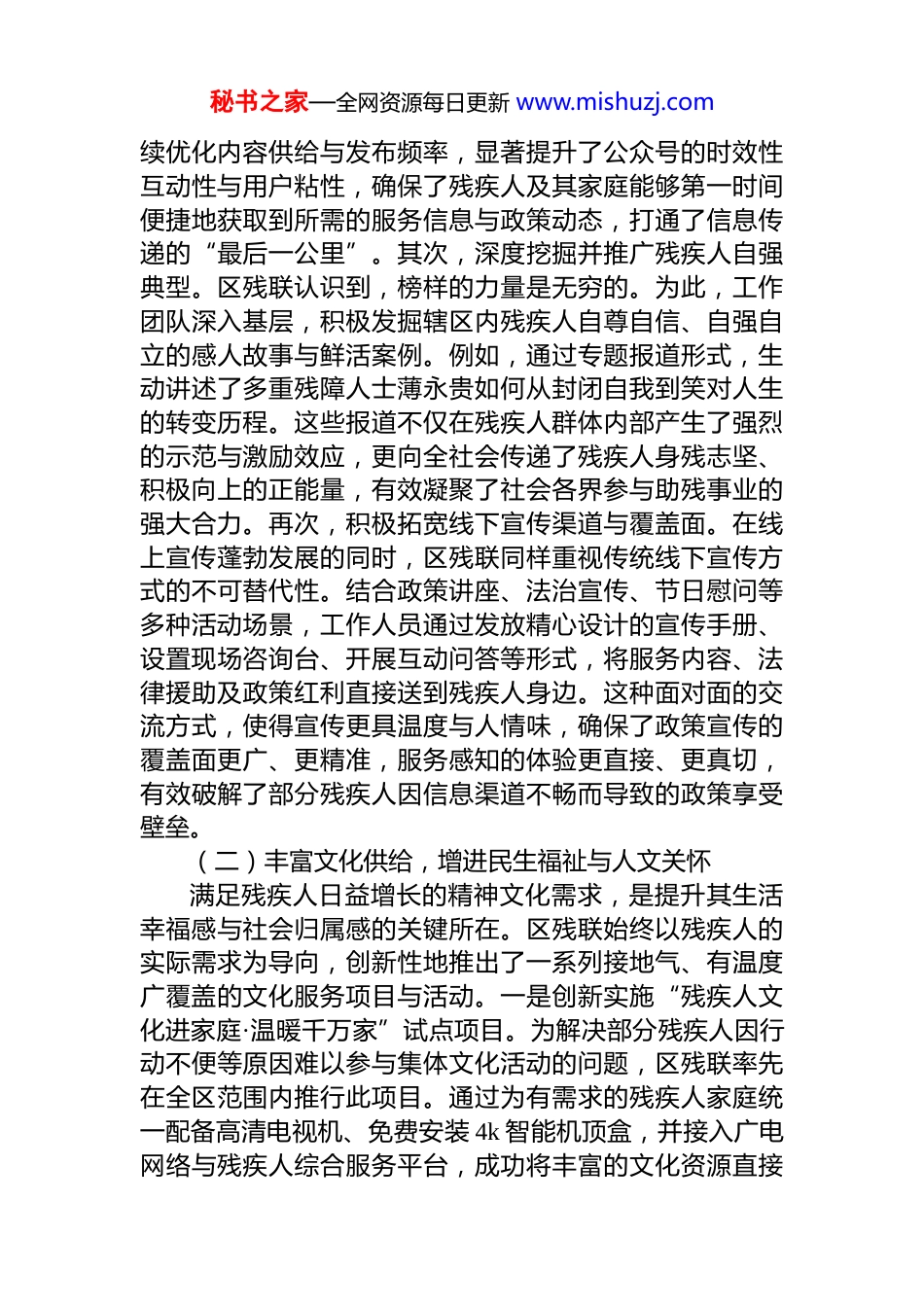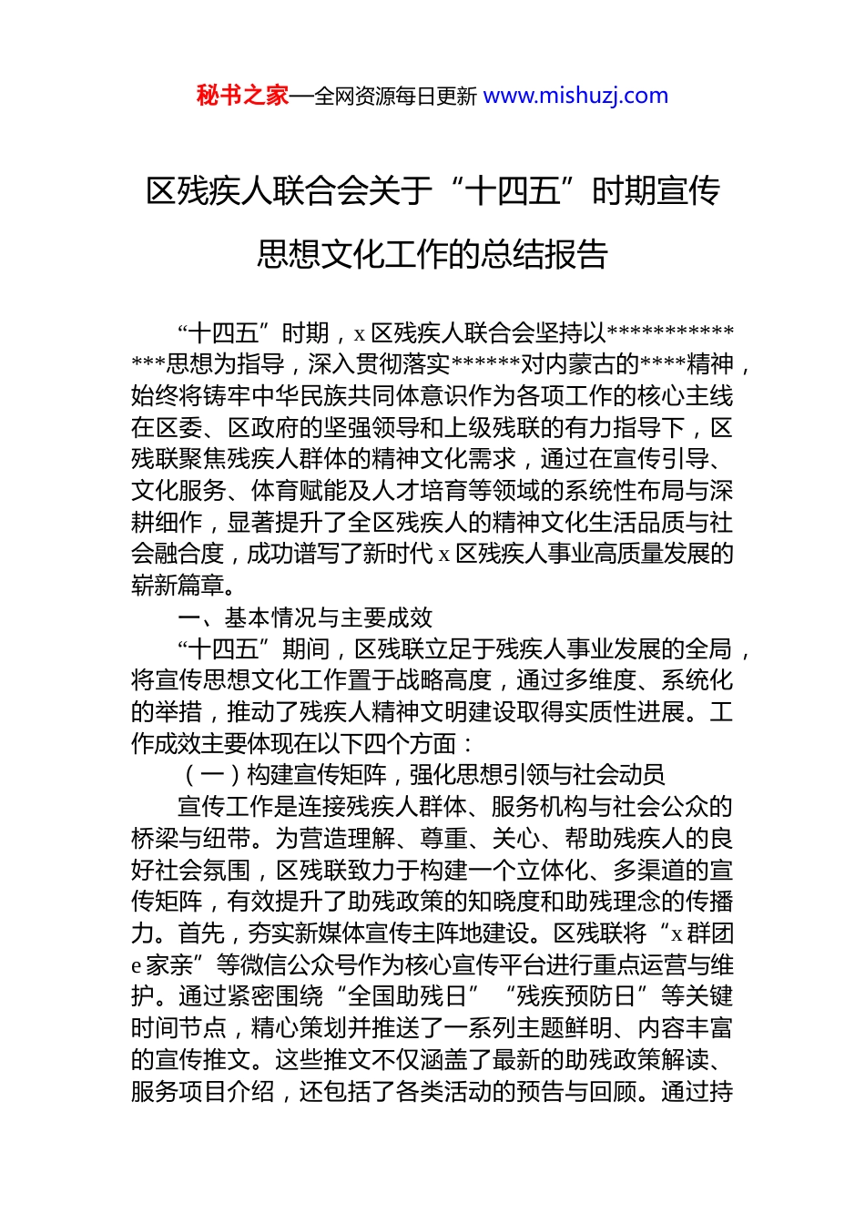 秘书之家—全网资源每日更新 www.mishuzj.com区残疾人联合会关于“十四五”时期宣传思想文化工作的总结报告“十四五”时期,x 区残疾人联合会坚持以**************思想为指导,深入贯彻落实******对内蒙古的****精神,始终将铸牢中华民族共同体意识作为各项工作的核心主线在区委、区政府的坚强领导和上级残联的有力指导下,区残联聚焦残疾人群体的精神文化需求,通过在宣传引导、文化服务、体育赋能及人才培育等领域的系统性布局与深耕细作,显著提升了全区残疾人的精神文化生活品质与社会融合度,成功谱写了新时代 x 区残疾人事业高质量发展的崭新篇章。一、基本情况与主要成效“十四五”期间,区残联立足于残疾人事业发展的全局,将宣传思想文化工作置于战略高度,通过多维度、系统化的举措,推动了残疾人精神文明建设取得实质性进展。工作成效主要体现在以下四个方面:(一)构建宣传矩阵,强化思想引领与社会动员宣传工作是连接残疾人群体、服务机构与社会公众的桥梁与纽带。为营造理解、尊重、关心、帮助残疾人的良好社会氛围,区残联致力于构建一个立体化、多渠道的宣传矩阵,有效提升了助残政策的知晓度和助残理念的传播力。首先,夯实新媒体宣传主阵地建设。区残联将“x 群团e 家亲”等微信公众号作为核心宣传平台进行重点运营与维护。通过紧密围绕“全国助残日”“残疾预防日”等关键时间节点,精心策划并推送了一系列主题鲜明、内容丰富的宣传推文。这些推文不仅涵盖了最新的助残政策解读、服务项目介绍,还包括了各类活动的预告与回顾。通过持秘书之家—全网资源每日更新 www.mishuzj.com续优化内容供给与发布频率,显著提升了公众号的时效性互动性与用户粘性,确保了残疾人及其家庭能够第一时间便捷地获取到所需的服务信息与政策动态,打通了信息传递的“最后一公里”。其次,深度挖掘并推广残疾人自强典型。区残联认识到,榜样的力量是无穷的。为此,工作团队深入基层,积极发掘辖区内残疾人自尊自信、自强自立的感人故事与鲜活案例。例如,通过专题报道形式,生动讲述了多重残障人士薄永贵如何从封闭自我到笑对人生的转变历程。这些报道不仅在残疾人群体内部产生了强烈的示范与激励效应,更向全社会传递了残疾人身残志坚、积极向上的正能量,有效凝聚了社会各界参与助残事业的强大合力。再次,积极拓宽线下宣传渠道与覆盖面。在线上宣传蓬勃发展的同时,区残联同样重视传统线下宣传方式的不可替代性。结合政策讲座、法治宣传、节日慰问等多种活动场景,工作人员通过发放精心设计的宣传手册、设置现场咨询台、开展互动问答等形式,将服务内容、法律援助及政策红利直接送到残疾人身边。这种面对面的交流方式,使得宣传更具温度与人情味,确保了政策宣传的覆盖面更广、更精准,服务感知的体验更直接、更真切,有效破解了部分残疾人因信息渠道不畅而导致的政策享受壁垒。(二)丰富文化供给,增进民生福祉与人文关怀满足残疾人日益增长的精神文化需求,是提升其生活幸福感与社会归属感的关键所在。区残联始终以残疾人的实际需求为导向,创新性地推出了一系列接地气、有温度广覆盖的文化服务项目与活动。一是创新实施“残疾人文化进家庭·温暖千万家”试点项目。为解决部分残疾人因行动不便等原因难以参与集体文化活动的问题,区残联率先在全区范围内推行此项目。通过为有需求的残疾人家庭统一配备高清电视机、免费安装 4k 智能机顶盒,并接入广电网络与残疾人综合服务平台,成功将丰富的文化资源直接秘书之家—全网资源每日更新 www.mishuzj.com输送到残疾人家中。这一举措不仅极大地丰富了他们的居家文化生活,也体现了公共文化服务向精细化、个性化方向发展的趋势。二是扎实推进“五个一”文化品牌项目。该项目旨在通过组织“读一本书、看一次电影、游一次园参观一次展览、参加一次社区文化活动”,鼓励和帮助残疾人走出家门,主动融入社会大家庭,亲身感受社会文明的进步与经济发展的成果。同时,依托“温馨家园”等社区服务阵地,定期组织读书分享会、公益观影日等活动,为残疾人搭建起一个交流思想、分享快乐的精神家园,有效促进了他们的社会交往与心理...