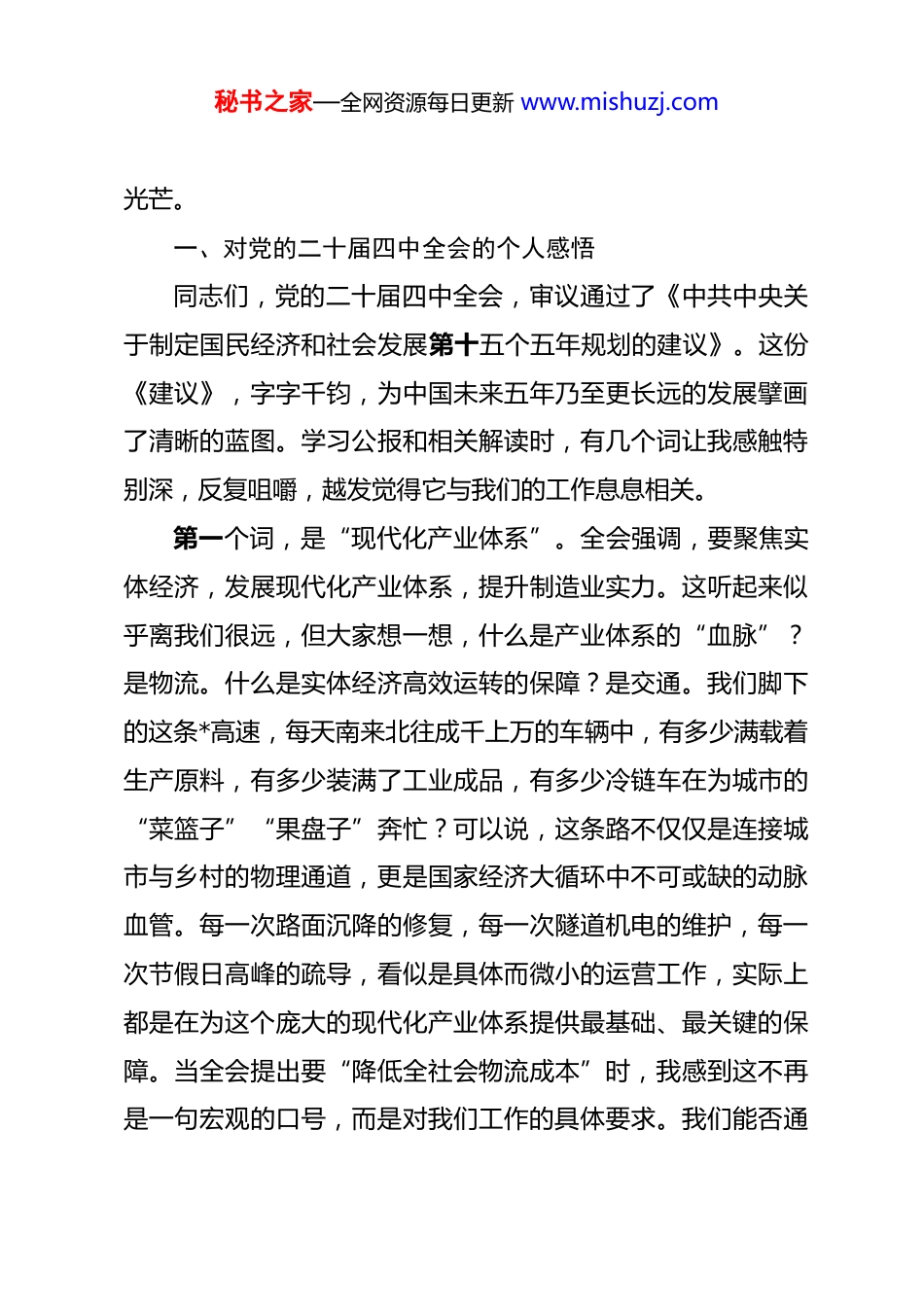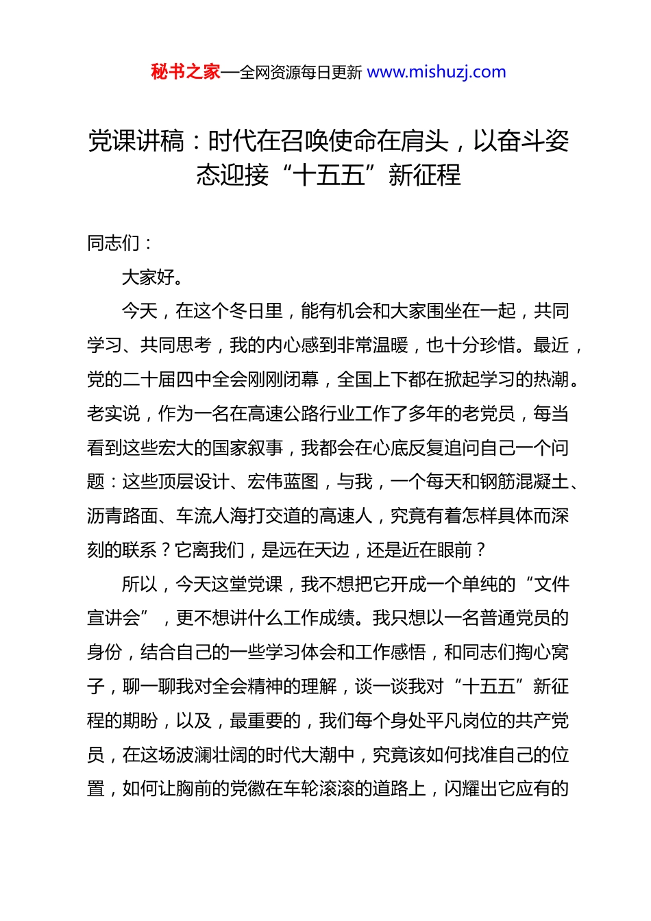 秘书之家—全网资源每日更新 www.mishuzj.com党课讲稿:时代在召唤使命在肩头,以奋斗姿态迎接“十五五”新征程 同志们:大家好。今天,在这个冬日里,能有机会和大家围坐在一起,共同学习、共同思考,我的内心感到非常温暖,也十分珍惜。最近,党的二十届四中全会刚刚闭幕,全国上下都在掀起学习的热潮。老实说,作为一名在高速公路行业工作了多年的老党员,每当看到这些宏大的国家叙事,我都会在心底反复追问自己一个问题:这些顶层设计、宏伟蓝图,与我,一个每天和钢筋混凝土、沥青路面、车流人海打交道的高速人,究竟有着怎样具体而深刻的联系?它离我们,是远在天边,还是近在眼前?所以,今天这堂党课,我不想把它开成一个单纯的“文件宣讲会”,更不想讲什么工作成绩。我只想以一名普通党员的身份,结合自己的一些学习体会和工作感悟,和同志们掏心窝子,聊一聊我对全会精神的理解,谈一谈我对“十五五”新征程的期盼,以及,最重要的,我们每个身处平凡岗位的共产党员,在这场波澜壮阔的时代大潮中,究竟该如何找准自己的位置,如何让胸前的党徽在车轮滚滚的道路上,闪耀出它应有的秘书之家—全网资源每日更新 www.mishuzj.com光芒。一、对党的二十届四中全会的个人感悟同志们,党的二十届四中全会,审议通过了《中共中央关于制定国民经济和社会发展第十五个五年规划的建议》。这份《建议》,字字千钧,为中国未来五年乃至更长远的发展擘画了清晰的蓝图。学习公报和相关解读时,有几个词让我感触特别深,反复咀嚼,越发觉得它与我们的工作息息相关。第一个词,是“现代化产业体系”。全会强调,要聚焦实体经济,发展现代化产业体系,提升制造业实力。这听起来似乎离我们很远,但大家想一想,什么是产业体系的“血脉”?是物流。什么是实体经济高效运转的保障?是交通。我们脚下的这条*高速,每天南来北往成千上万的车辆中,有多少满载着生产原料,有多少装满了工业成品,有多少冷链车在为城市的“菜篮子”“果盘子”奔忙?可以说,这条路不仅仅是连接城市与乡村的物理通道,更是国家经济大循环中不可或缺的动脉血管。每一次路面沉降的修复,每一次隧道机电的维护,每一次节假日高峰的疏导,看似是具体而微小的运营工作,实际上都是在为这个庞大的现代化产业体系提供最基础、最关键的保障。当全会提出要“降低全社会物流成本”时,我感到这不再是一句宏观的口号,而是对我们工作的具体要求。我们能否通秘书之家—全网资源每日更新 www.mishuzj.com过更科学的管理、更智能的技术,让货车通行更有效率?能否通过更精准的养护,减少因道路施工造成的拥堵?这些问题的答案,就藏在我们日常工作的点点滴滴里,直接关系到一部手机、一箱水果、一台机器从工厂到用户手中的时间与成本。第二个词,是“交通强国”。这个词已经不是第一次提出了,但这次全会将其放在了构建现代化产业体系、完善现代化基础设施体系的突出位置。这标志着交通的先行官地位被提到了一个前所未有的战略高度。我看到解读文章里说,我国已经建成了全球最大的高速铁路网和高速公路网。每当读到这里,自豪感油然而生。但紧接着,我感到的是更沉甸甸的责任。全会进一步提出要“完善现代化综合交通运输体系”,强调“互联互通、协同融合、安全高效”。这意味着什么?意味着“建成”只是第一步,“建好、管好、养好、运营好”才是永无止境的追求。我们*高速,作为贵州乃至国家高速路网的重要一环,不再是一个孤立的路段,而是整个“国家综合立体交通网”的一个神经末梢。我们的管理水平、服务质量、应急能力,直接影响着整个路网的运行效率和韧性。这就要求我们的眼光必须超越脚下这百十公里的路,要时刻思考如何与铁路、航空、水运更好地衔接,如何在区域协同发展中扮演更积极的角色。第三个词,是“人民至上”。全会公报中,人民的获得感、秘书之家—全网资源每日更新 www.mishuzj.com幸福感、安全感是贯穿始终的主线。对于我们高速人而言,“人民”二字,具体而生动。他们是长途跋涉归心似箭的游子,是节假日满怀期待举家出游的家庭,是分秒必争运送货物的卡车司机,是每一个在路上遇到困难需要帮助的司乘...