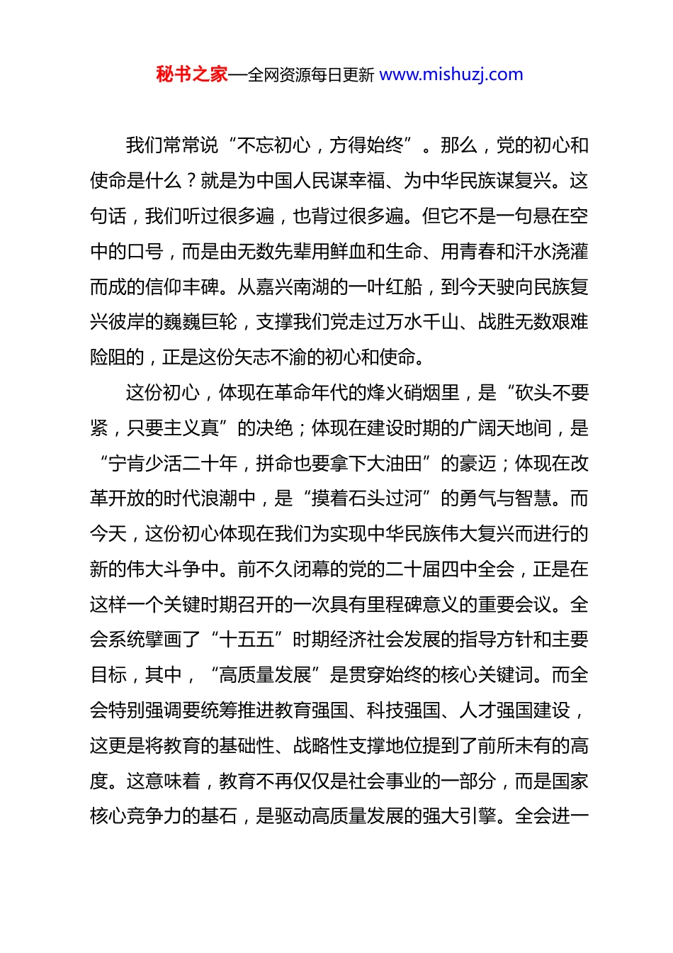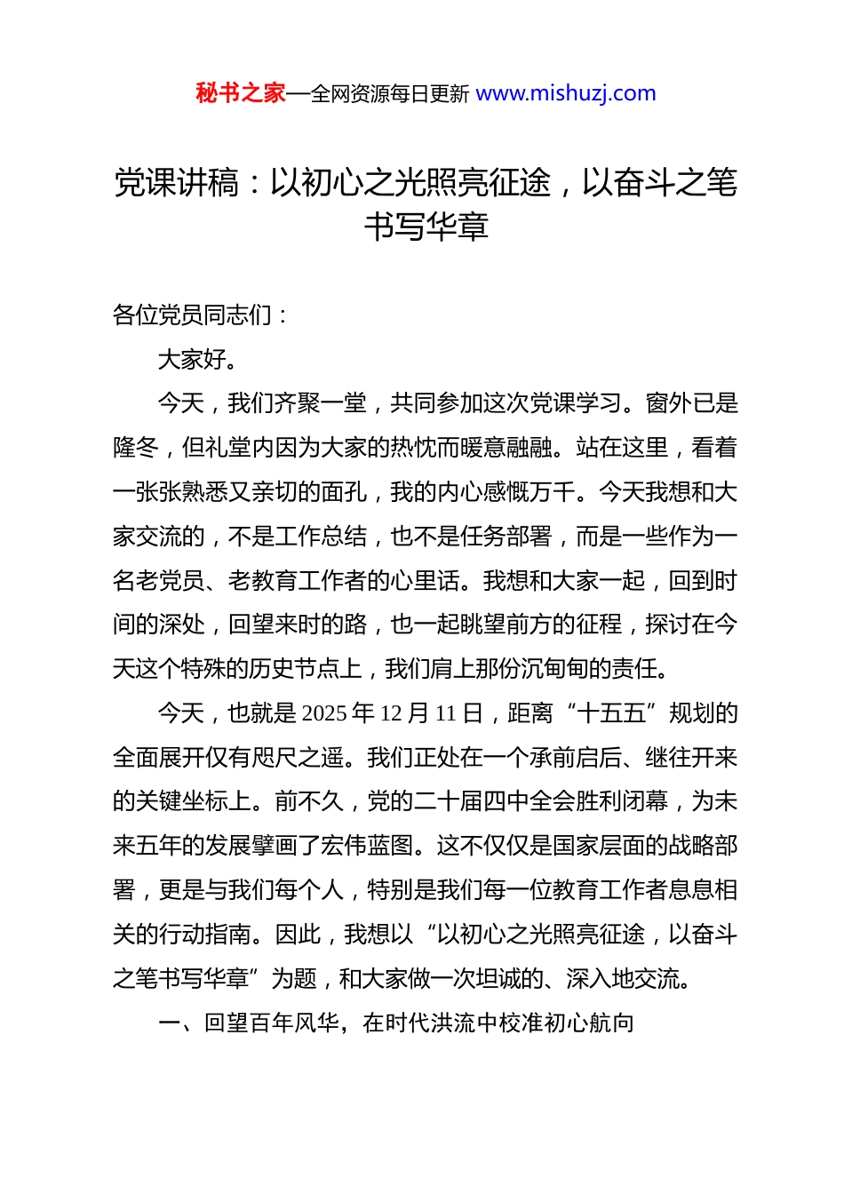 秘书之家—全网资源每日更新 www.mishuzj.com党课讲稿:以初心之光照亮征途,以奋斗之笔书写华章 各位党员同志们:大家好。今天,我们齐聚一堂,共同参加这次党课学习。窗外已是隆冬,但礼堂内因为大家的热忱而暖意融融。站在这里,看着一张张熟悉又亲切的面孔,我的内心感慨万千。今天我想和大家交流的,不是工作总结,也不是任务部署,而是一些作为一名老党员、老教育工作者的心里话。我想和大家一起,回到时间的深处,回望来时的路,也一起眺望前方的征程,探讨在今天这个特殊的历史节点上,我们肩上那份沉甸甸的责任。今天,也就是 2025 年 12 月 11 日,距离“十五五”规划的全面展开仅有咫尺之遥。我们正处在一个承前启后、继往开来的关键坐标上。前不久,党的二十届四中全会胜利闭幕,为未来五年的发展擘画了宏伟蓝图。这不仅仅是国家层面的战略部署,更是与我们每个人,特别是我们每一位教育工作者息息相关的行动指南。因此,我想以“以初心之光照亮征途,以奋斗之笔书写华章”为题,和大家做一次坦诚的、深入地交流。一、回望百年风华,在时代洪流中校准初心航向秘书之家—全网资源每日更新 www.mishuzj.com我们常常说“不忘初心,方得始终”。那么,党的初心和使命是什么?就是为中国人民谋幸福、为中华民族谋复兴。这句话,我们听过很多遍,也背过很多遍。但它不是一句悬在空中的口号,而是由无数先辈用鲜血和生命、用青春和汗水浇灌而成的信仰丰碑。从嘉兴南湖的一叶红船,到今天驶向民族复兴彼岸的巍巍巨轮,支撑我们党走过万水千山、战胜无数艰难险阻的,正是这份矢志不渝的初心和使命。这份初心,体现在革命年代的烽火硝烟里,是“砍头不要紧,只要主义真”的决绝;体现在建设时期的广阔天地间,是“宁肯少活二十年,拼命也要拿下大油田”的豪迈;体现在改革开放的时代浪潮中,是“摸着石头过河”的勇气与智慧。而今天,这份初心体现在我们为实现中华民族伟大复兴而进行的新的伟大斗争中。前不久闭幕的党的二十届四中全会,正是在这样一个关键时期召开的一次具有里程碑意义的重要会议。全会系统擘画了“十五五”时期经济社会发展的指导方针和主要目标,其中,“高质量发展”是贯穿始终的核心关键词。而全会特别强调要统筹推进教育强国、科技强国、人才强国建设,这更是将教育的基础性、战略性支撑地位提到了前所未有的高度。这意味着,教育不再仅仅是社会事业的一部分,而是国家核心竞争力的基石,是驱动高质量发展的强大引擎。全会进一秘书之家—全网资源每日更新 www.mishuzj.com步提出要“办好人民满意的教育”,这六个字分量极重。它深刻揭示了我们教育事业的政治属性、人民属性和战略属性。政治属性,要求我们必须坚持党对教育工作的全面领导,确保立德树人根本任务落到实处。人民属性,要求我们必须坚持以人民为中心,聚焦教育公平与质量提升,努力破解教育发展中的不平衡不充分问题。战略属性,则要求我们的教育必须服务于国家发展的宏伟蓝图,为“十五五”规划的顺利实施、为到2035 年基本实现社会主义现代化培养一代又一代的建设者和接班人。可以说,党的二十届四中全会为我们教育工作者划定了新时代的航道。这条航道的目标,是更加公平、更高质量的教育;这条航道的罗盘,是党中央的决策部署;而驱动我们前行的根本动力,依然是我们共产党人那颗为人民服务的初心。理解了这一点,我们就明白了自己工作的意义,就不再会把教书看作一份简单的职业,而是会将其视为一项神圣的事业,一项与国家命运、民族未来紧密相连的伟大事业。二、躬身三十余载,在教书育人中感悟初心温度理论的光芒,最终要照进现实。宏大的叙事,也要落脚于个体的生命体验。谈到初心,我也时常回想起自己走上三尺讲台的那一天。算起来,我从事教育工作已经三十多年了。从一个刚走出校门、面对学生会脸红的“稚嫩学生”,一步步成长秘书之家—全网资源每日更新 www.mishuzj.com为一名教师、班主任、年级主任,再到走上管理岗位这一路走来,是学校培养了我,是孩子们成就了我。我至今还清晰地记得自己经历的许许多多个“第一次”:第一次备课到深夜,对着镜子反复演练;第一次...